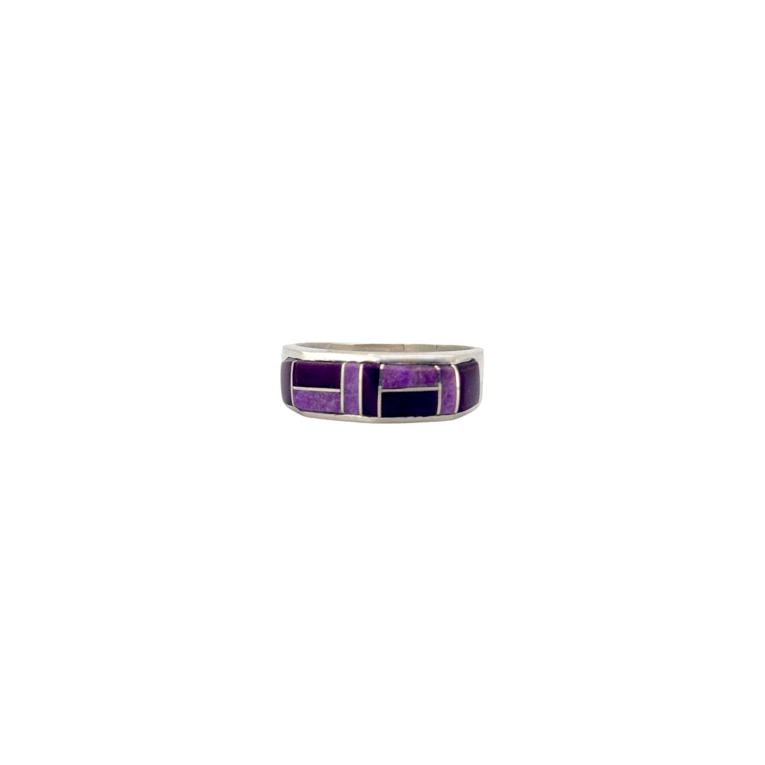 This Navajo handmade ring by artisan Arnold Yazzie features a stunning inlay of rich sugilite, showcasing deep purples and lighter lavender tones. Each stone segment is precisely cut and expertly set within a sleek sterling silver band. The clean geometric arrangement highlights Yazzie’s meticulous craftsmanship and modern inlay style. Smooth edges and a balanced profile make it comfortable for daily wear while still offering a bold, artistic statement. Unique and vibrant, this piece beautifully merges contemporary design with traditional Navajo silversmithing skill.