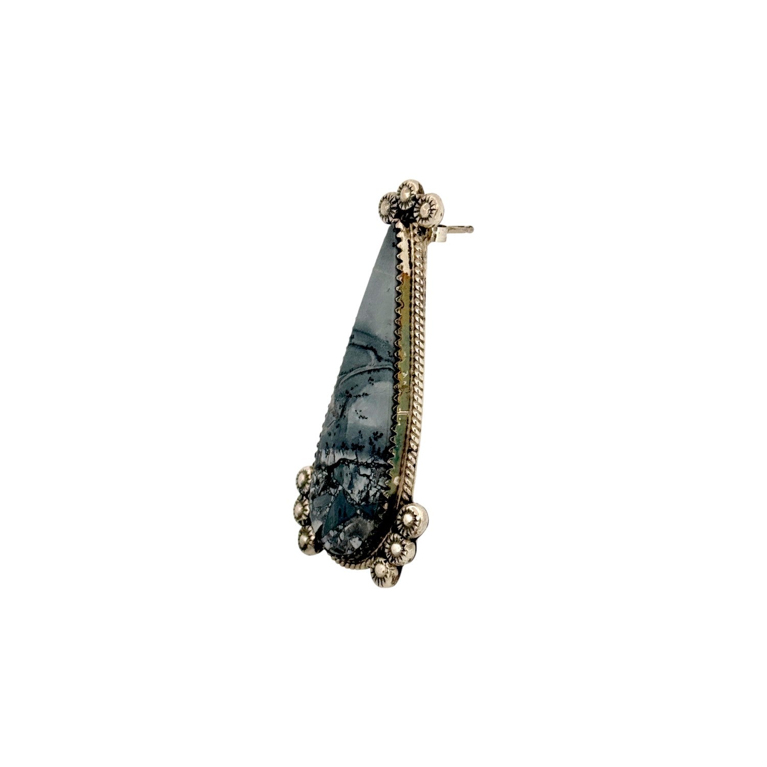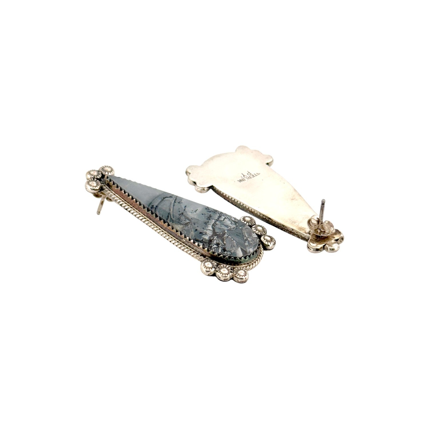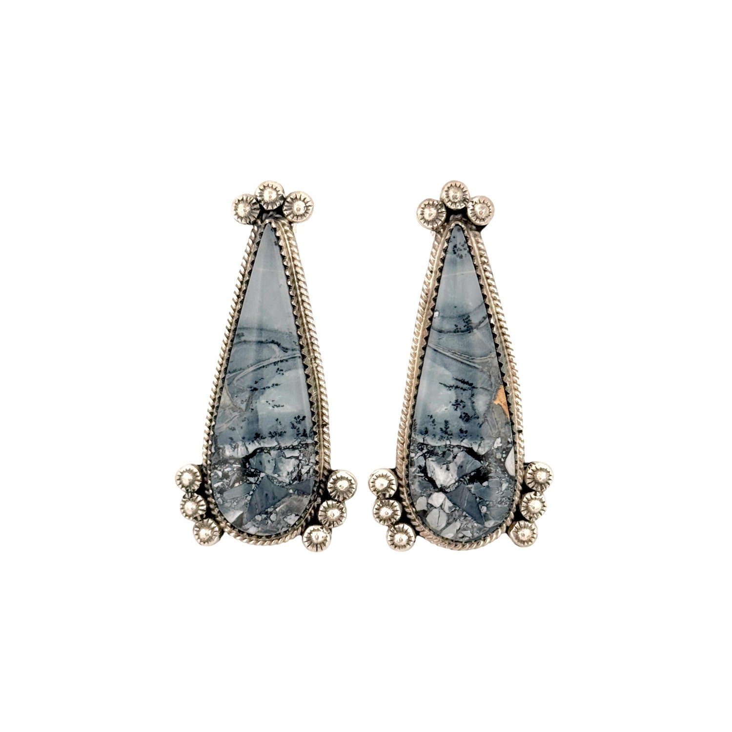 These elegant earrings by Navajo artist Phillip Yazzie feature the natural beauty of Jasper, each stone showcasing intricate, landscape-like patterns in soft gray and black tones. Expertly set in sterling silver, the teardrop-shaped stones are framed with a twisted rope border, highlighting their organic depth and texture. Delicate silver beadwork accents the top and bottom of each earring, adding dimension and traditional Navajo detailing. The subtle color palette and refined design make these earrings versatile for both casual and formal wear. Handcrafted with precision and care, they reflect the timeless artistry and spirit of Navajo silversmithing.