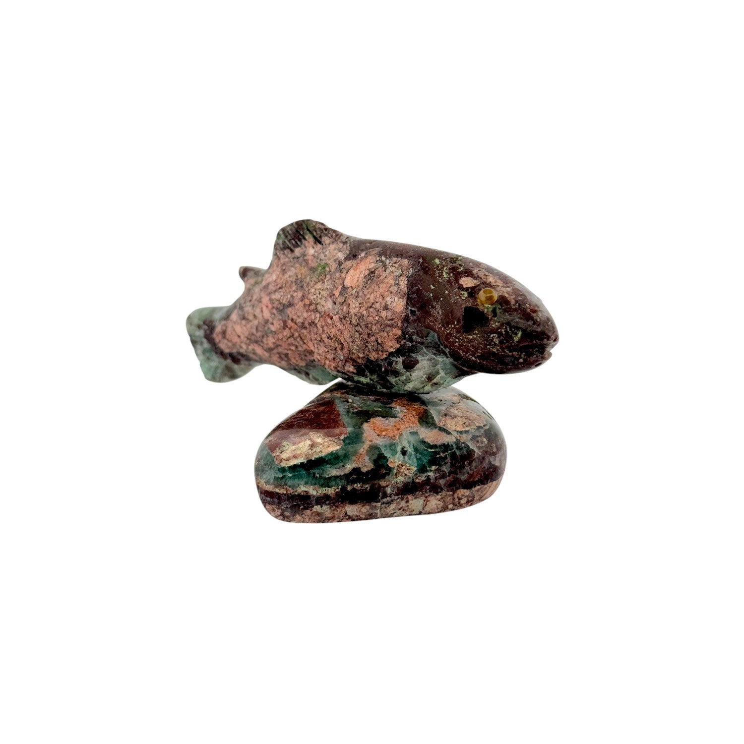 This Zuni hand-carved Fish Fetish is sculpted from richly colored fluorite, displaying captivating swirls of deep green, earthy red, and soft plum tones throughout the stone. The fish is gracefully poised atop a matching fluorite base, creating a sense of movement as if gliding through water. A warm citrine inlay forms the eye, adding a golden accent that beautifully complements the stone’s natural palette. The smooth polish enhances the translucence and depth of the fluorite, highlighting its organic patterns and subtle variations. Symbolizing abundance, adaptability, and harmony with life’s currents, this piece is a striking example of traditional Zuni carving artistry.