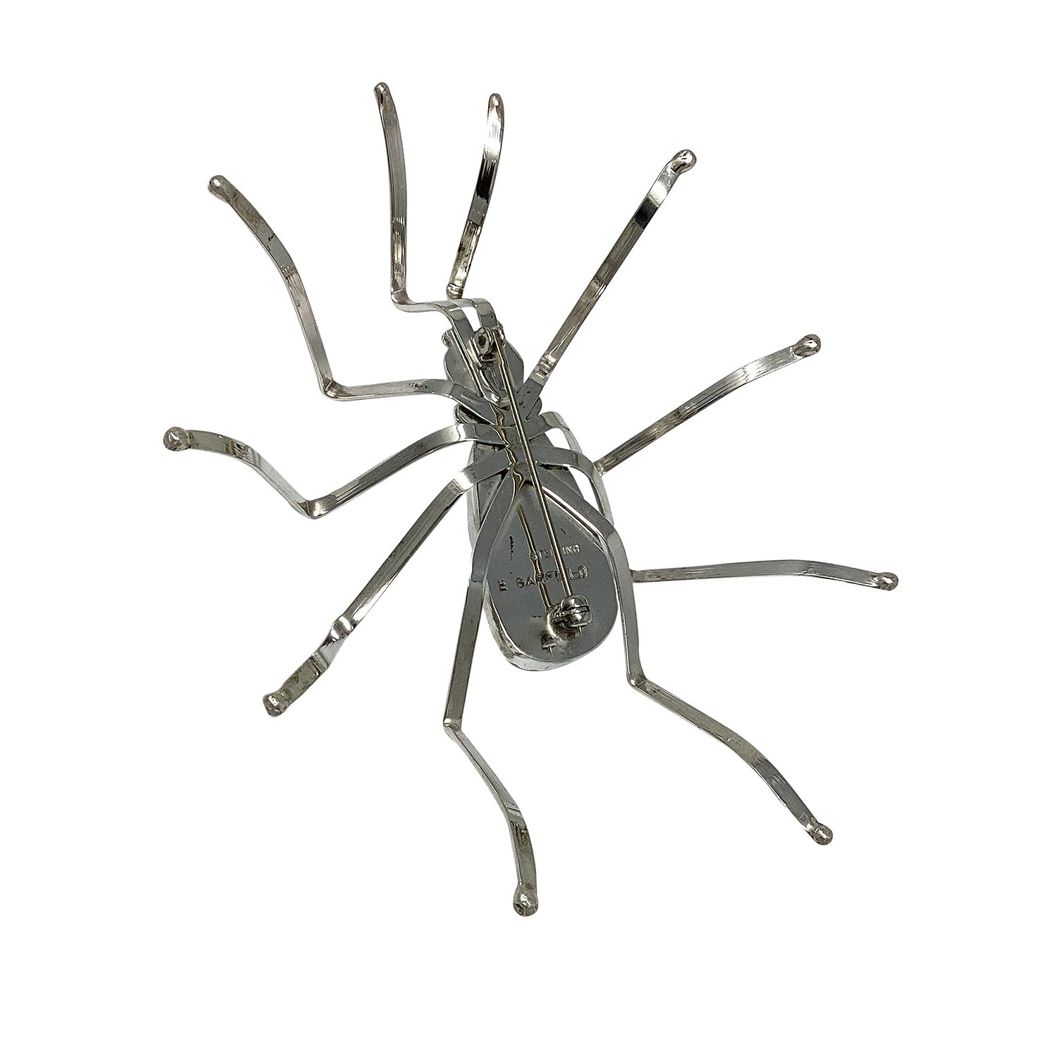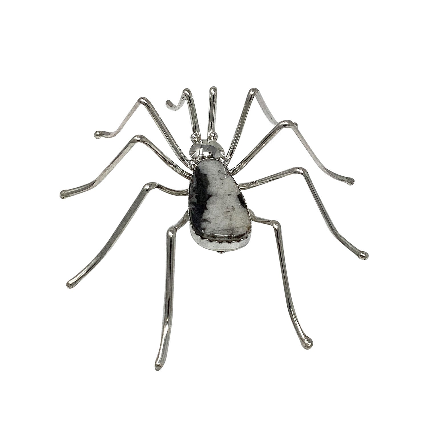 This spider design has been made for decades. It is always a fun piece to wear and captures the attention of all who see it. Navajo silversmith Effie Garfield made this spider pin using mirror shined sterling silver. Long and curvy spider legs grow out of the stone for the realistic look. You are going to love having this one on.