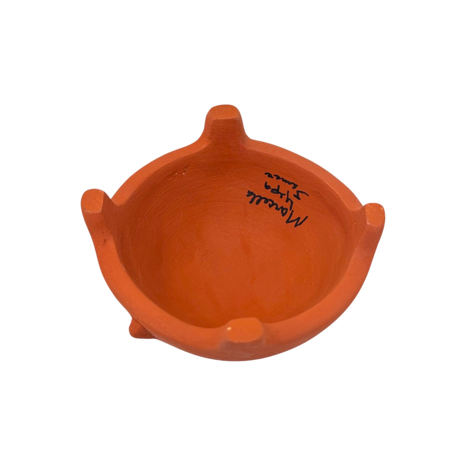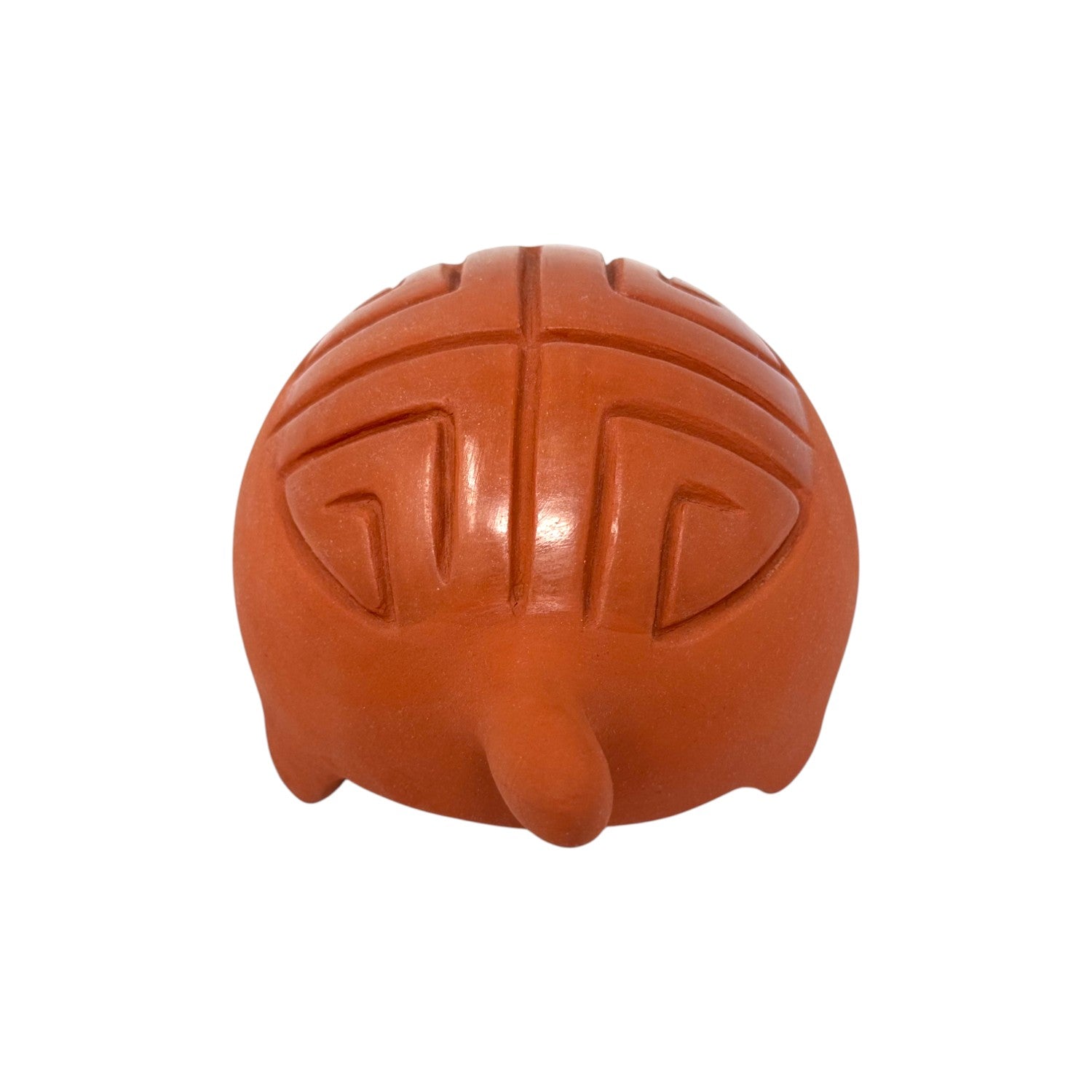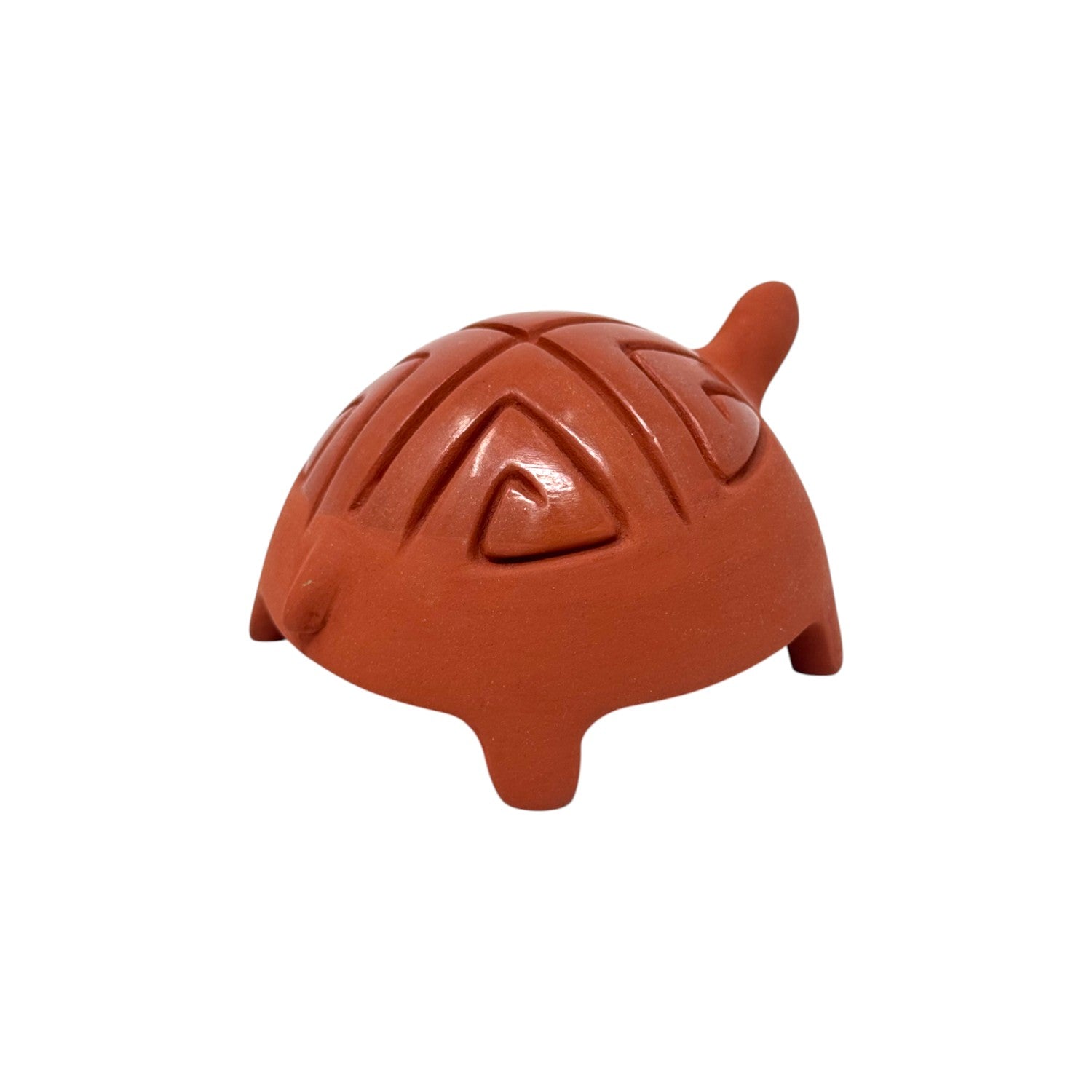 Marcella Yepa of Jemez Pueblo showcases her signature blend of tradition and creativity in this charming hand-coiled turtle pottery piece. Expertly formed from natural clay, the piece features a smooth, polished shell adorned with carved geometric designs that reflect Pueblo symbolism. The deep red hue, achieved through traditional firing methods, enhances the natural beauty of the clay and gives the turtle a warm, earthy presence. Each line and curve of the shell is meticulously shaped, showcasing Yepa’s precision and artistic vision. The stylized form captures the essence of the turtle, a symbol of longevity, protection, and harmony in many Native traditions.