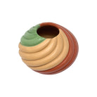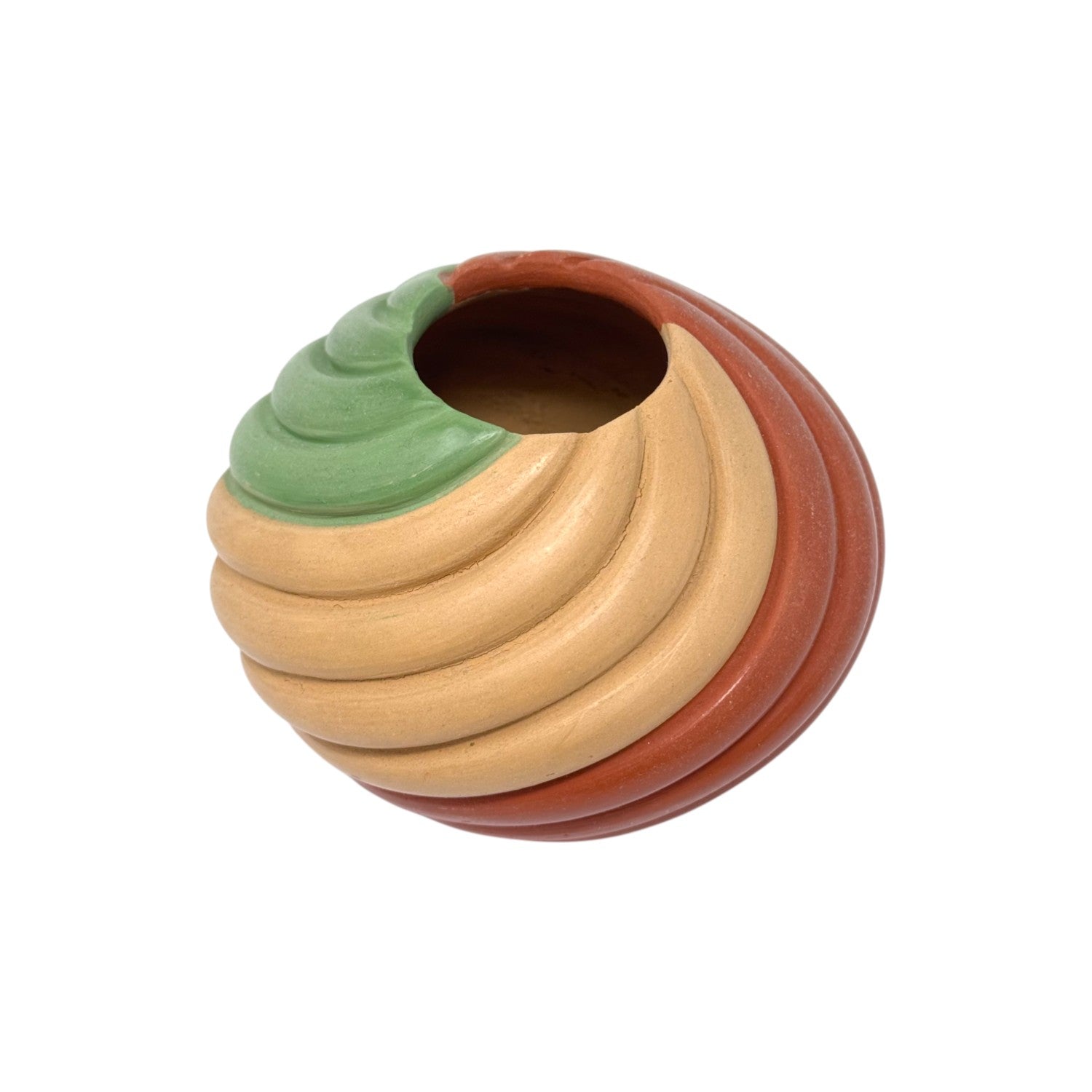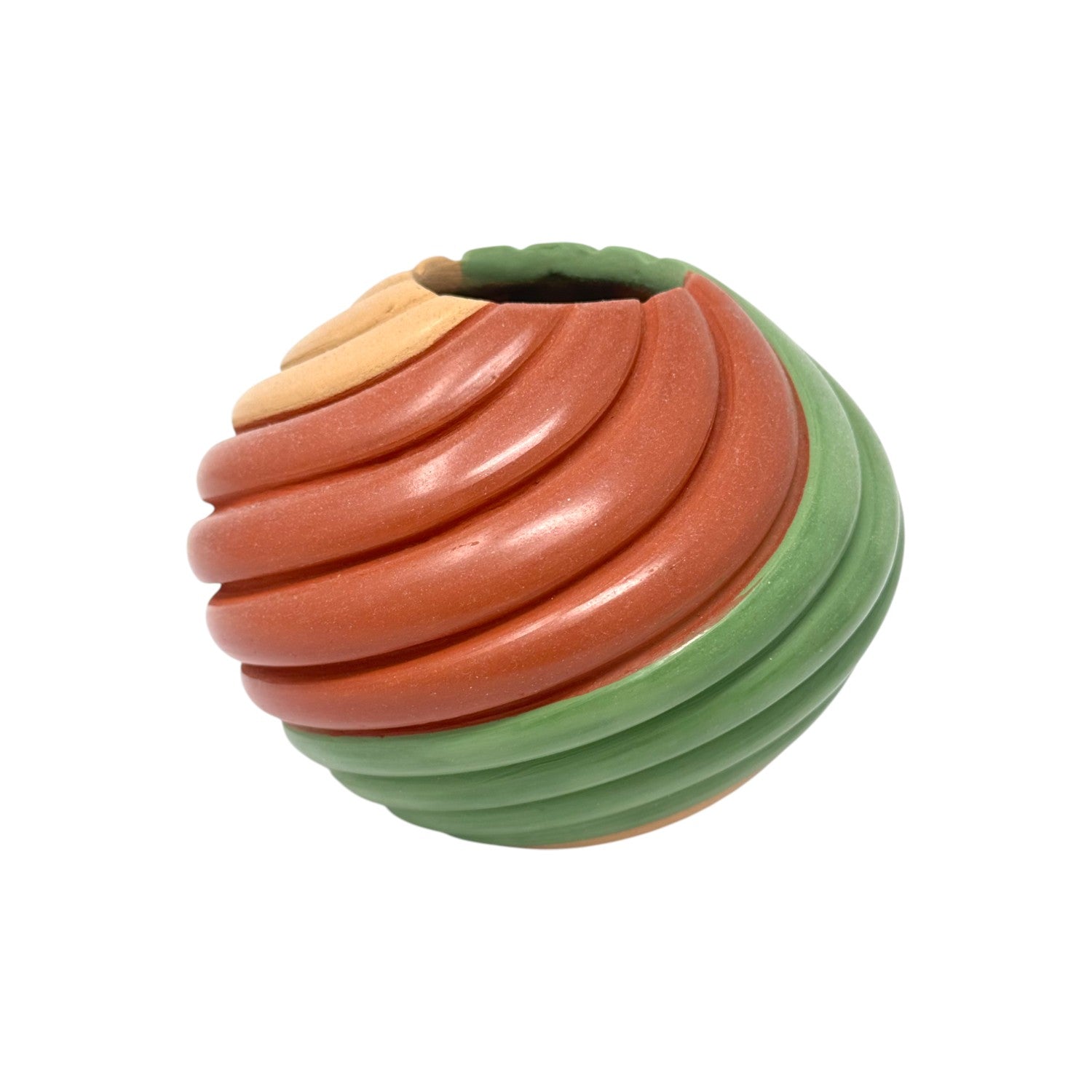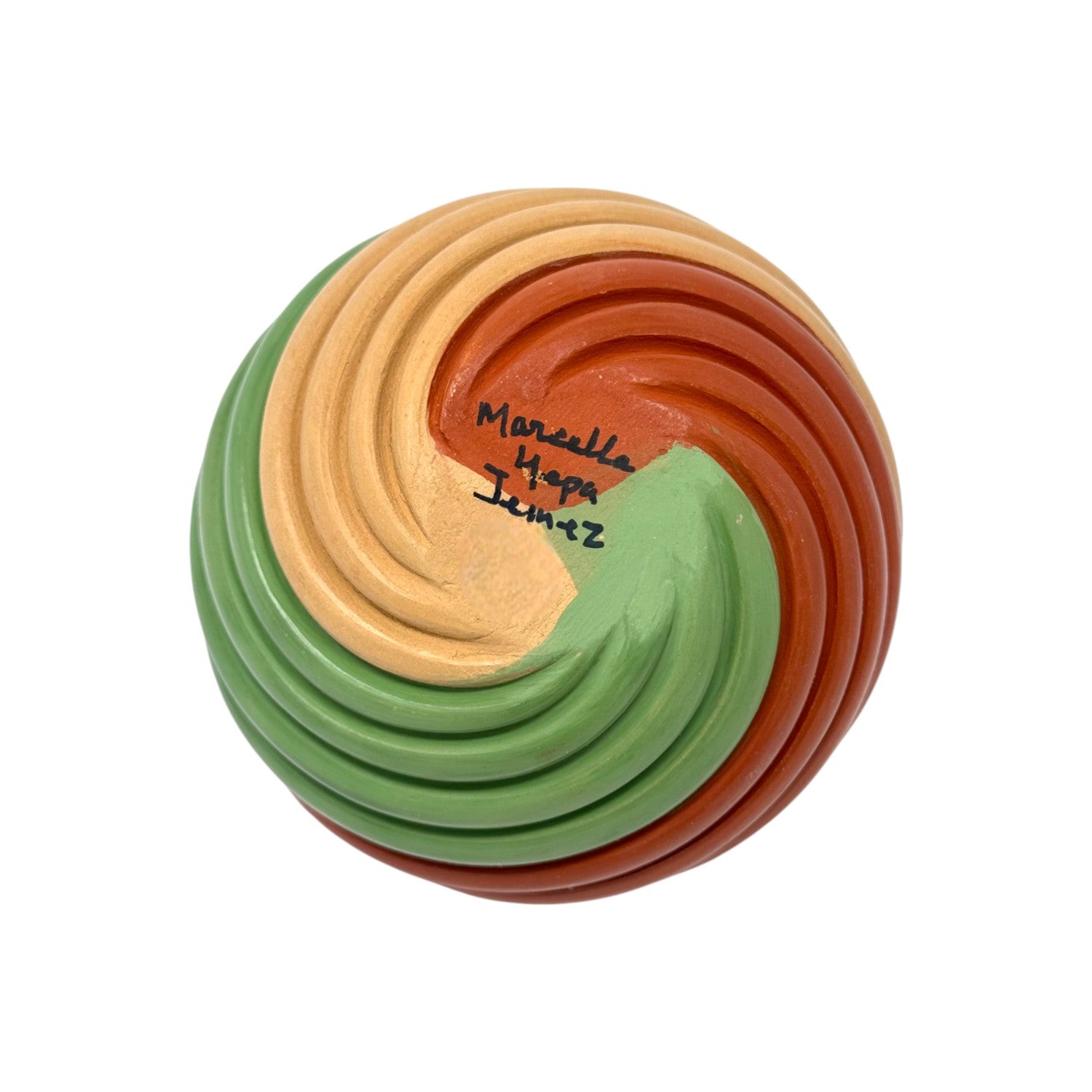 This vibrant hand-coiled pottery piece by Marcella Yepa of the Jemez Pueblo is a celebration of color, form, and movement. The polished surface flows in rhythmic coils of earthy sienna, soft beige, and bold sage green, creating a dynamic visual spiral that draws the eye from every angle. Each curve is sculpted with precision, showcasing Yepa’s mastery of traditional Pueblo techniques infused with a contemporary aesthetic. The piece feels both grounded and alive—its organic shape mirroring natural forms like a seed pod or wind-carved stone. Hand-painted accents emphasize the sculptural contours, while the high polish adds a radiant finish. Marcella Yepa's pottery is known for its balance of tradition and innovation, and this piece is no exception.