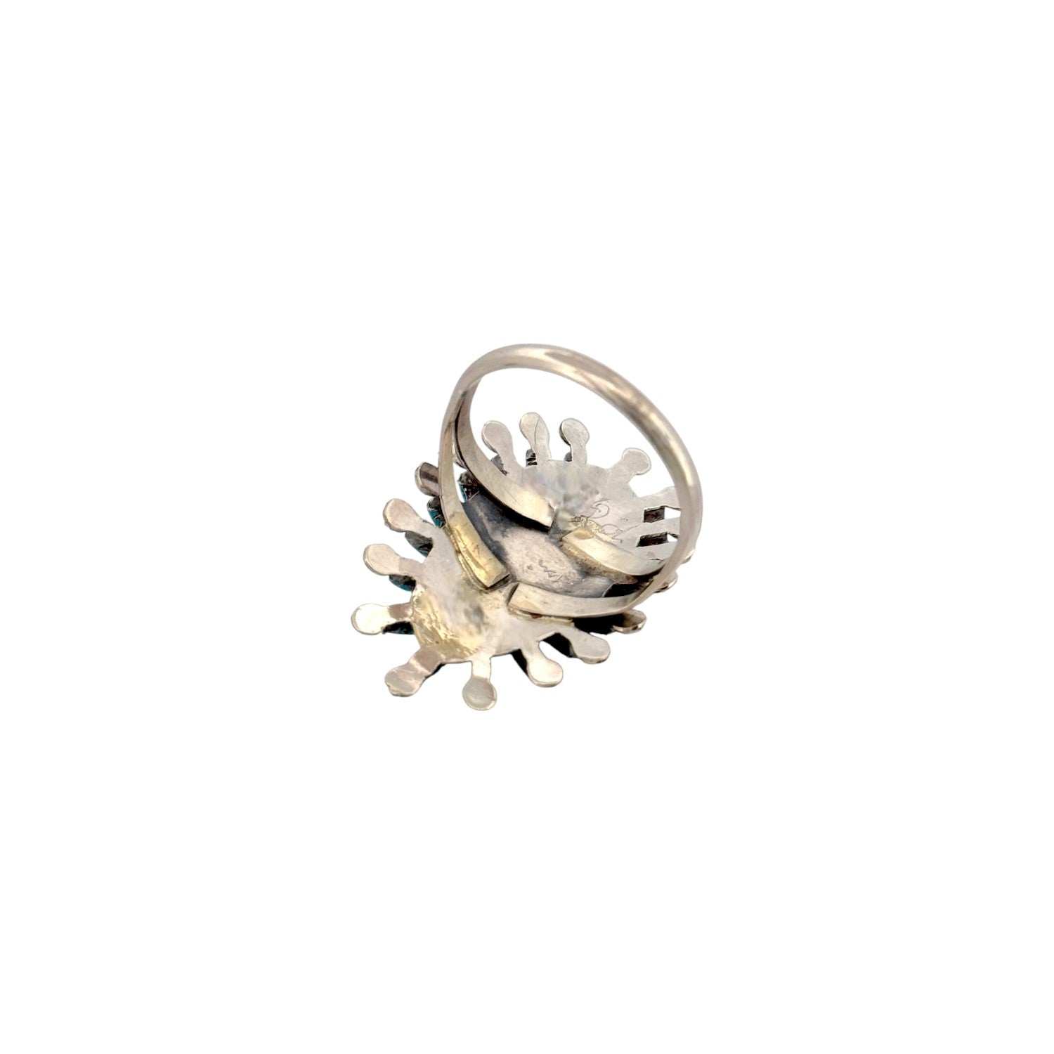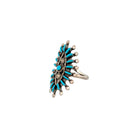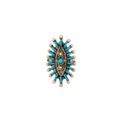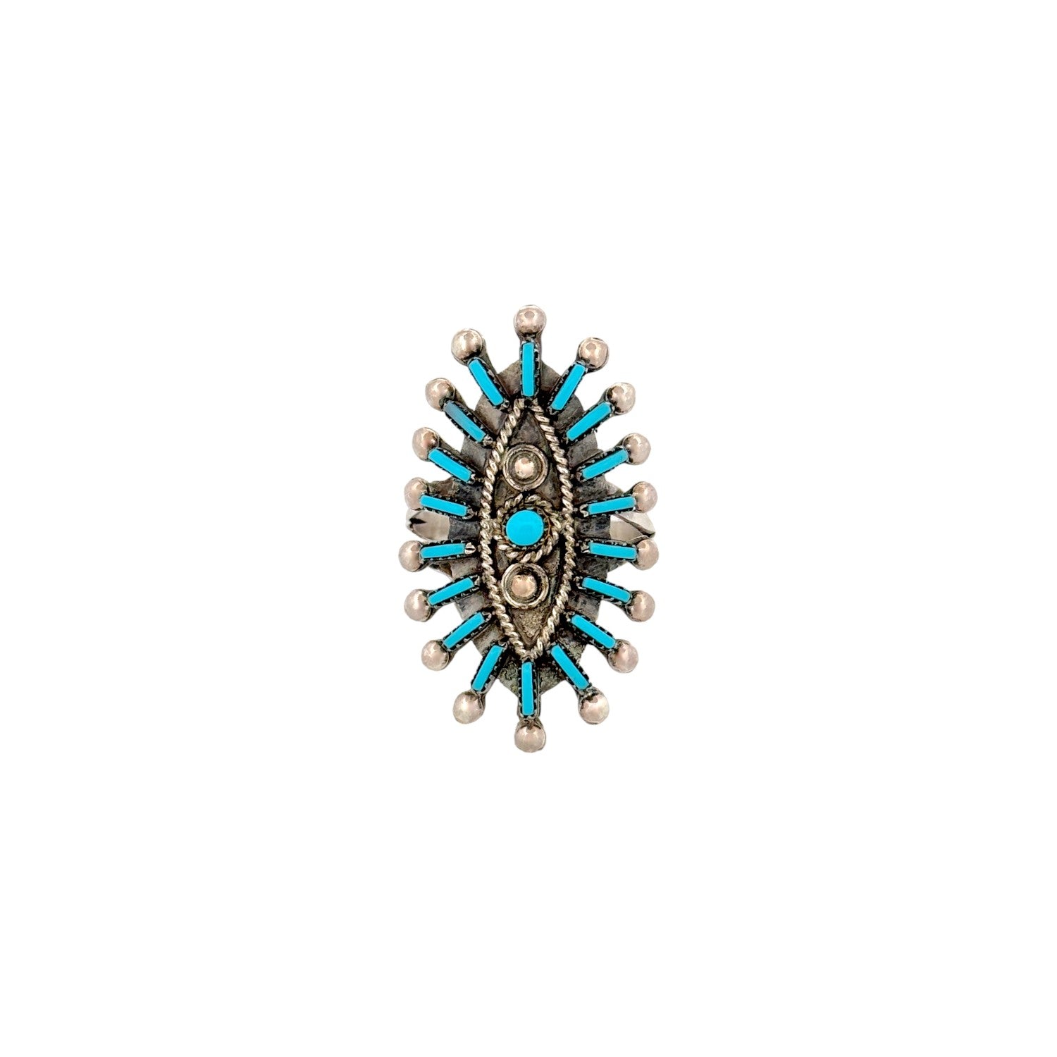 This Zuni handmade ring by RG Hallmark features an intricate cluster of Sleeping Beauty Turquoise, known for its clean, vibrant blue color. The stones are expertly cut into petite needlepoint shapes and arranged in a radiating, symmetrical design. Sterling silver beads and rope detailing add texture and depth, enhancing the precision of the stonework. The elongated oval silhouette reflects traditional Zuni craftsmanship, celebrated for its meticulous inlay and cluster techniques. This piece is a stunning example of artistry and balance, showcasing the timeless beauty of Sleeping Beauty Turquoise.