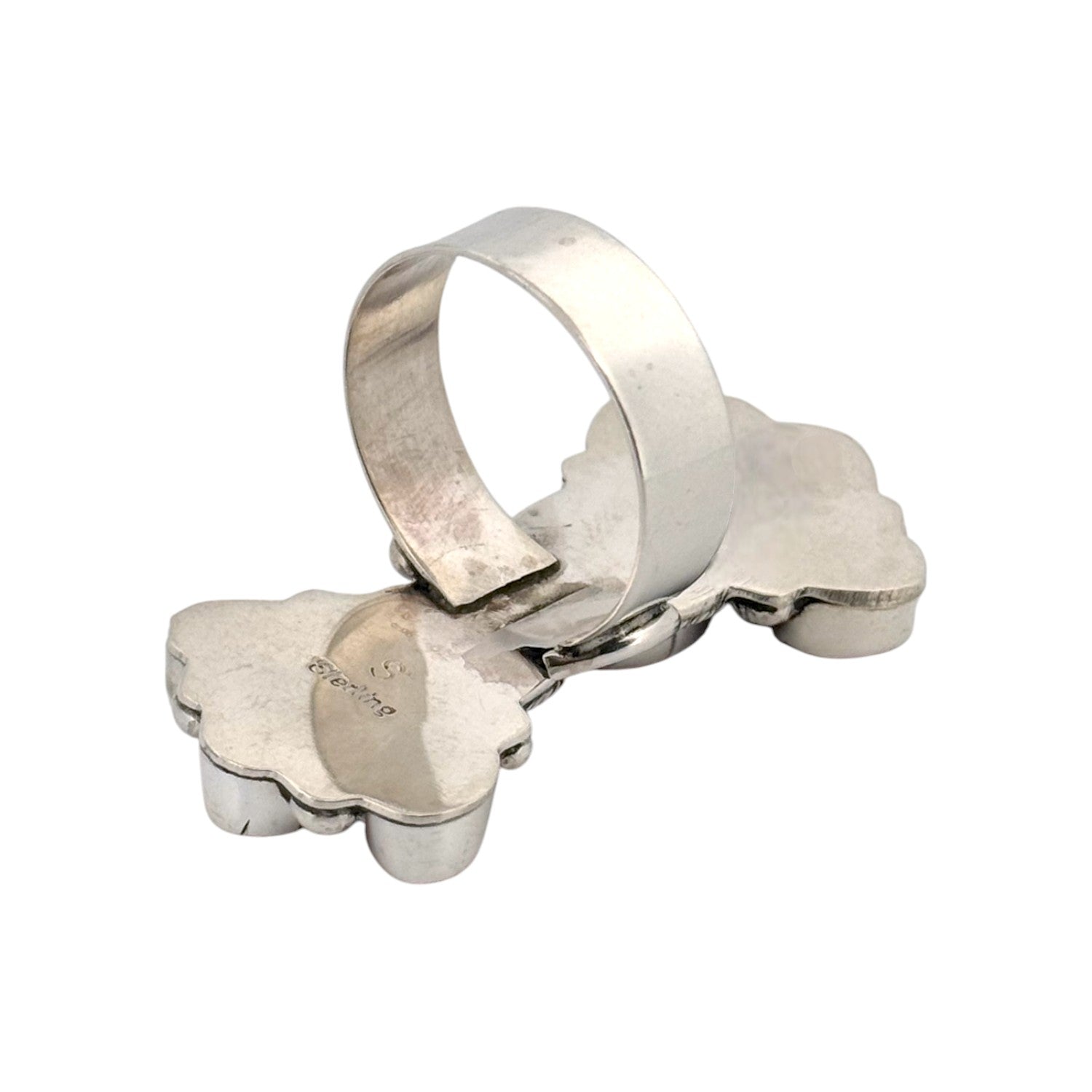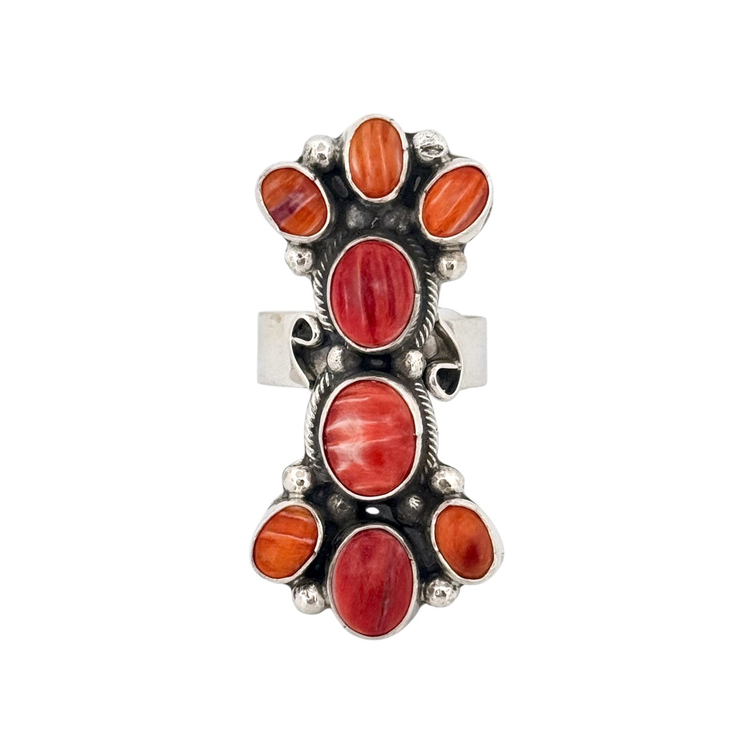 This exquisite sterling silver ring by acclaimed Navajo silversmith Sheila Becenti radiates warmth, tradition, and fine craftsmanship. Featuring a stunning vertical design, it showcases alternating red and orange spiny oyster shell cabochons, each hand-cut and polished to reveal the natural beauty and depth of the shell’s ocean born hues. The vivid colors evoke the spirit of the Southwest, sunset skies and desert landscapes brought to life through Native artistry. Set in hand-finished sterling silver with traditional Navajo beadwork and oxidized detailing, every element reflects generations of silversmithing excellence. The piece’s elongated silhouette offers elegance and presence, making it both a statement and heirloom.