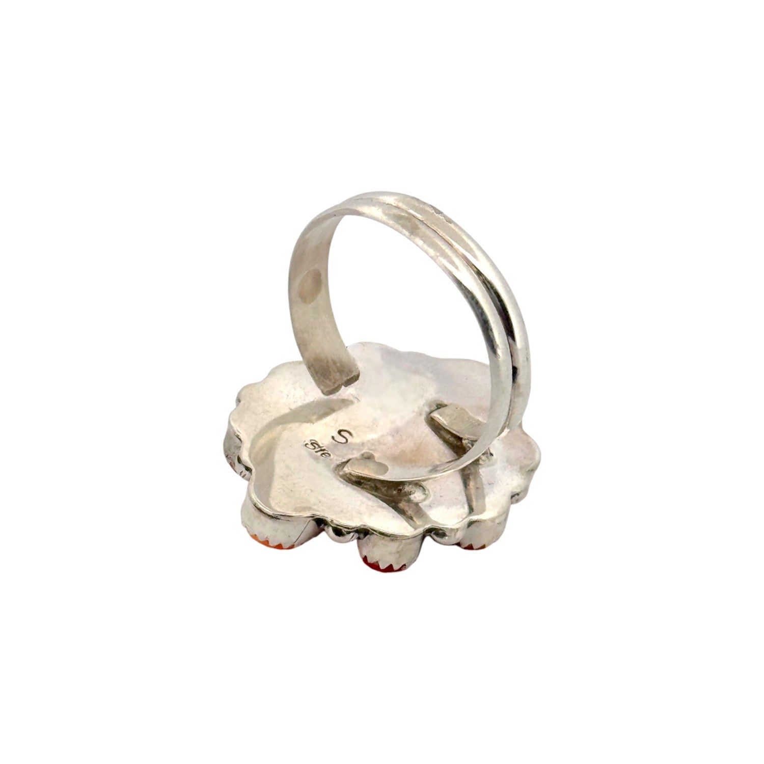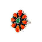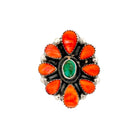 This exquisite Navajo handmade ring by Sheila Becenti showcases her signature artistry and balance of color. The design features a vibrant green turquoise stone at the center, surrounded by a radiant cluster of orange spiny oyster shell petals, forming a striking floral pattern. Each gemstone is hand-set in smooth sterling silver bezels with oxidized detailing, enhancing the depth and brilliance of the stones. The intricate silver drops and rope accents add a touch of traditional Navajo charm, celebrating both heritage and craftsmanship. Its adjustable band ensures a comfortable and versatile fit, allowing for effortless wear on any finger.