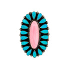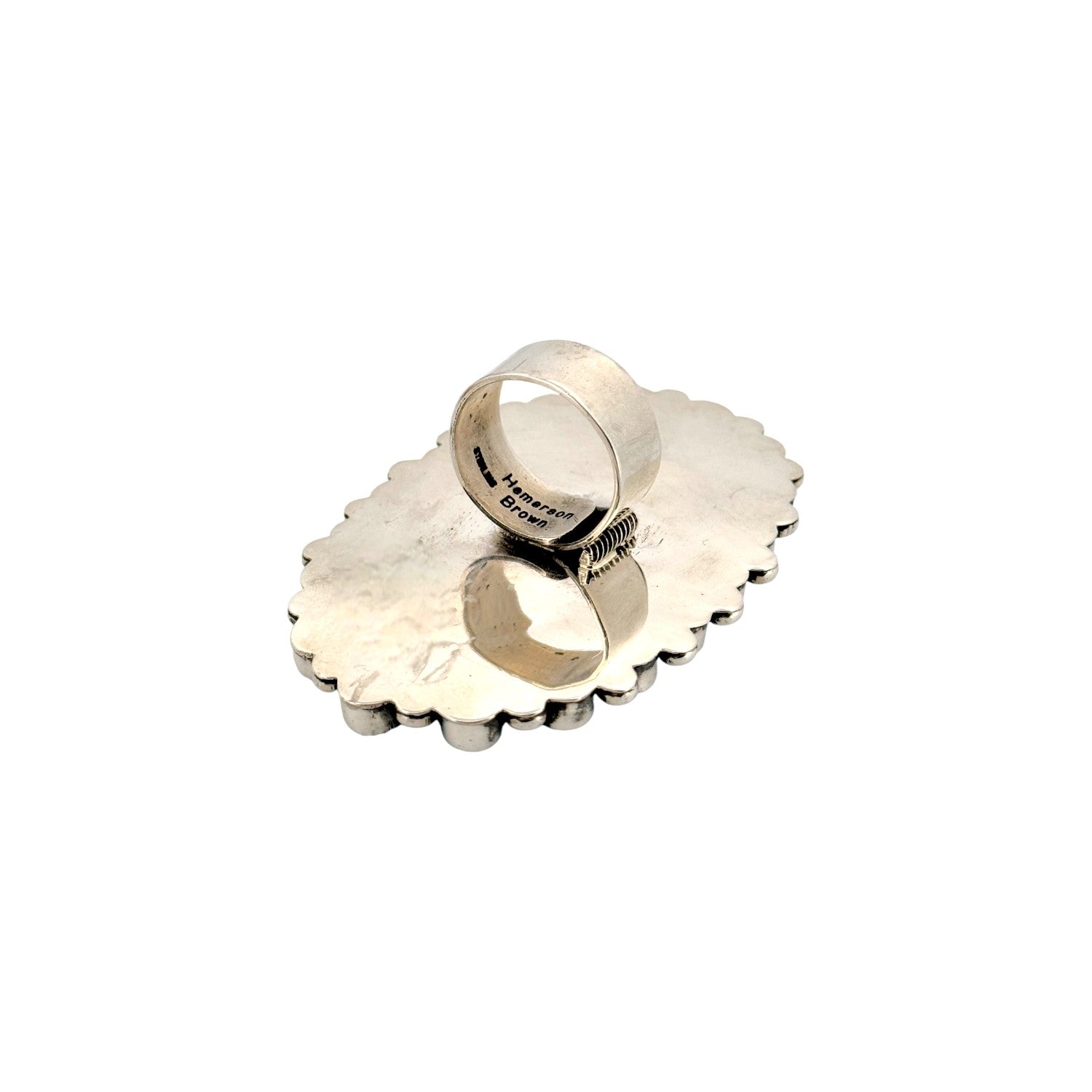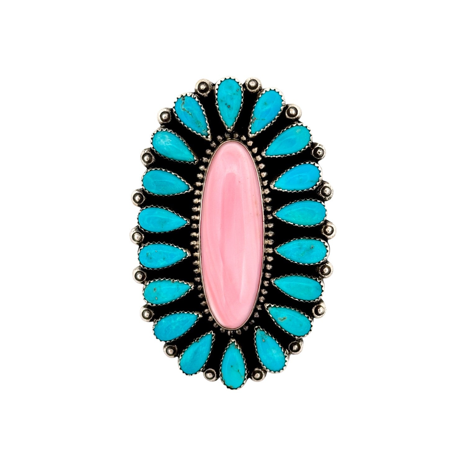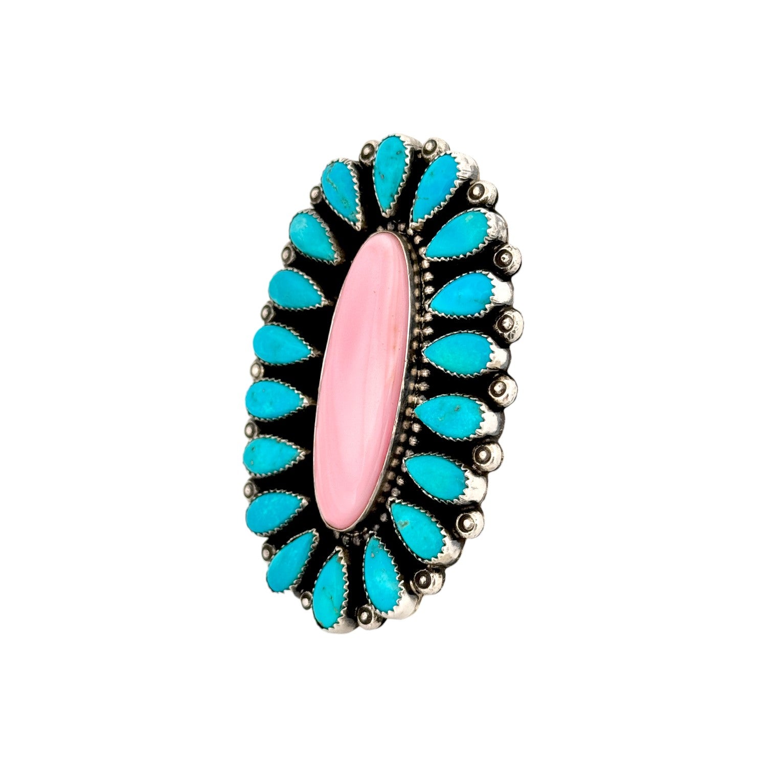Hemerson Brown’s Navajo handmade ring features a stunning combination of Kingman Turquoise and pink conch, creating a vivid contrast of color and form. The long, polished pink conch centerpiece is framed by a radiant cluster of teardrop-shaped turquoise stones. Each stone is set in serrated bezels and accented with sterling silver drops, adding texture and traditional craftsmanship. The bold, elongated oval design makes this ring a striking statement piece rooted in Navajo artistry. This handcrafted work beautifully highlights Brown’s skill, blending vibrant materials with timeless Southwestern style.