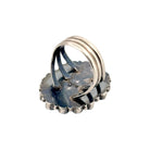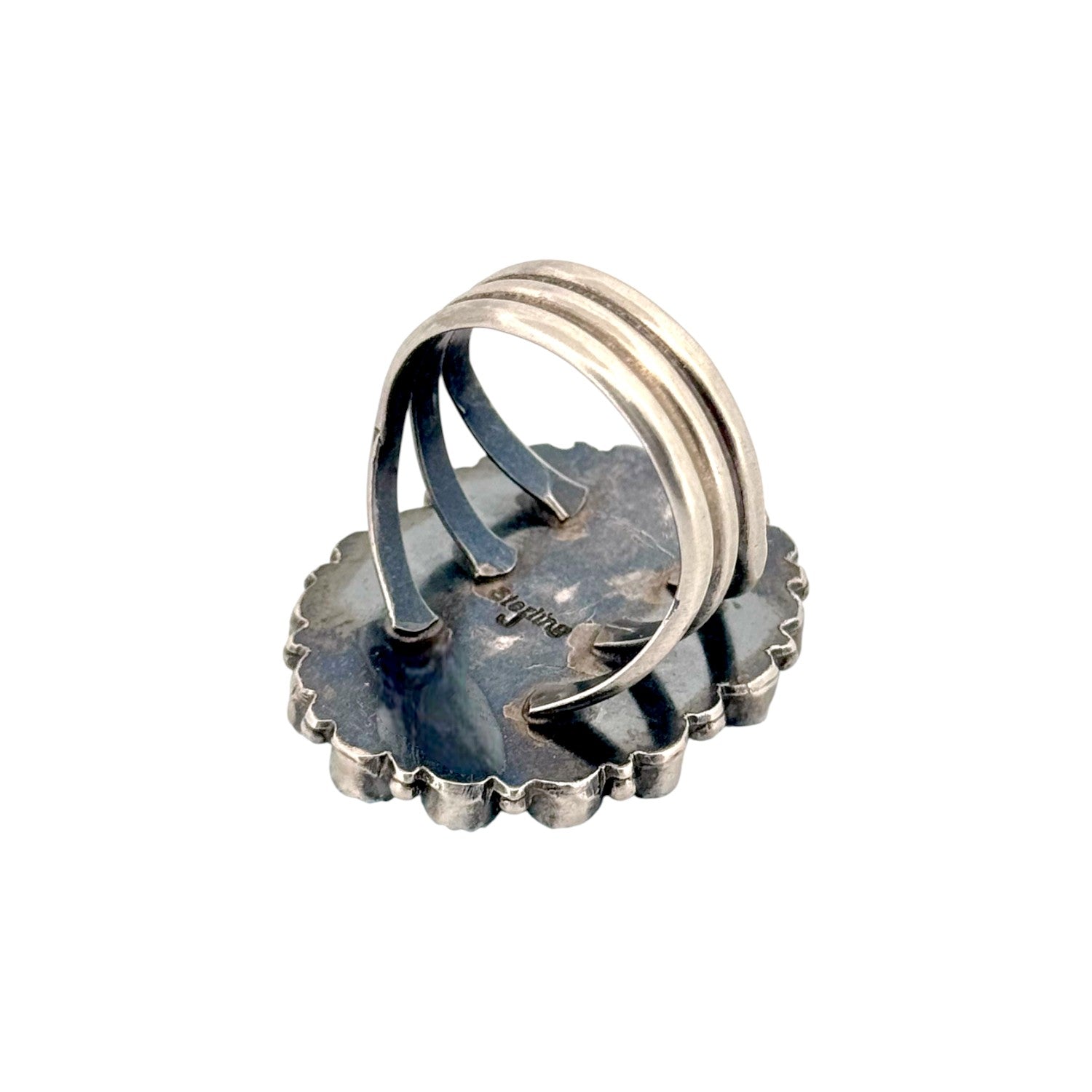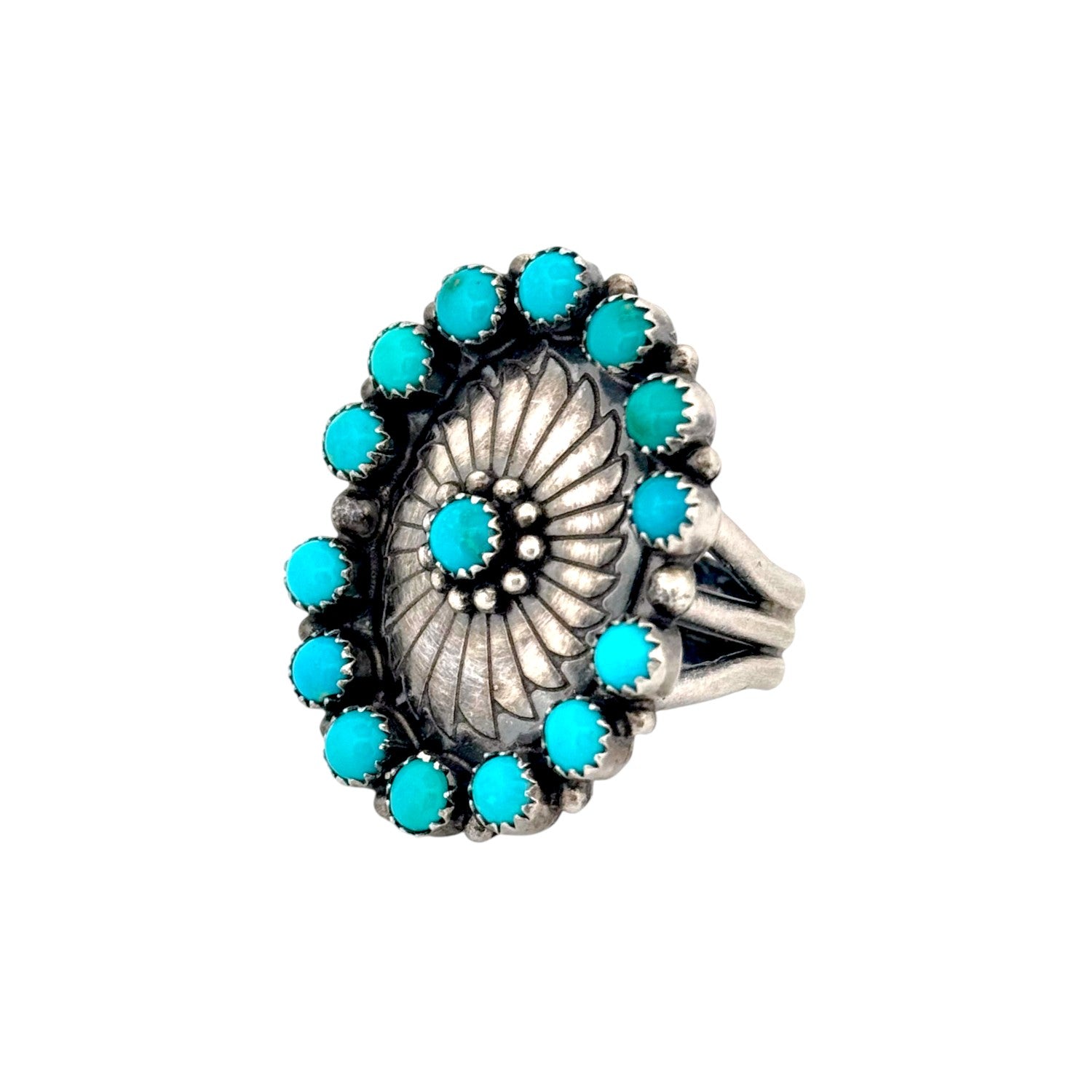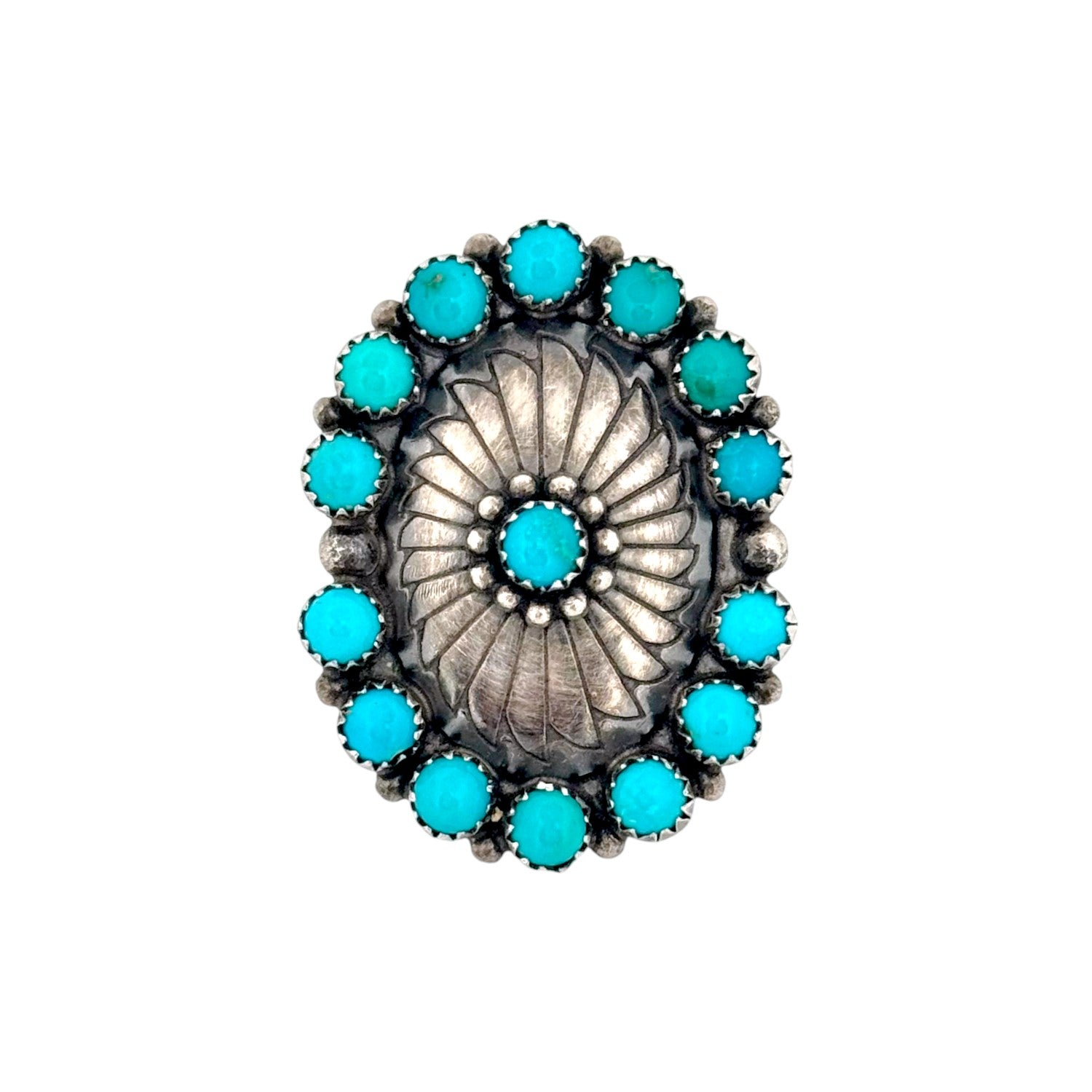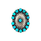This vintage Navajo ring by Jason Livingston, circa 1980s, is a powerful expression of traditional Southwestern design. Handmade in sterling silver, the ring features a central repoussé sunburst pattern framed by a cluster of vibrant Kingman Turquoise cabochons. Each stone, set in a finely crafted sawtooth bezel, showcases the classic sky-blue hue for which Kingman Turquoise is renowned. The oxidized silver background enhances the contrast, allowing both the intricate silver stamping and the turquoise stones to stand out. Balanced and symmetrical, the oval-shaped design reflects the artistry and precision of Navajo silversmithing. Substantial in size, the ring carries a bold presence while remaining elegant and timeless. As a vintage piece from the 1980s, it embodies cultural heritage and collectible value.