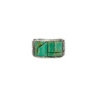 This bold ring is a Navajo handmade creation by silversmith Cody Noble. Crafted from sterling silver, it features a wide textured band that highlights a striking inlay of natural Kingman turquoise. The turquoise displays rich green and blue tones accented with veins of natural matrix, giving the piece depth and character. Each stone is carefully cut and set in a geometric pattern, reflecting both precision and artistry. The rugged, hand-worked silver band provides contrast to the smooth inlay, balancing refinement with strength. Noble’s craftsmanship blends traditional Navajo silversmithing techniques with a modern, contemporary aesthetic.