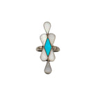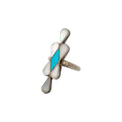This vintage Zuni ring, circa 1980s, is a graceful example of traditional inlay artistry. Handmade in sterling silver, it features a striking elongated design with a central diamond-shaped piece of Sleeping Beauty Turquoise framed by teardrop-shaped inlays of luminous Mother of Pearl. The clean geometric arrangement creates a balanced, elegant look that reflects the precision of Zuni craftsmanship. The vibrant sky-blue turquoise contrasts beautifully with the soft iridescence of the shell, giving the ring both color and depth. Lightweight yet eye-catching, it has a timeless appeal suitable for both everyday wear and special occasions. As a vintage piece, it carries the charm of 1980s Native American jewelry design while remaining a versatile and collectible treasure.