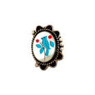 This vintage Zuni ring, circa 1970s, is a beautiful example of traditional inlay work and storytelling through jewelry. Handmade in sterling silver, the ring features a charming bird design crafted from Sleeping Beauty Turquoise, perched on branches of jet with coral blossoms and mother of pearl background. The intricate inlay demonstrates the precision and artistry for which Zuni jewelers are renowned. A twisted rope border frames the oval centerpiece, while scalloped edges and silver drop accents add depth and character to the design. The luminous mother of pearl creates a soft backdrop that highlights the vivid turquoise and coral details. Both whimsical and meaningful, the bird motif symbolizes harmony and connection with nature. As a vintage piece from the 1970s, it carries historical significance and enduring cultural beauty.