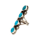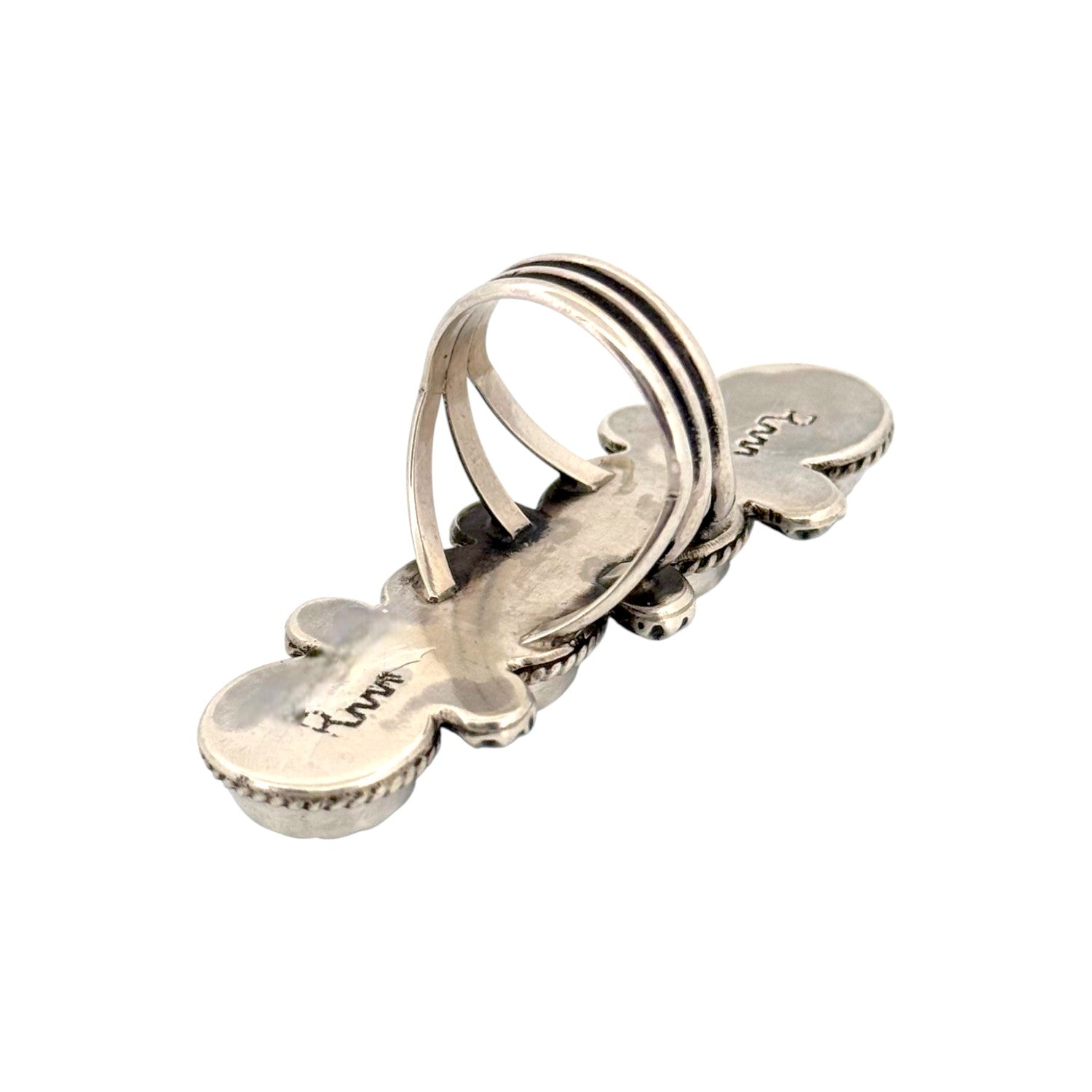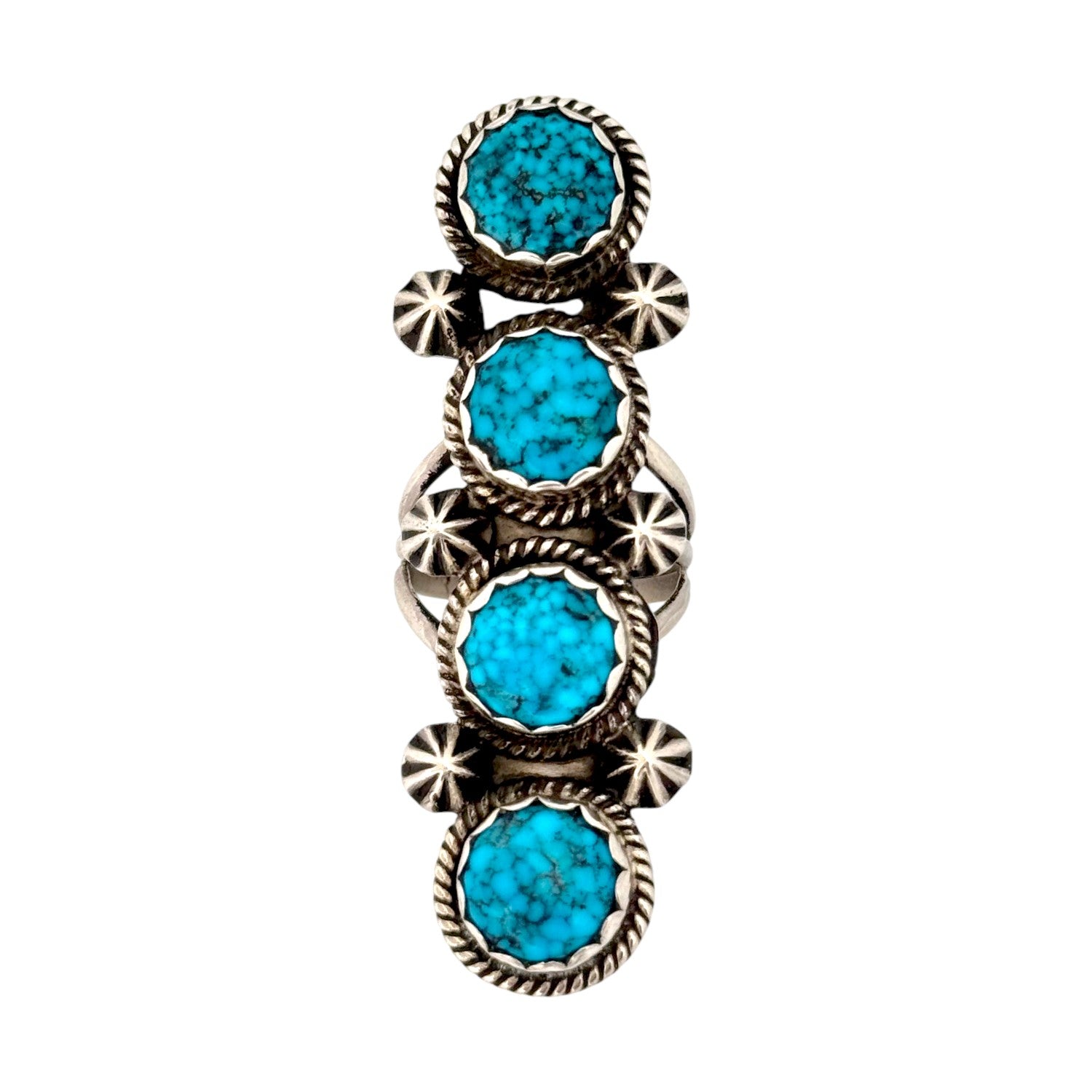 This vintage Navajo ring by John Rogers, circa 1990s, is a bold and elegant creation featuring exceptional Water web Kingman Turquoise. Handmade in sterling silver, the ring showcases four round turquoise cabochons, each with a distinctive blue hue and intricate webbed matrix. The stones are set in finely crafted bezels with twisted rope detailing, giving the design both depth and texture. Silver starburst stamps and drops accent the stones, adding balance and symmetry to the elongated layout. The oxidized background enhances the brilliance of the turquoise, making the stones stand out with striking presence. Substantial in size, this ring carries a strong statement while maintaining traditional Navajo elegance. Known for his craftsmanship, John Rogers’ work highlights the harmony between natural stone and silverwork.