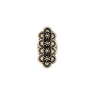 This Navajo handmade ring by Edison & Sandy Smith showcases exquisite sterling silverwork in a bold, elongated design. The piece features a series of intricately stamped floral and sunburst motifs, demonstrating the artists’ mastery of traditional Navajo silversmithing techniques. Darkened oxidized details provide contrast, bringing depth and emphasis to the raised patterns. The scalloped edges add softness to the strong geometric layout, creating a balanced and elegant composition. A beautifully crafted statement piece, this ring highlights the refined artistry and distinctive style of Edison & Sandy Smith.