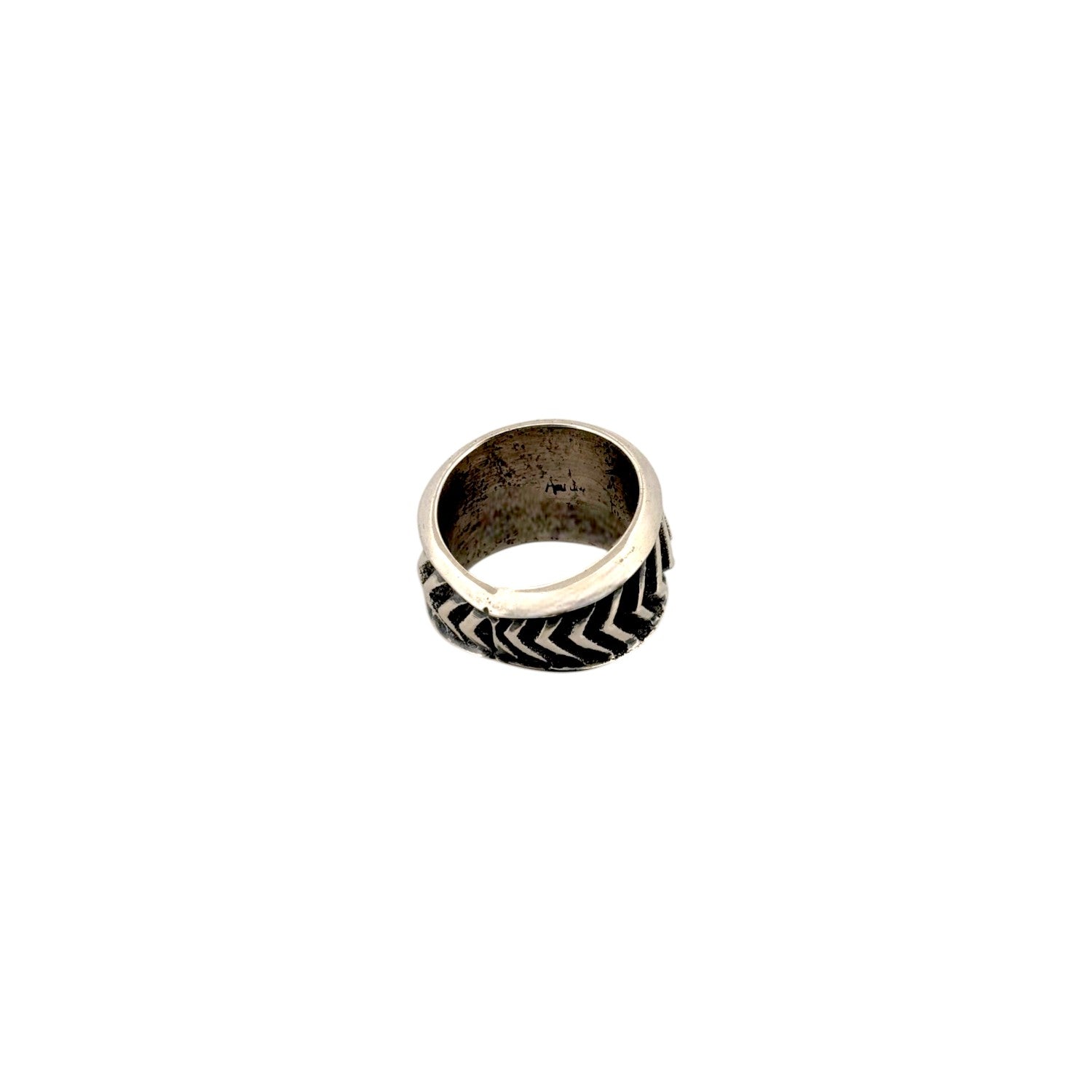 This Navajo handmade sterling silver ring by Aaron Anderson showcases his signature tufa cast technique, resulting in a bold and richly textured design. The wide band features a striking chevron pattern, deeply set against a darkened oxidized background for dramatic contrast. Each line carries a hand-carved quality, highlighting the organic imperfections that make tufa cast pieces so distinctive. The substantial form and sculptural depth give the ring a strong, contemporary presence while honoring traditional Navajo methods. Signed by the artist, this piece is a powerful example of Aaron Anderson’s masterful craftsmanship and innovative style.