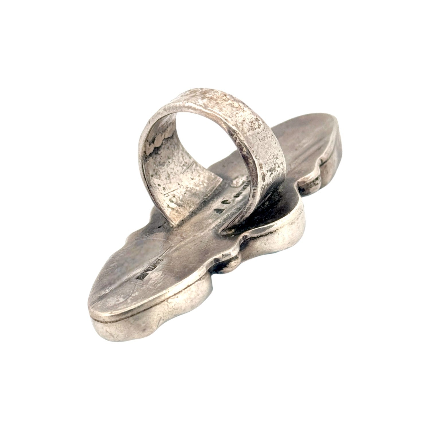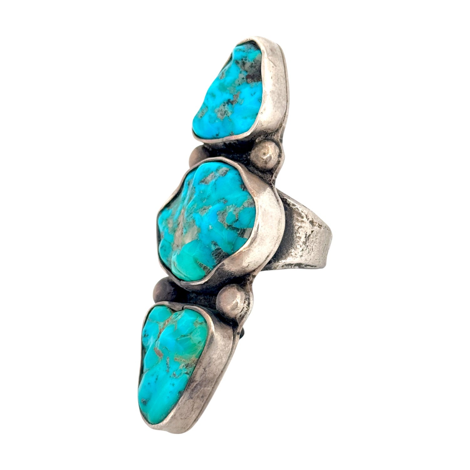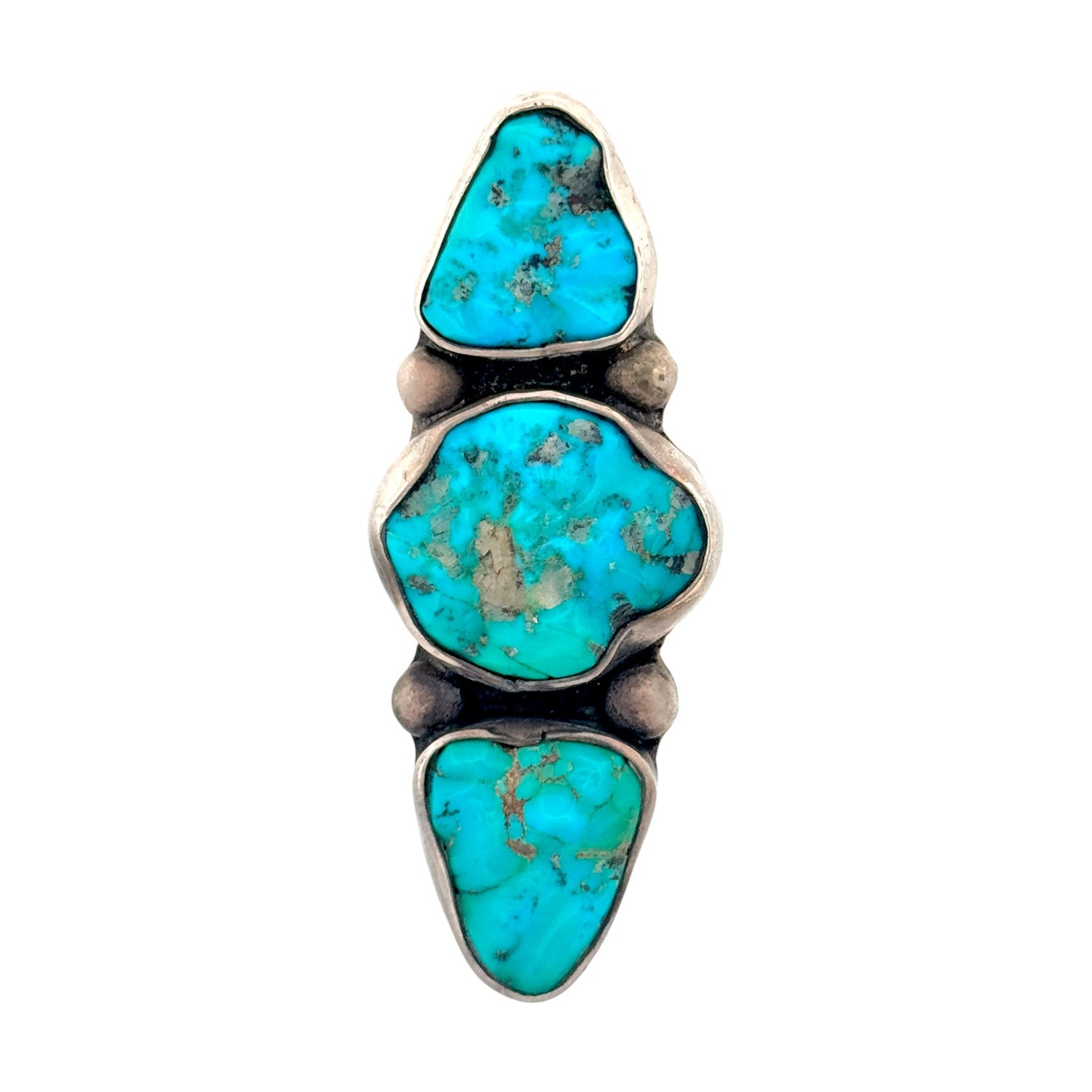 This striking vintage ring by Anglo artisan Jerry Faires is a beautiful example of 1980s Navajo handmade craftsmanship. The piece features three natural Kingman turquoise stones, each uniquely shaped and rich with the mine’s signature matrix of earthy brown and black veins. Set in sterling silver, the stones are arranged vertically and accented with smooth silver beads, adding balance and texture to the bold design. The organic stone shapes and handcrafted silverwork highlight the artist’s dedication to traditional Navajo techniques. The ring carries a warm patina that enhances its vintage character, reflecting decades of history and wear.