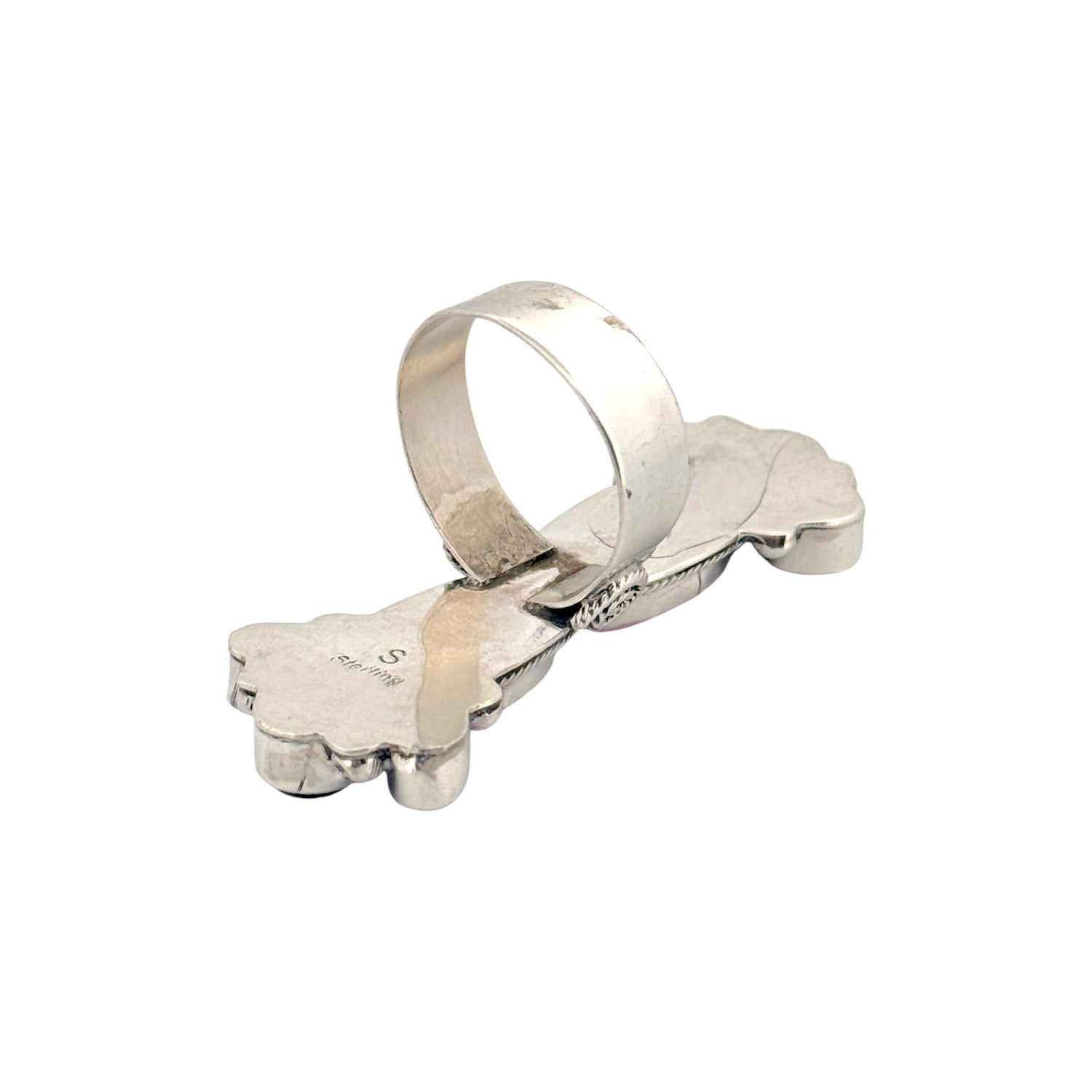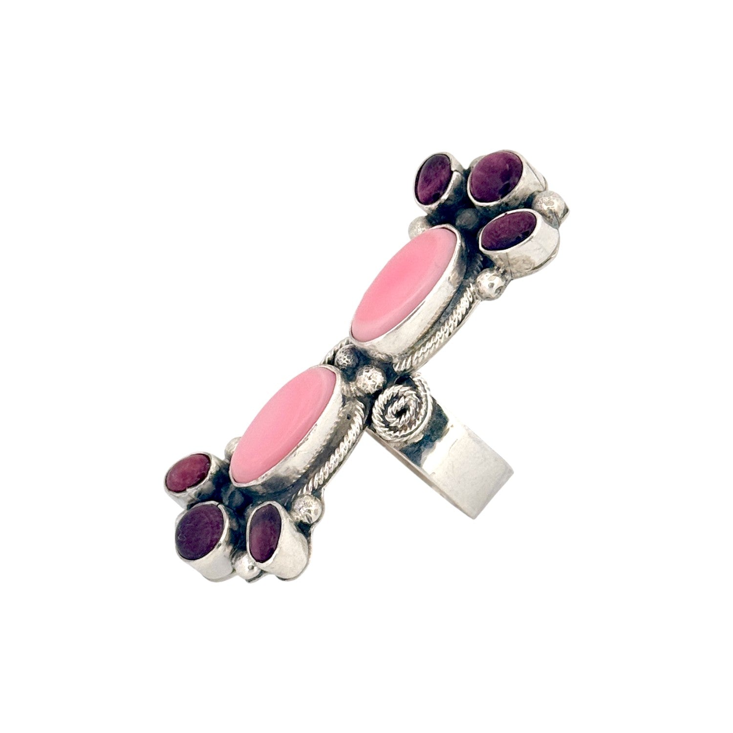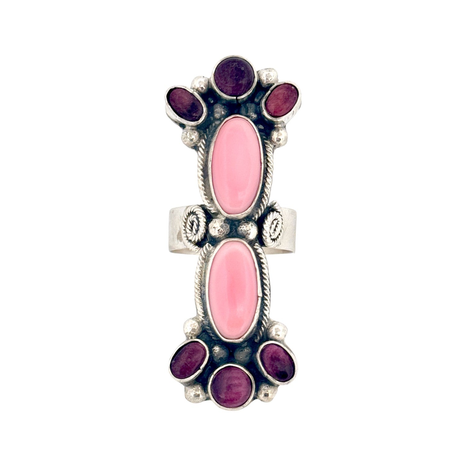 This exquisite Sheila Becenti ring showcases the artistry and tradition of Navajo handmade jewelry. Crafted from sterling silver, the piece features a bold vertical design set with two elongated pink conch stones complemented by rich purple spiny oyster on each end. The combination of colors creates a striking contrast that highlights Becenti’s eye for balance and beauty. Intricate silver rope detailing and bead accents surround each stone, adding depth and texture to the composition. The wide, polished band ensures both comfort and durability, making this ring as wearable as it is beautiful.