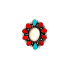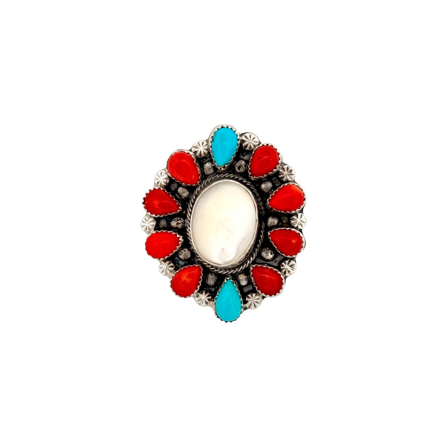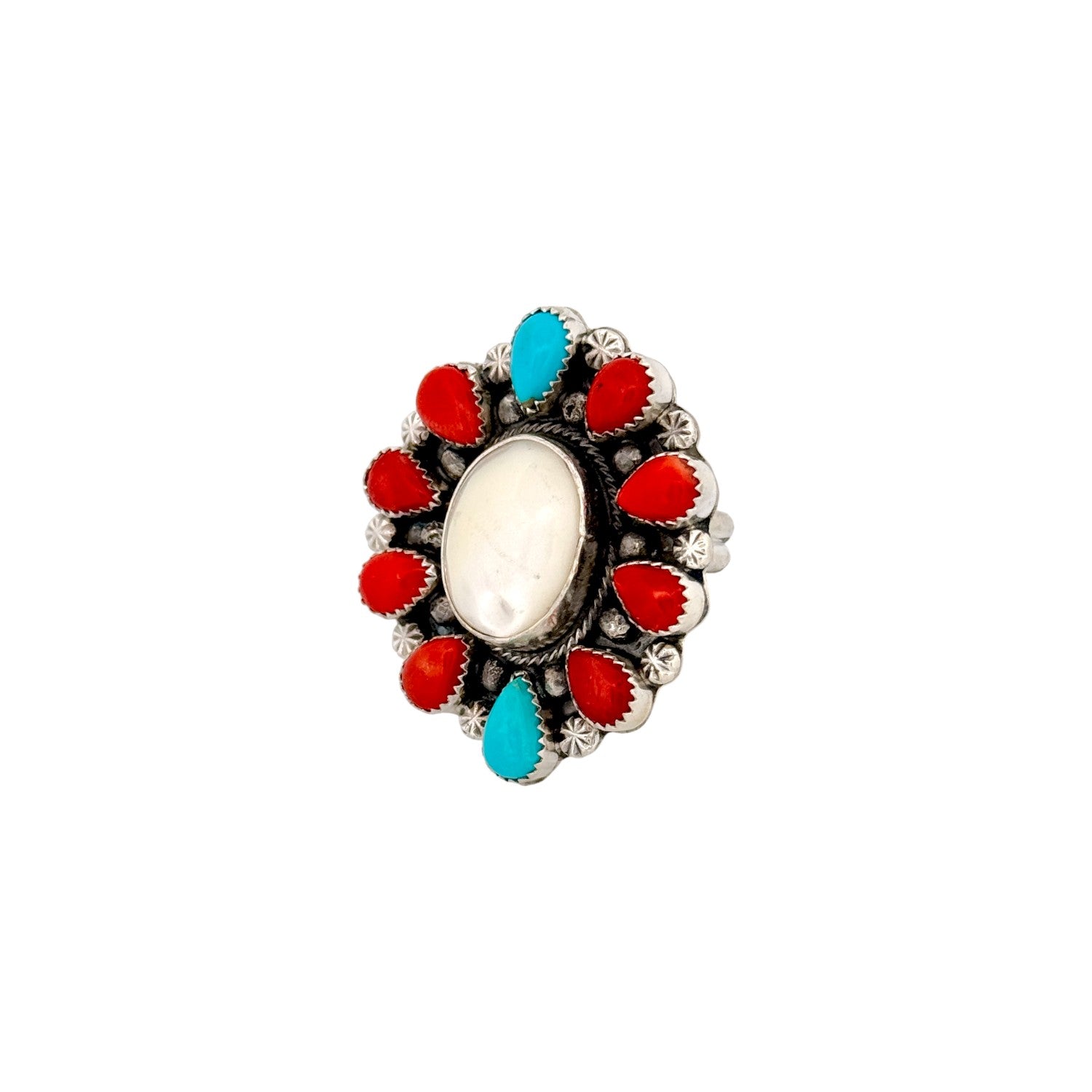 This Navajo handmade ring by Sheila Becenti showcases a beautiful blend of mother of pearl, Kingman turquoise, and vibrant coral set in sterling silver. The luminous mother of pearl center creates a soft, glowing focal point, surrounded by alternating turquoise and coral stones for rich contrast. Intricate silver beadwork and traditional detailing add texture and depth to the classic cluster design. The combination of colors highlights the natural character and beauty of each stone. Elegant yet bold, this ring is a striking example of Sheila Becenti’s skilled Navajo craftsmanship.
