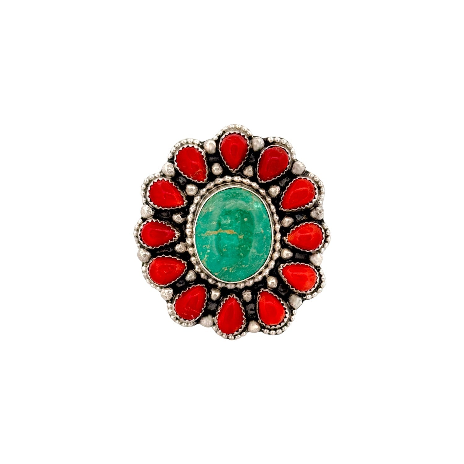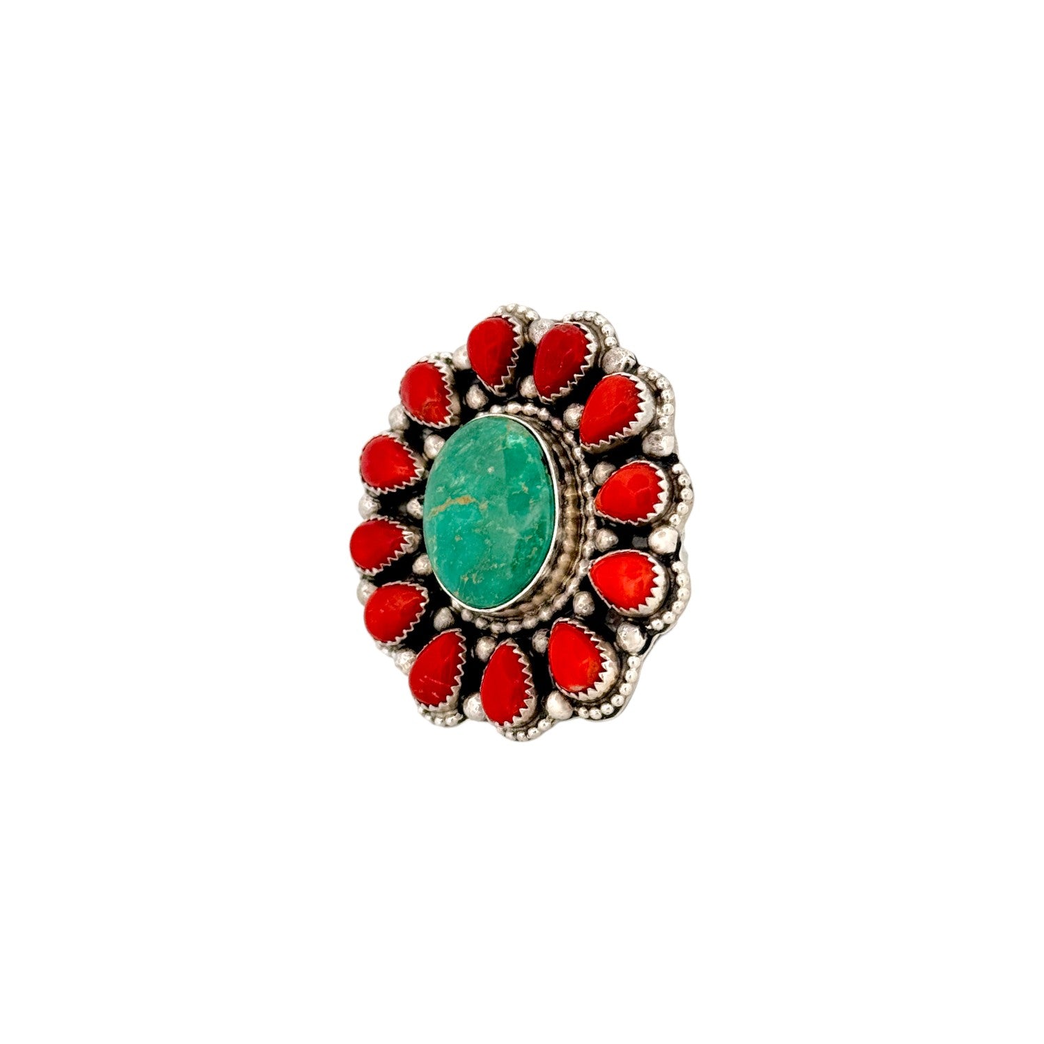 This Navajo handmade ring by Sheila Becenti features vibrant coral paired with beautiful Fox turquoise, all set in sterling silver. The rich green Fox turquoise center stone is surrounded by a halo of bold red coral cabochons, creating striking contrast and balance. Oxidized silver beadwork and scalloped bezels add depth and texture to the classic cluster design. The carefully arranged stones highlight the natural beauty and character of each material. Bold and expressive, this ring is a stunning example of traditional Navajo silversmithing and stonework artistry.