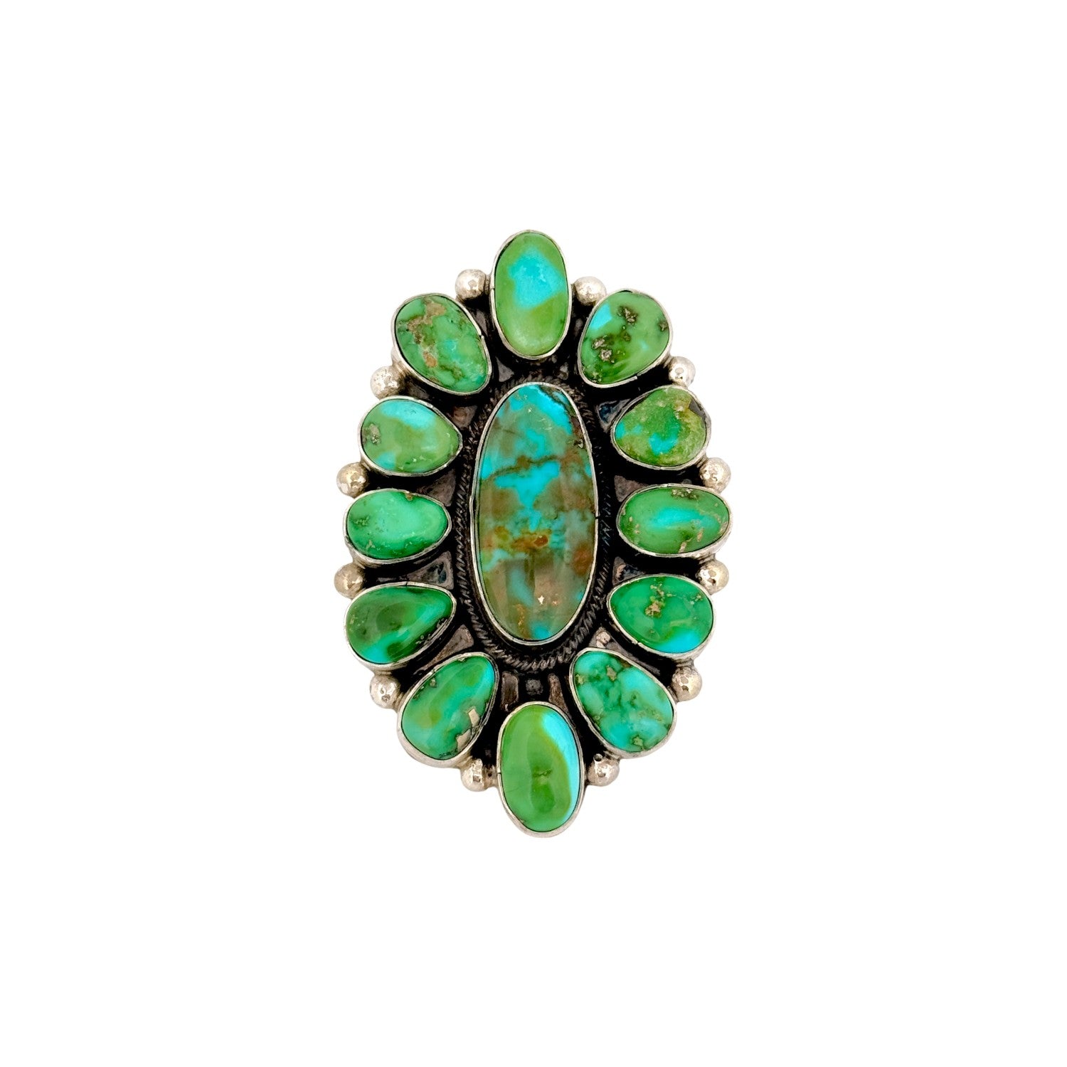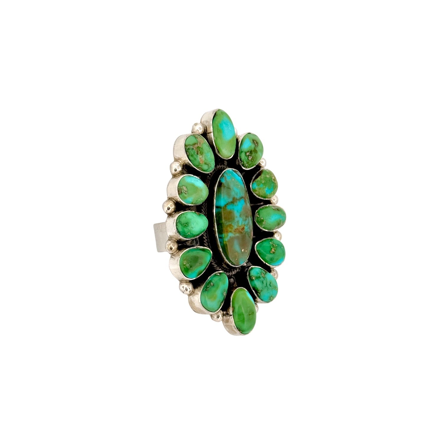 This Navajo handmade ring by Sheila Becenti features a stunning cluster of Sonoran Gold turquoise stones, each showcasing rich green and blue hues with a natural golden matrix. A large central cabochon is surrounded by beautifully matched smaller stones, creating a classic and elegant cluster design. Expertly set in sterling silver, the ring includes traditional silver bead accents that enhance its depth and symmetry. The oxidized background adds contrast, making the vibrant turquoise stand out even more. Bold, eye-catching, and expertly crafted, this ring perfectly represents Becenti’s renowned Navajo artistry.