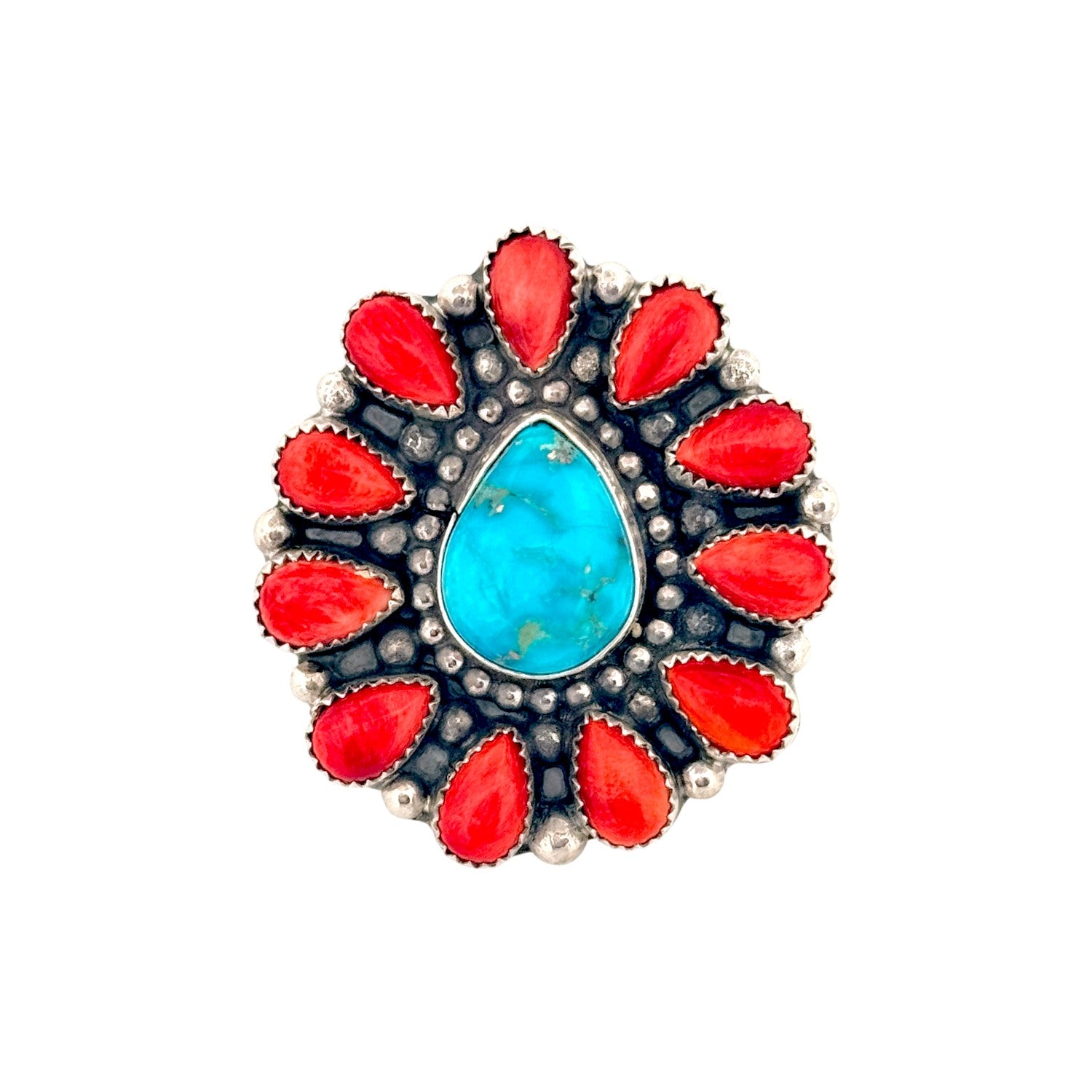 This stunning Sheila Becenti ring is a brilliant example of Navajo handmade artistry and craftsmanship. Made from sterling silver, it features a striking teardrop-shaped turquoise stone at the center, surrounded by a radiant array of spiny oyster shells. Each gemstone is meticulously hand-set in a serrated bezel, creating a bold contrast of color that captures the spirit of the Southwest. Silver bead accents frame the stones, adding texture and dimension to the design. The combination of vivid turquoise and spiny oyster shell evokes harmony, balance, and tradition; hallmarks of Becenti’s signature style.
