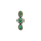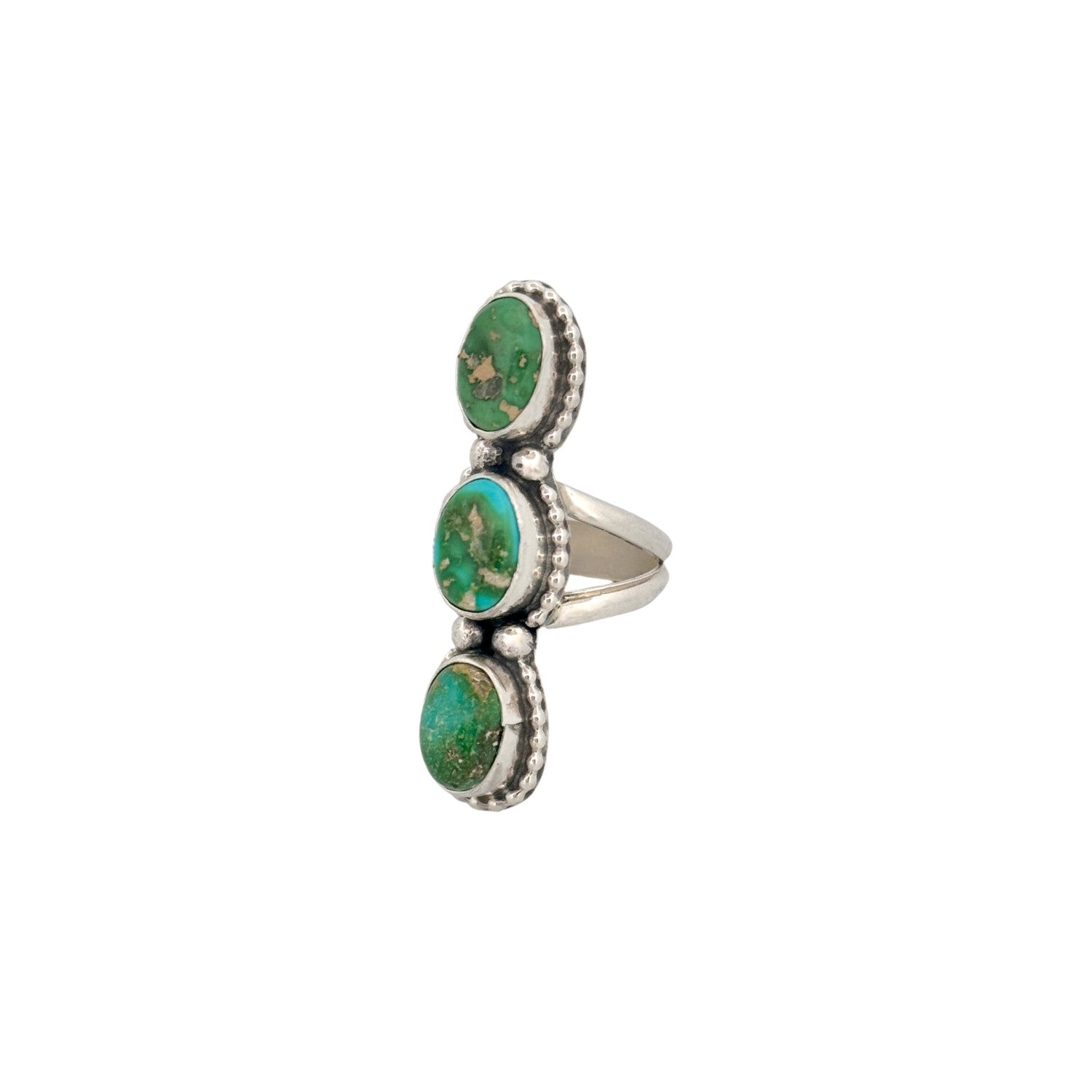 This Navajo handmade ring by Sheila Becenti showcases three vibrant Sonoran Gold turquoise stones set in sterling silver. Each oval cabochon displays beautiful green-to-blue tones with natural golden matrix, giving the piece rich character and depth. The stones are arranged in a graceful vertical line, accented by subtle silver beadwork that adds texture and traditional detail. A clean, split-style band supports the elongated design while keeping the focus on the striking turquoise. Elegant yet bold, this ring highlights the distinctive beauty of Sonoran Gold turquoise and Sheila Becenti’s refined silversmithing style.