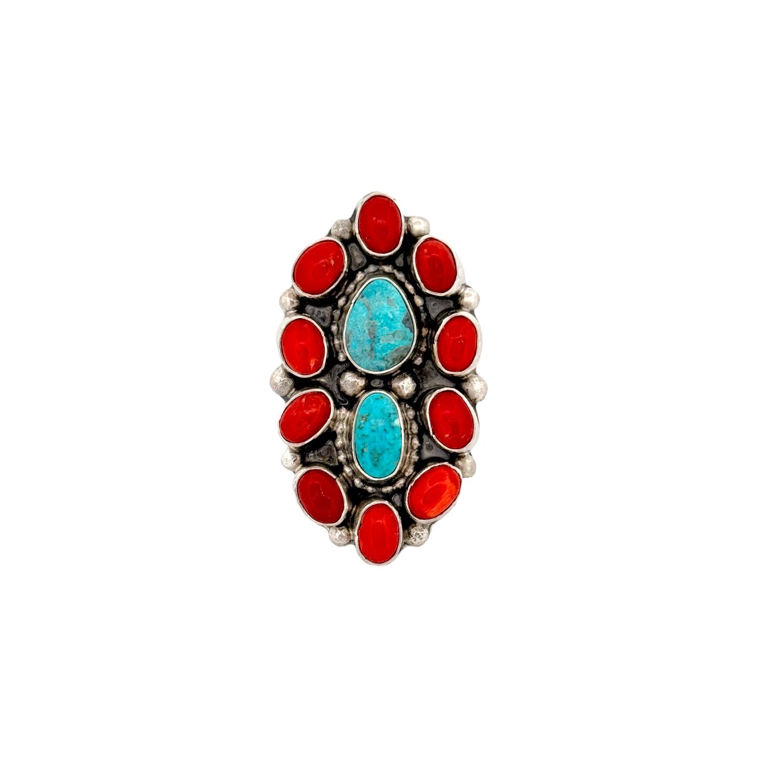 This Navajo handmade ring by Sheila Becenti features beautiful Persian turquoise paired with rich red coral, all set in sterling silver. Two vibrant turquoise stones form the center, surrounded by a halo of polished coral cabochons for striking contrast. Rounded silver beads and oxidized details add depth and texture to the classic cluster design. The balanced arrangement highlights the natural color and character of each stone. Bold and timeless, this ring is a strong expression of traditional Navajo silversmithing artistry.