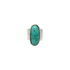 This striking ring by Navajo silversmith Lee Begay features a captivating Fox Turquoise stone, renowned for its rich greenish-blue hues and delicate matrix. The elongated oval cabochon is set in a sleek sterling silver bezel, drawing the eye to the stone’s natural beauty. The band is crafted with a subtle brushed texture, providing an understated yet elegant contrast to the polished turquoise centerpiece. Lee Begay’s craftsmanship shines through in the ring’s clean lines and balanced design, making it a versatile accessory for both casual and formal wear. The wide band ensures a comfortable fit while offering a bold presence on the hand.