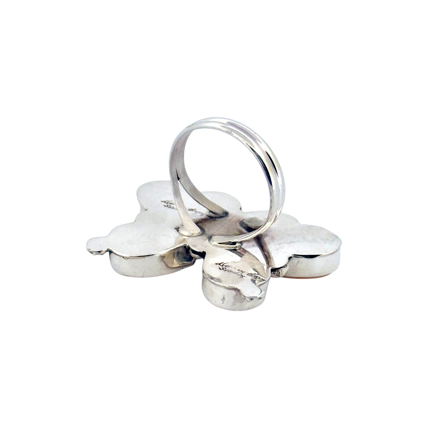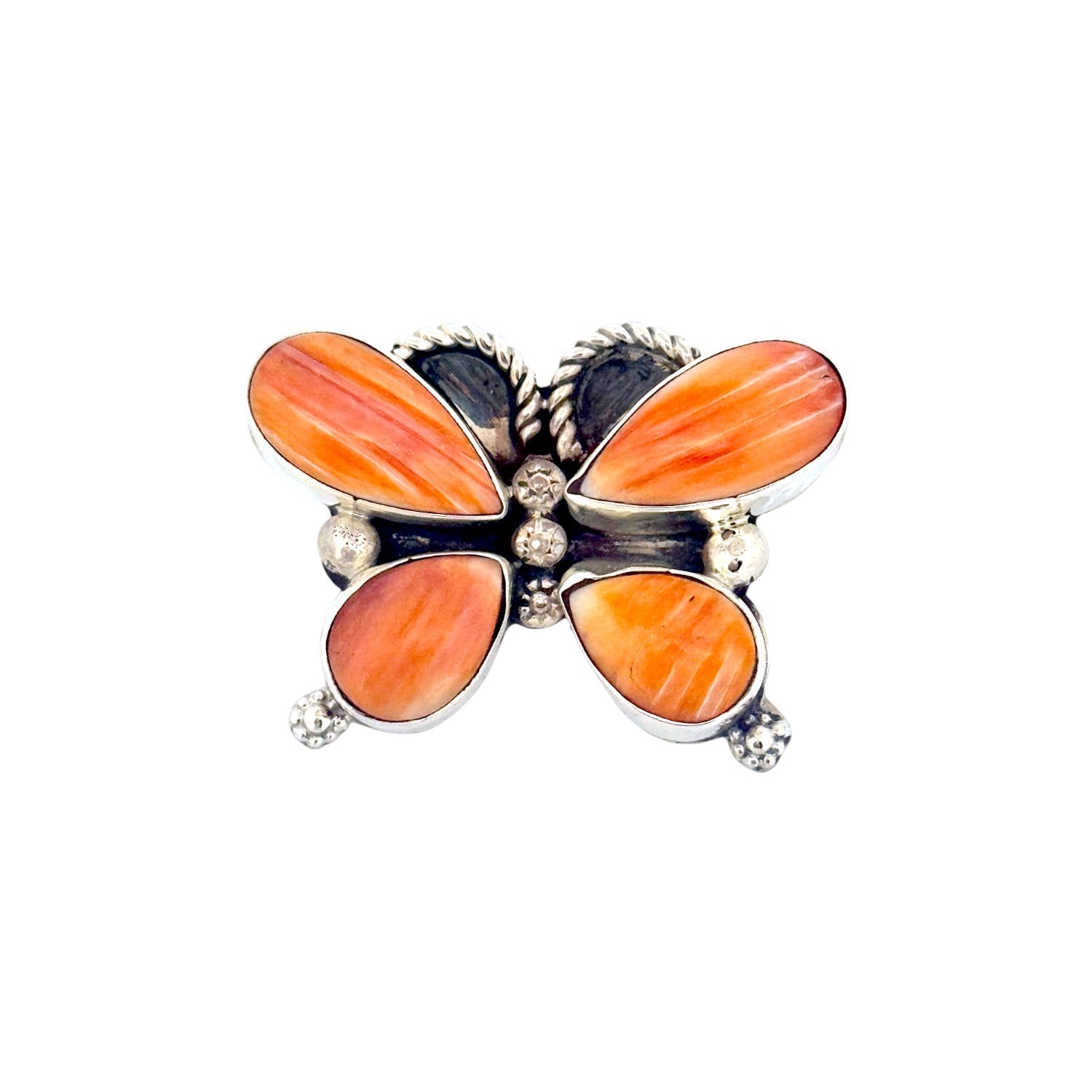 This delightful Navajo ring by artist Darlene Begay is handcrafted in the form of a butterfly, a symbol of beauty and transformation. The wings are inlaid with vibrant spiny oyster shell cabochons, showcasing warm orange and coral hues with natural striations that bring life and movement to the piece. Sterling silver accents, including twisted rope details and polished silver drops, highlight the design and add depth to the composition. The contrast between the glowing shell and gleaming silver creates a striking balance of color and texture. Begay’s artistry blends traditional Navajo silversmithing techniques with a playful, nature-inspired design. Both elegant and bold, this ring makes a wonderful statement accessory.