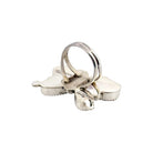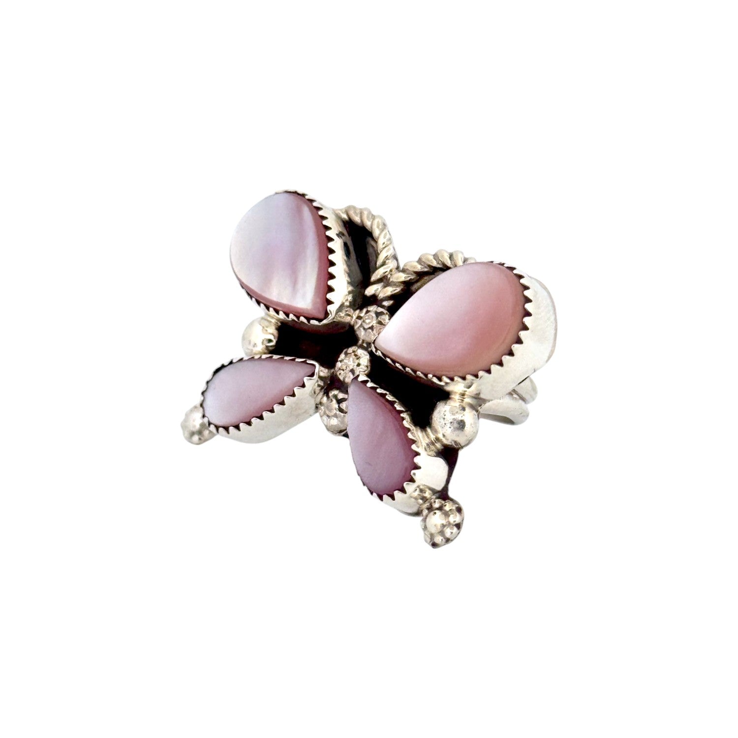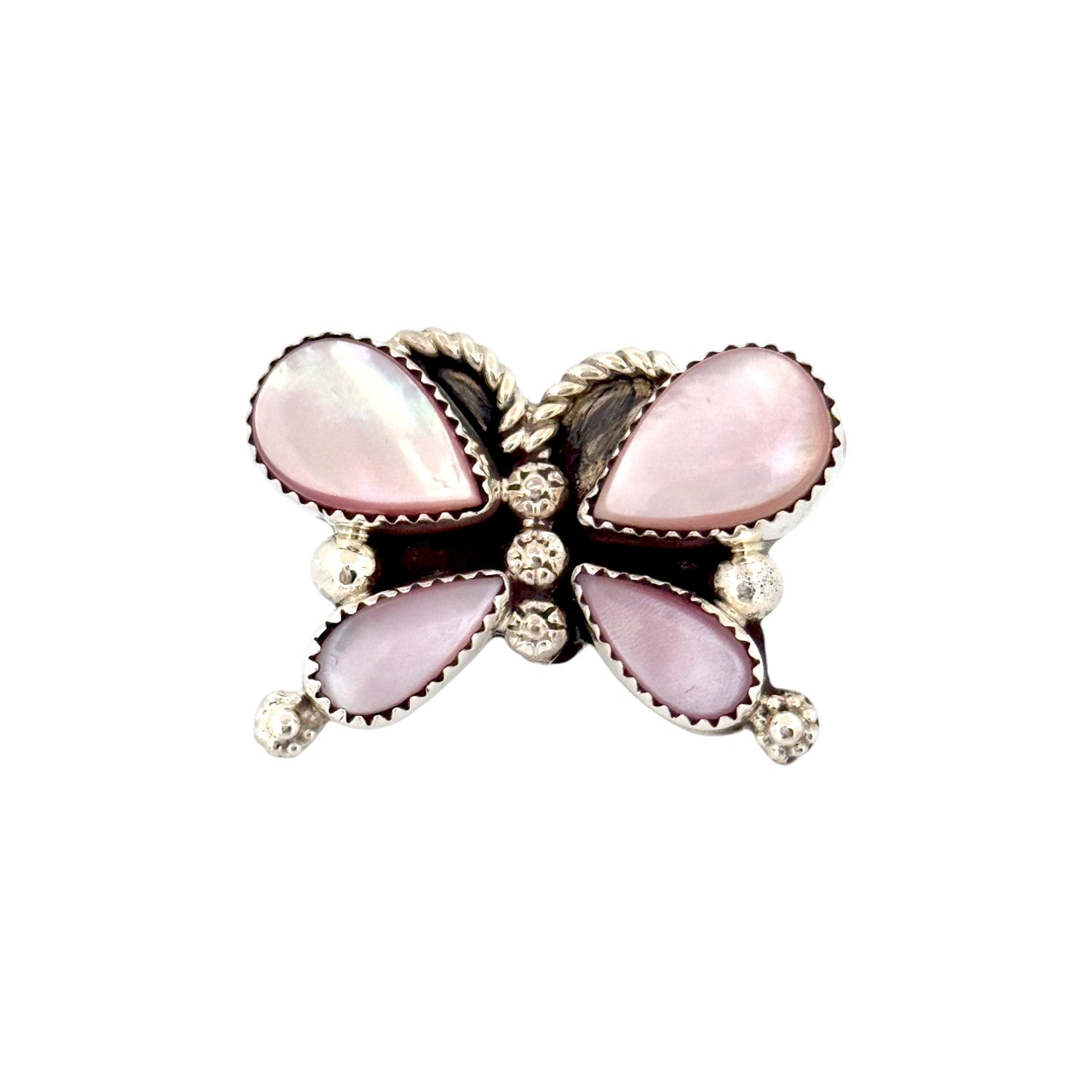 This charming Navajo ring by artist Darlene Begay is beautifully crafted in the shape of a butterfly, symbolizing transformation and renewal. The wings are inlaid with soft pink shell cabochons, each cut into teardrop shapes that radiate gentle, natural luster. Sterling silver details, including twisted rope accents and polished silver drops, bring balance and dimension to the design. The delicate pastel tones of the shell contrast gracefully with the gleaming silver, giving the piece an elegant yet playful character. Begay’s artistry highlights the harmony between nature-inspired forms and traditional Navajo silversmithing. This ring is both a statement of individuality and a wearable work of art.