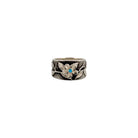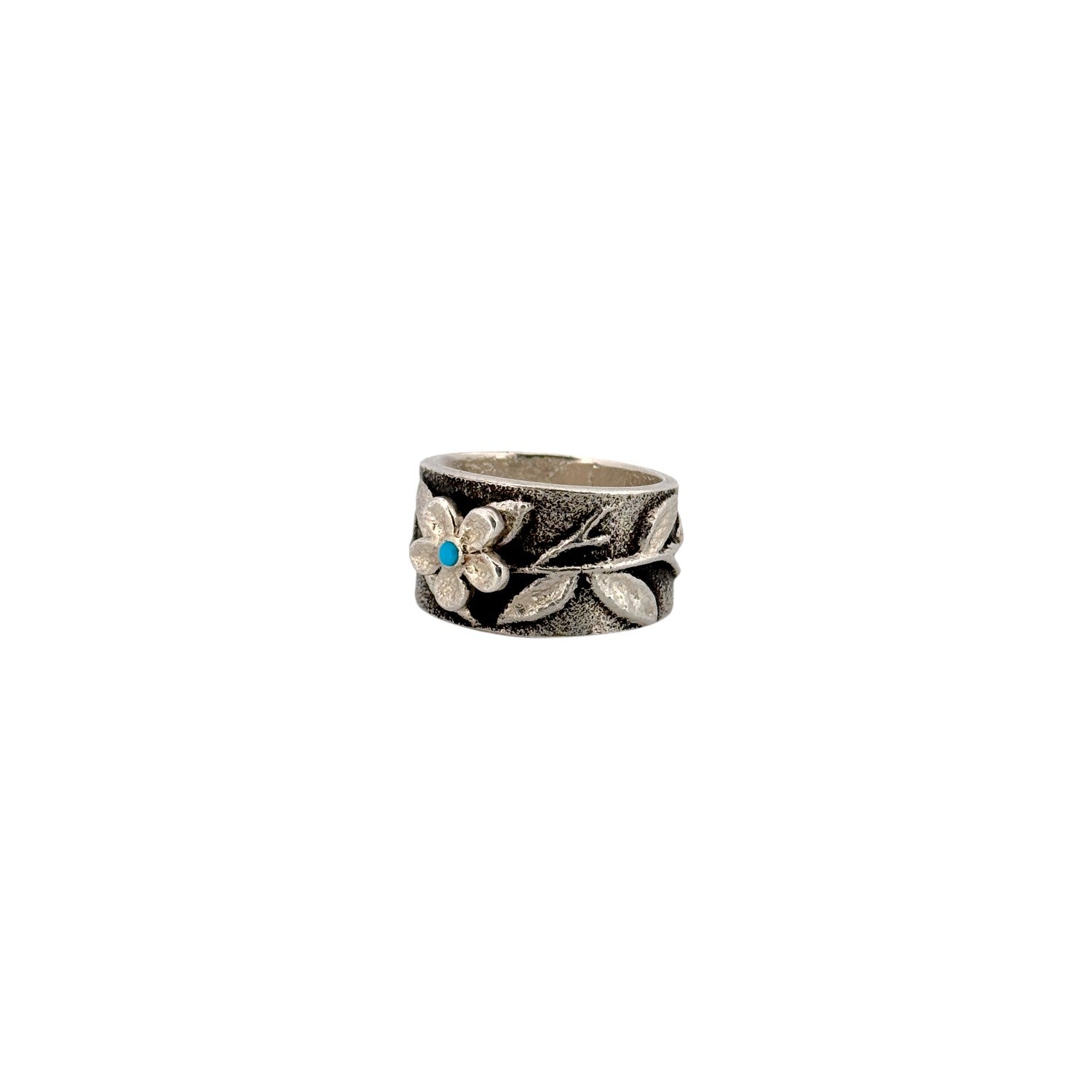 This Raymond Bitsoi ring is a beautifully crafted example of Navajo handmade sterling silver artistry. The wide silver band features a textured, oxidized finish that highlights its depth and character. At the center, a delicate floral design blossoms with hand-formed petals and leaves, showcasing intricate detail and balance. A vivid Sleeping Beauty turquoise stone rests in the heart of the flower, adding a bright pop of sky-blue color. Elegant yet grounded in tradition, this ring reflects timeless Southwestern craftsmanship with a graceful, feminine touch.