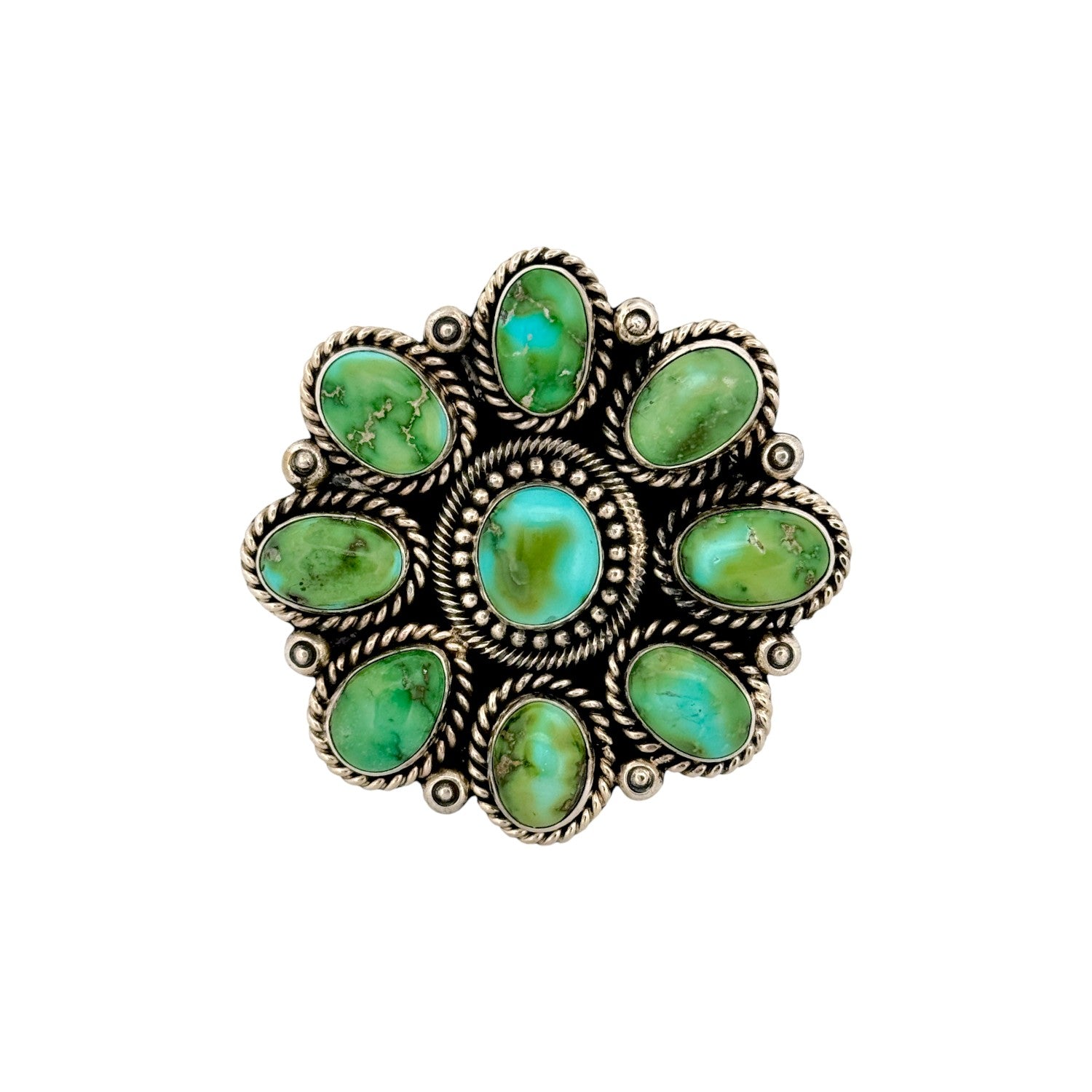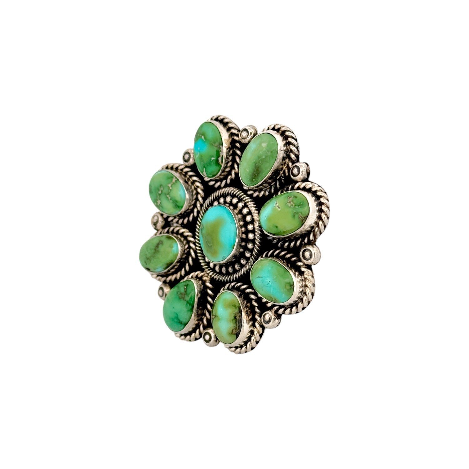 This Navajo handmade ring by Hemerson Brown features rich Sonoran turquoise set in finely crafted sterling silver. The classic cluster design showcases multiple turquoise cabochons, each displaying unique green and blue hues with natural matrix. Twisted rope bezels and silver bead accents add depth and texture to the traditional setting. The layered arrangement creates a bold yet balanced profile on the hand. Striking and authentic, this ring reflects Hemerson Brown’s skillful craftsmanship and Navajo silversmithing heritage.
