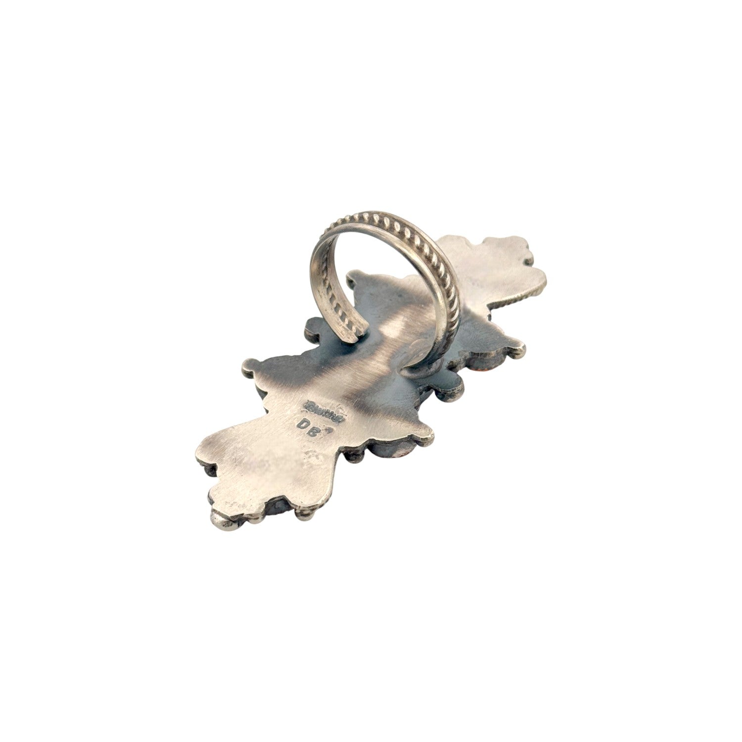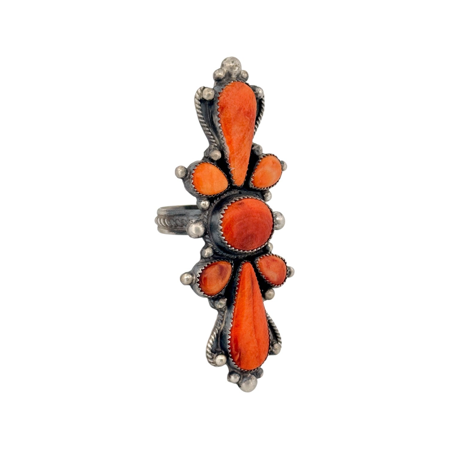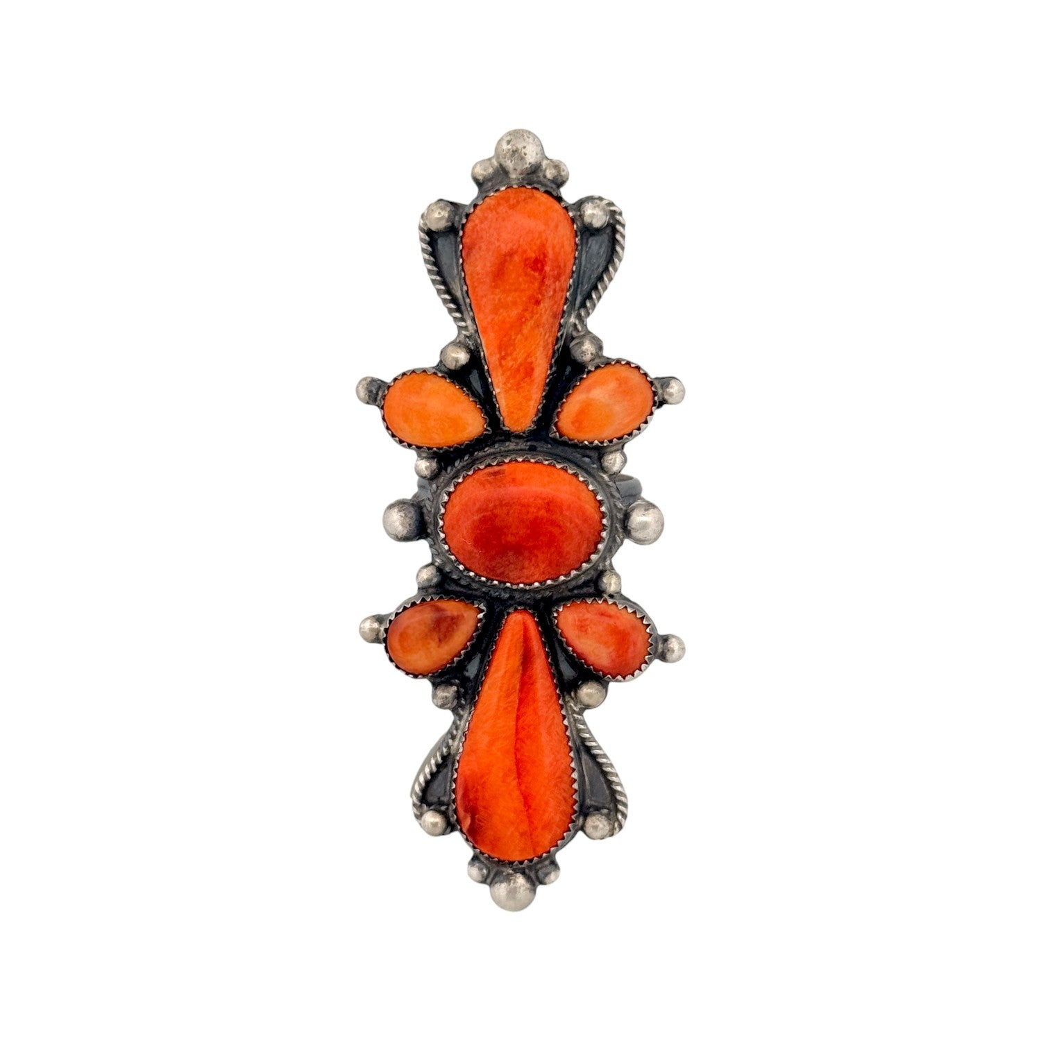This striking Dean Brown ring showcases vibrant spiny oyster shell set in hand-crafted sterling silver, embodying the bold elegance of traditional Navajo jewelry. The rich orange and red hues of the spiny oyster create a dramatic contrast against the darkened silver, drawing the eye to its intricate, symmetrical design. Each stone is carefully selected and individually set, reflecting the artist’s skill and attention to detail. The handcrafted silverwork adds texture and depth, giving the ring a powerful yet refined presence. Timeless and distinctive, this Navajo handmade ring is both a wearable work of art and a statement of Southwest heritage.