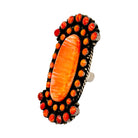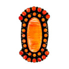 This bold and radiant ring by Navajo silversmith Devin Brown is a masterful celebration of color and craftsmanship. The elongated centerpiece features a luminous orange spiny oyster shell, framed by a halo of fiery red and orange spiny oyster cabochons. Each stone is carefully hand-set in oxidized sterling silver, creating a dramatic contrast that enhances the vivid tones of the shells. Brown’s signature attention to detail shines through in the precise silverwork and balanced composition, honoring the traditional Navajo cluster style with a contemporary flair. The ring’s elongated shape offers a striking presence, while its natural textures evoke the beauty of the Southwest landscape.