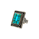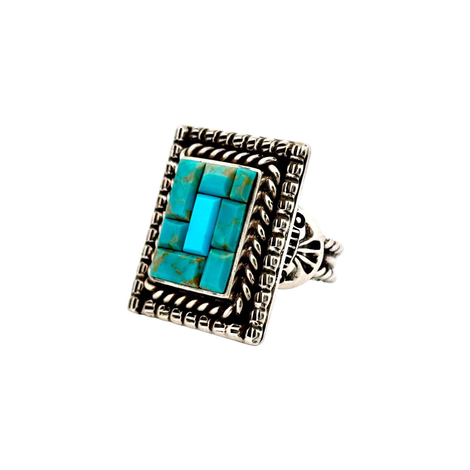 This striking ring is a Navajo handmade creation by silversmith Tom Bryon. Crafted from sterling silver, it features a bold rectangular face showcasing a finely arranged multi-stone inlay of turquoise in varied shades of blue and green with natural matrix. The geometric pattern of the inlay reflects both precision and artistry, creating a design that is at once contemporary and deeply rooted in Navajo tradition. Framing the stonework is a double border of twisted rope and stamped silver, adding texture and dimension. The oxidized background enhances the brilliance of the turquoise while giving the piece a classic Southwestern character. With its strong, structured design, this ring makes a confident statement on the