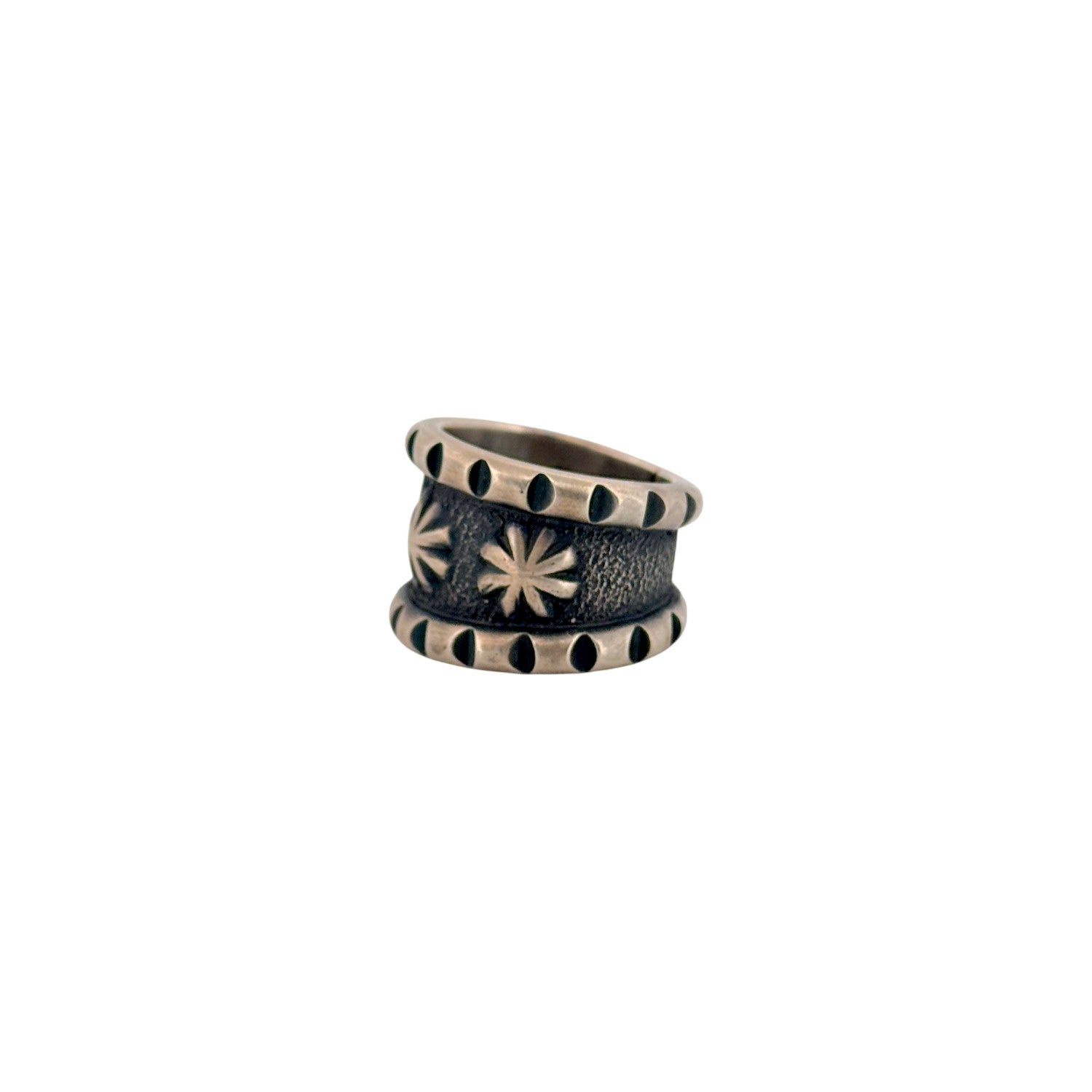 This bold Monty Claw ring is expertly handmade in sterling silver, showcasing the strength and precision of traditional Navajo silversmithing. The wide band features deeply stamped starburst motifs set against a darkened, textured background for striking contrast. Hand-cut detailing along the edges adds dimension and a refined finish to the design. Substantial yet comfortable, the ring makes a powerful statement while remaining timeless in style. Crafted with care and heritage, this piece reflects enduring Southwestern artistry.