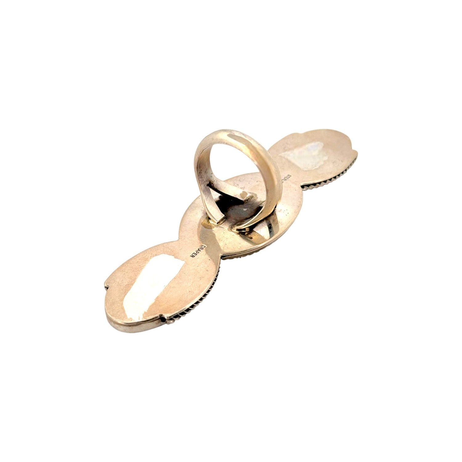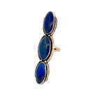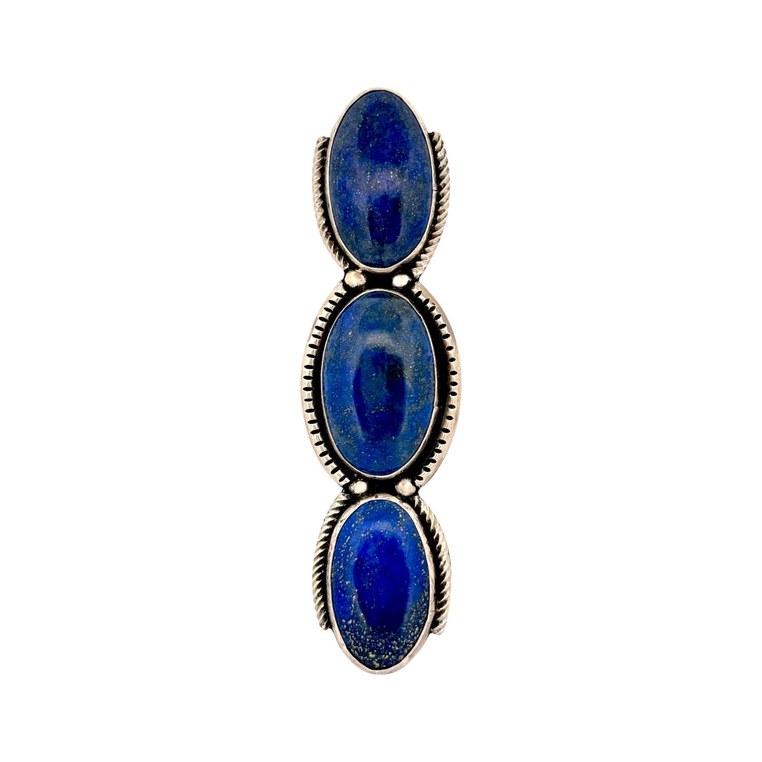 Joelias Draper’s handcrafted Navajo ring features three rich Lapis Lazuli stones, each showcasing deep blue hues with natural golden flecks. The stones are set in sterling silver with clean, traditional bezels that highlight their elegant oval shapes. Draper’s precise silversmithing creates a balanced, vertical design that is both bold and refined. Subtle silverwork details frame the stones, enhancing their natural beauty without overwhelming the composition. This piece embodies timeless Navajo artistry, blending simplicity, symmetry, and the striking power of Lapis Lazuli.