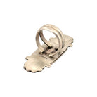 This handcrafted ring by Navajo artist Chris Etsitty captures the vibrant beauty of spiny oyster shell in a bold, rectangular design. The stone radiates with a fiery blend of orange, coral, and subtle purple hues, evoking the warm tones of a desert sunset. Etsitty sets the shell in a finely detailed sterling silver bezel, surrounded by a hand-twisted rope border and framed with traditional stamped fans and beadwork. The balance of symmetry and texture reflects the artist’s mastery of Navajo silversmithing. Each detail, carefully shaped and polished, adds depth and dimension to the ring’s overall presence.