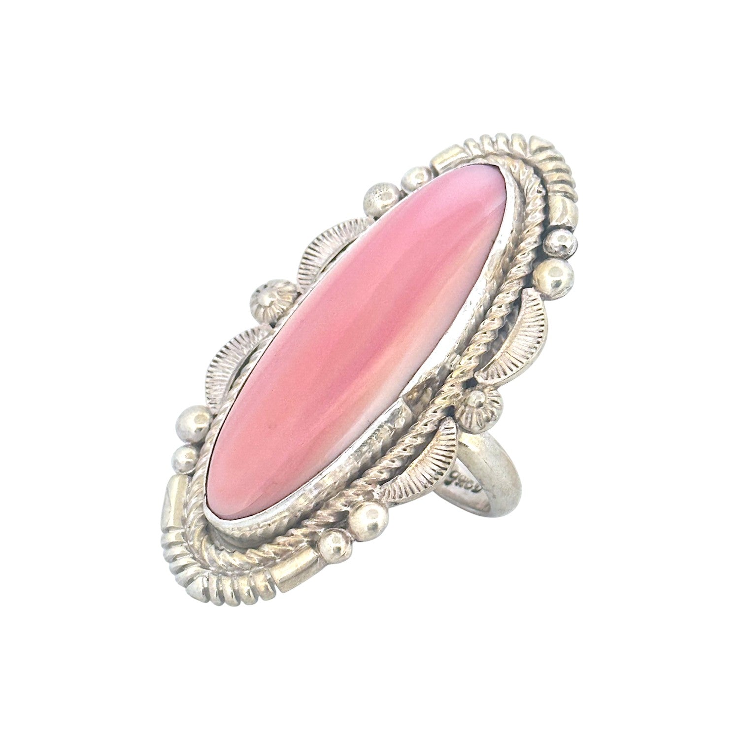 This exquisite Navajo ring by artist Fred Francis features a striking elongated oval pink conch shell set in sterling silver. The shell displays soft blush to rose-pink tones with a smooth, polished surface that radiates natural elegance. Surrounding the cabochon is an intricate silver frame with twisted rope accents, scalloped stampwork, and polished silver drops, all hallmarks of traditional Navajo silversmithing. The detailed silverwork enhances the gentle beauty of the shell while adding depth and texture to the design. Francis’ craftsmanship blends cultural tradition with refined artistry, making this piece both timeless and unique. Its elongated shape creates a graceful presence on the hand, perfect for those who love bold yet feminine jewelry.