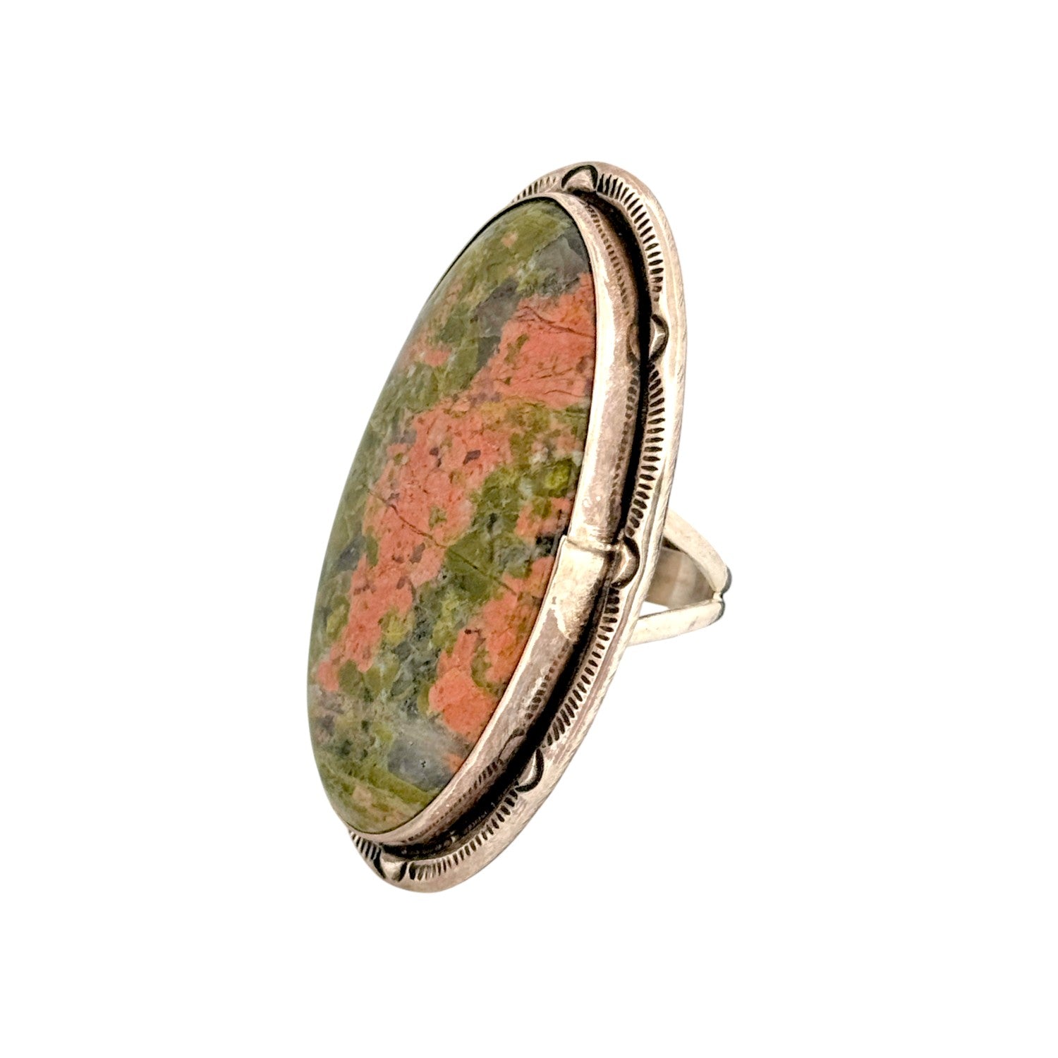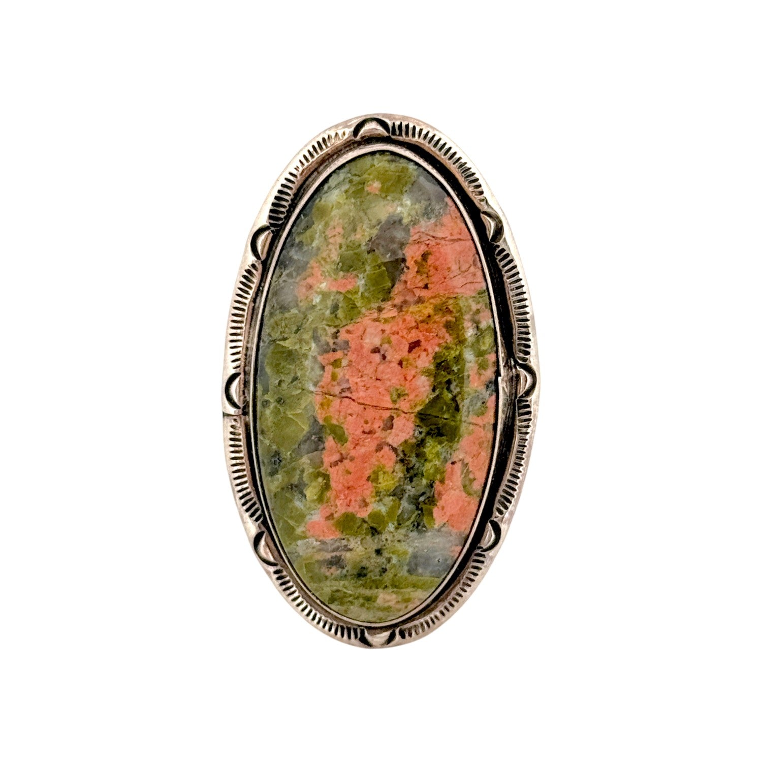 This stunning ring by Navajo artist Steeve Francisco highlights a bold Unakite gemstone, celebrated for its earthy blend of green epidote and pink feldspar tones. The large, oval stone is set in a finely crafted sterling silver bezel, accented with hand-stamped details that reflect traditional Navajo artistry. The natural color play within the Unakite evokes the rugged beauty of desert landscapes and mountain stone. Steeve Francisco’s expert silversmithing enhances the stone’s organic charm, balancing strength with elegance. Each ring is individually handmade, ensuring no two pieces are alike.