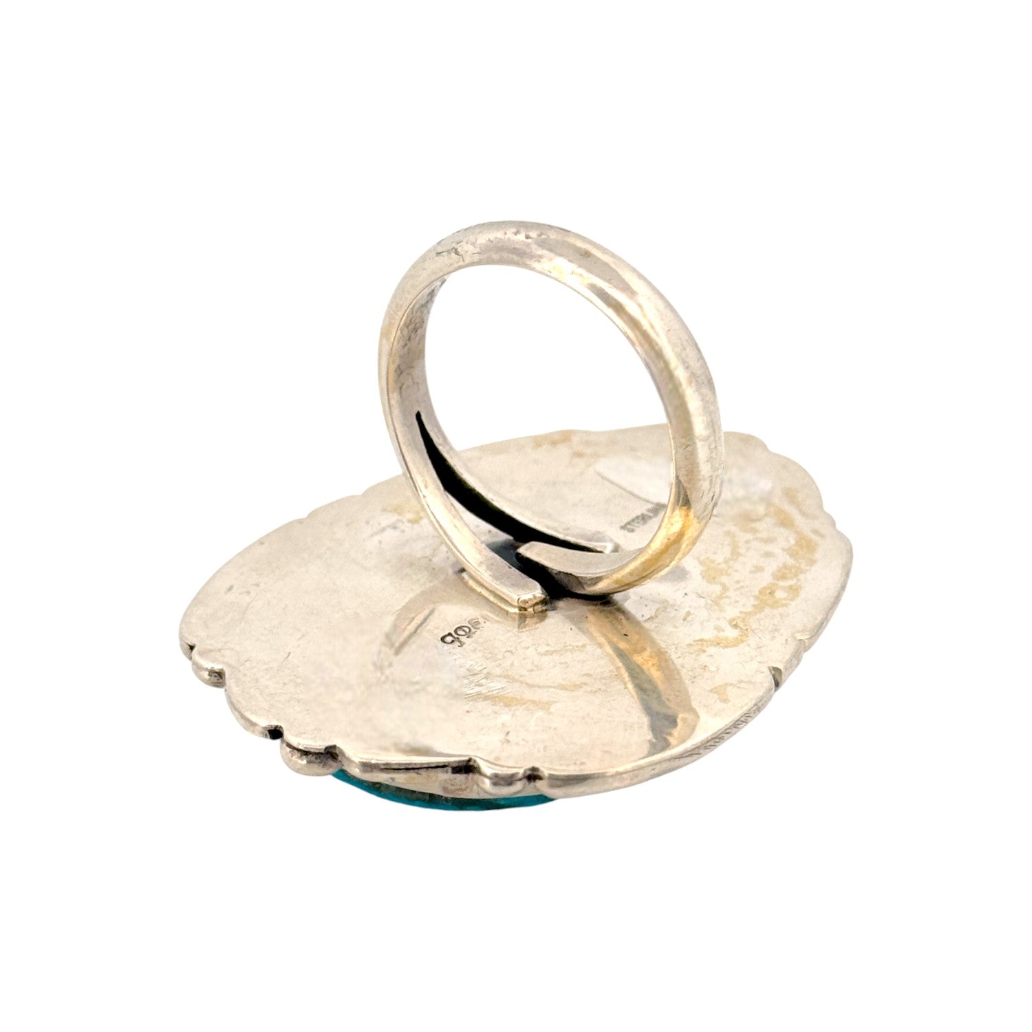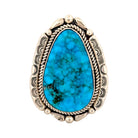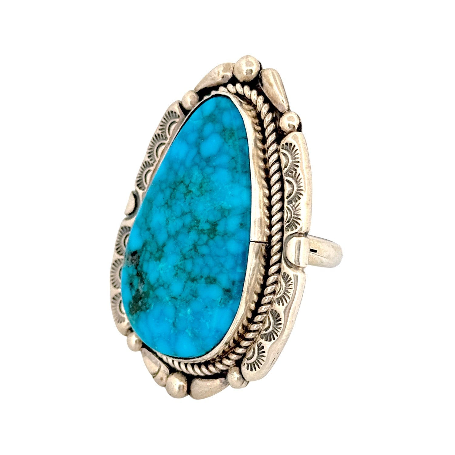 This remarkable ring by Navajo artist Fred Francis showcases a vibrant Water web Kingman turquoise stone, prized for its bright blue color interlaced with a fine, natural webbing pattern. Set in sterling silver, the teardrop-shaped stone is framed by a twisted rope bezel and surrounded by hand-stamped details and silver beadwork, reflecting the artistry of traditional Navajo design. The craftsmanship is both bold and refined, emphasizing the stone’s natural beauty while adding depth and dimension through intricate silverwork.