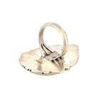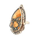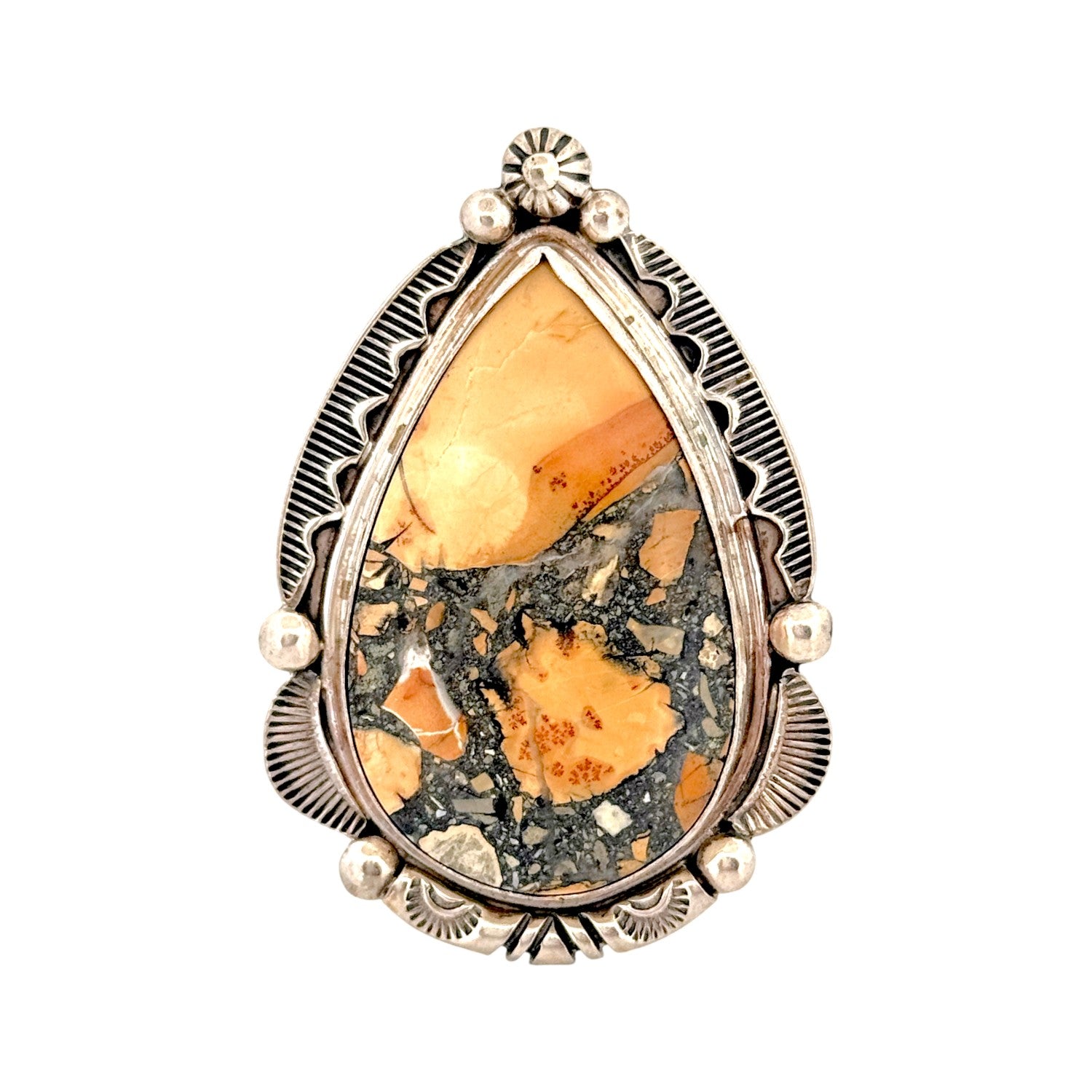 This stunning ring by Navajo artist Fred Francis features a captivating jasper stone, showcasing earthy tones of golden tan, amber, and deep gray that evoke the rugged beauty of the desert landscape. Set in finely crafted sterling silver, the teardrop-shaped stone is framed by hand-stamped designs, scalloped edges, and silver bead accents, all hallmarks of traditional Navajo silversmithing. The intricate silverwork enhances the jasper’s natural patterns, creating a perfect balance of texture and color. Fred Francis’s artistry reflects both reverence for the land and mastery of form, producing a piece that feels timeless and grounded.