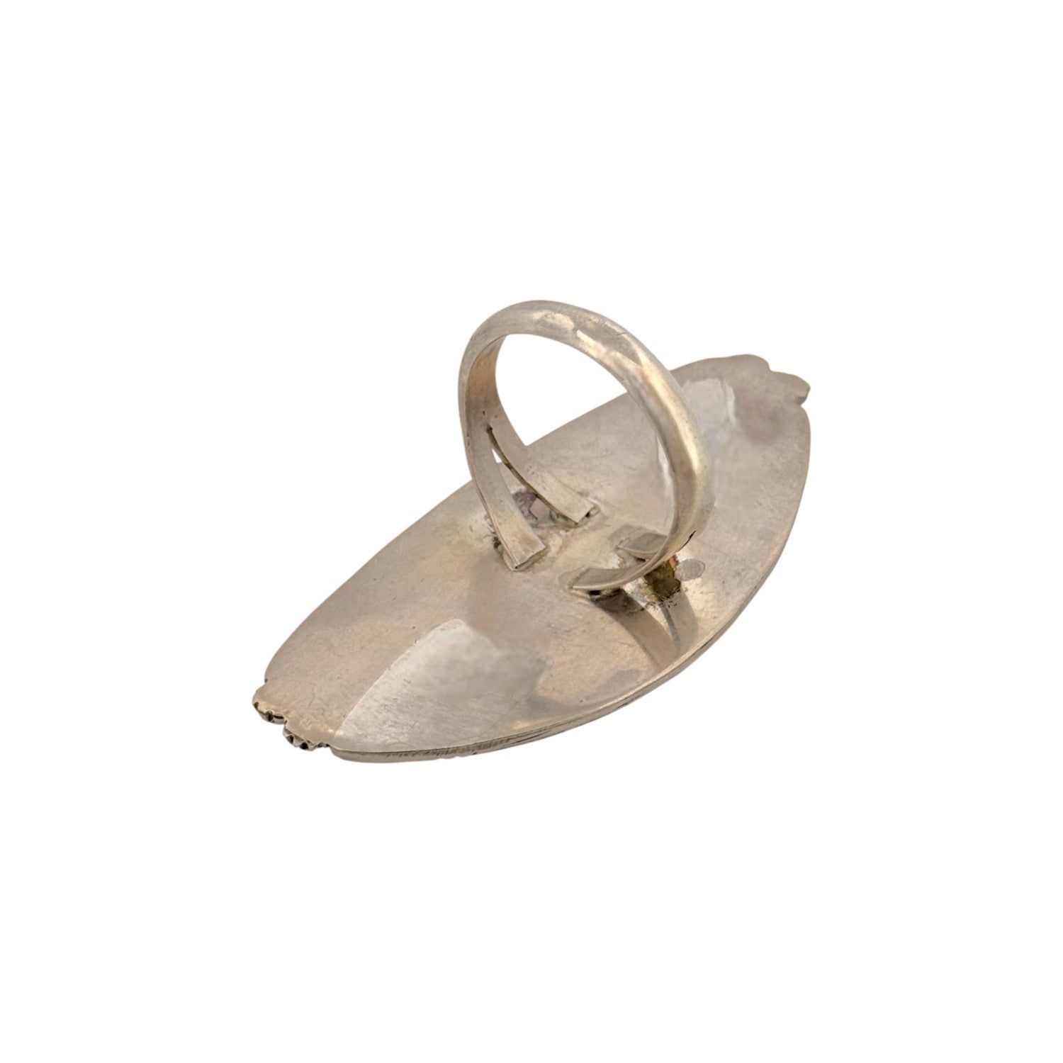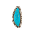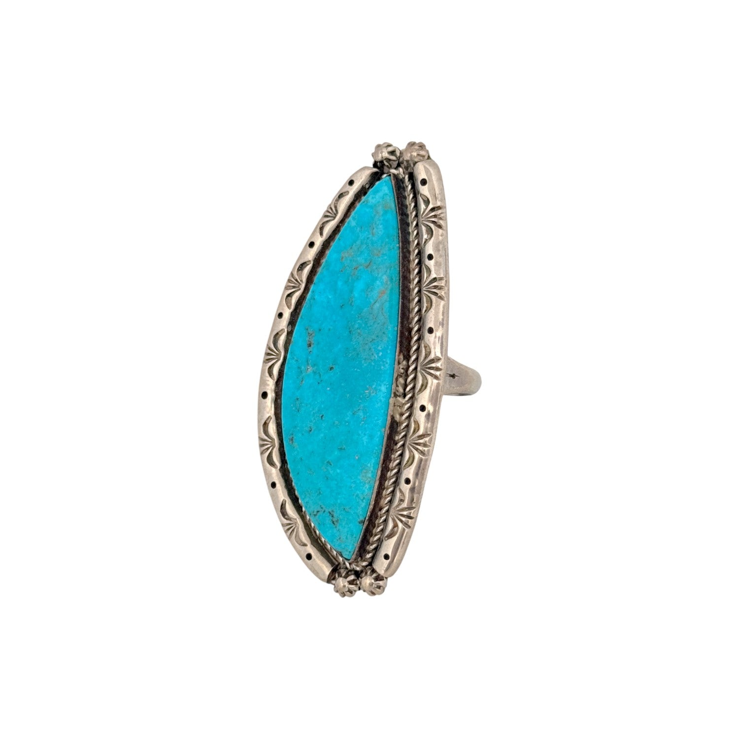 This Navajo handmade ring by Fred Francis features a striking Kingman turquoise stone with rich blue color and subtle natural matrix. Set in solid sterling silver, the elongated cabochon is framed by finely detailed hand-stamped designs and twisted wire accents. The sleek, tapered shape creates an elegant silhouette while highlighting the stone’s natural beauty. Expert craftsmanship and balanced proportions reflect Fred Francis’s refined approach to traditional Navajo silversmithing. A timeless statement ring, it’s perfect for collectors and admirers of authentic Native American turquoise jewelry.