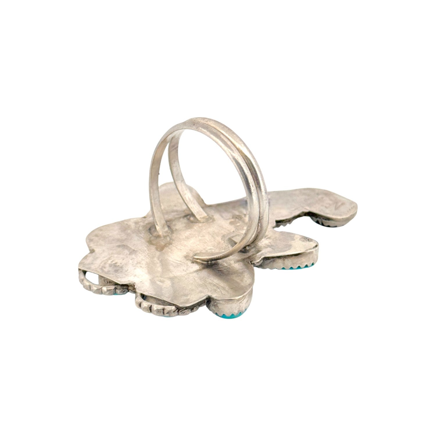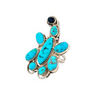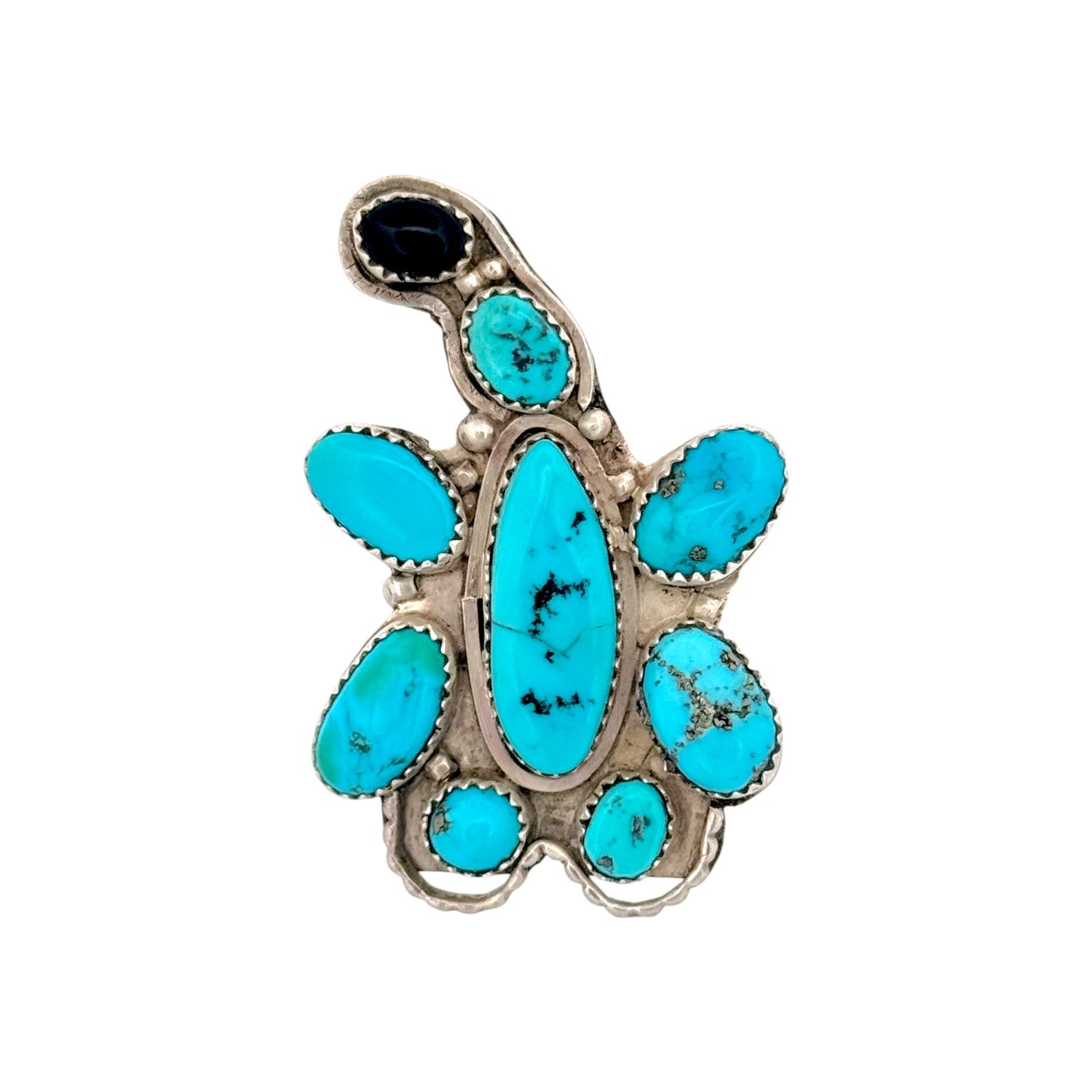This vintage Navajo handmade ring, signed with the NE hallmark and crafted circa 1990s, features a striking combination of Sleeping Beauty turquoise and black onyx set in sterling silver. Designed in a distinctive turtle motif, the piece showcases seven vivid turquoise stones arranged to form the body, contrasted beautifully by a single deep black onyx stone at the head. Each gemstone is set in a hand-cut serrated bezel, enhancing its natural brilliance and character. The silverwork includes smooth bezels and subtle oxidized accents, lending depth and dimension to the design. The bright blue hues of the Sleeping Beauty turquoise reflect purity and protection, while the onyx adds grounding balance. Both whimsical and symbolic, this ring captures the harmony of traditional Navajo artistry and natural beauty.