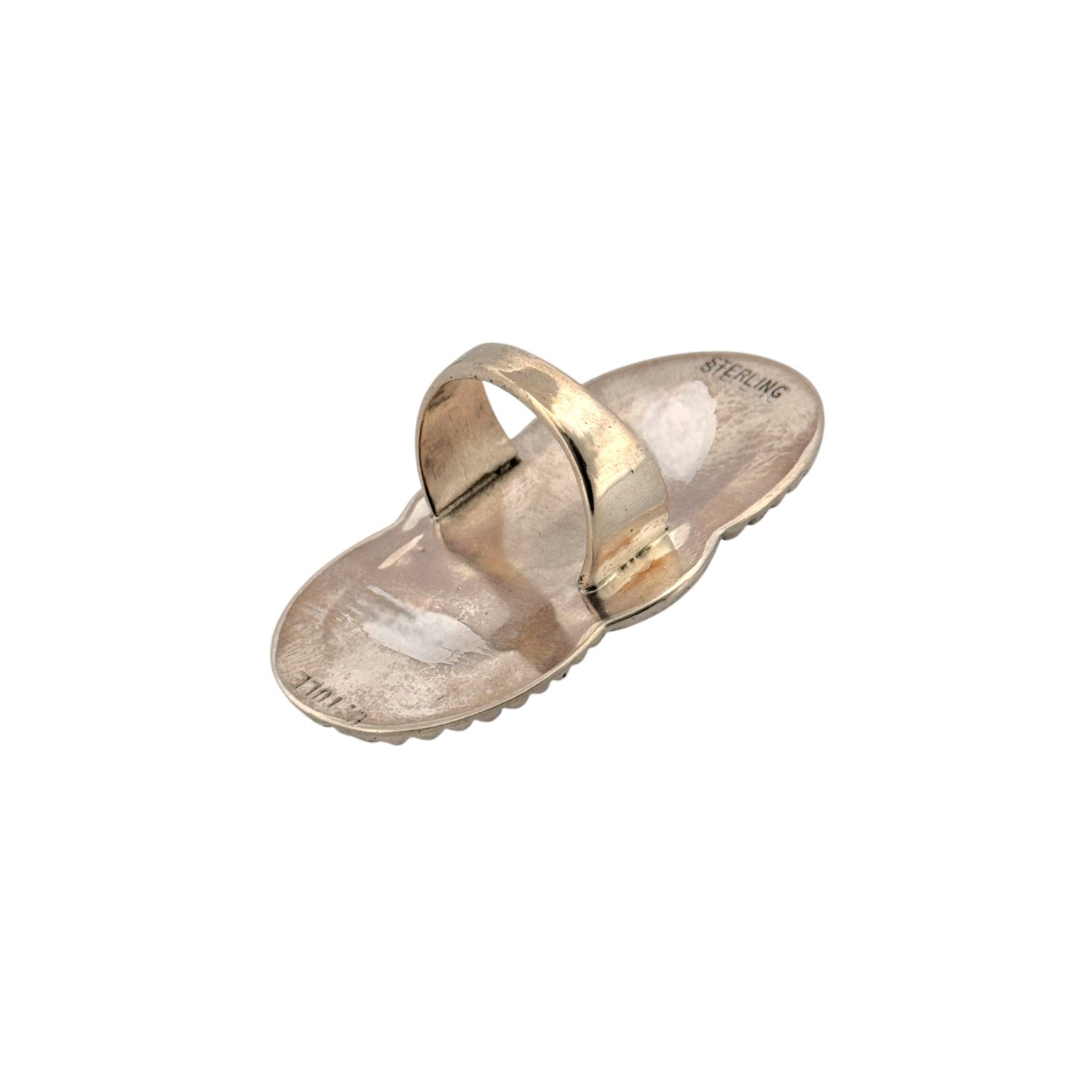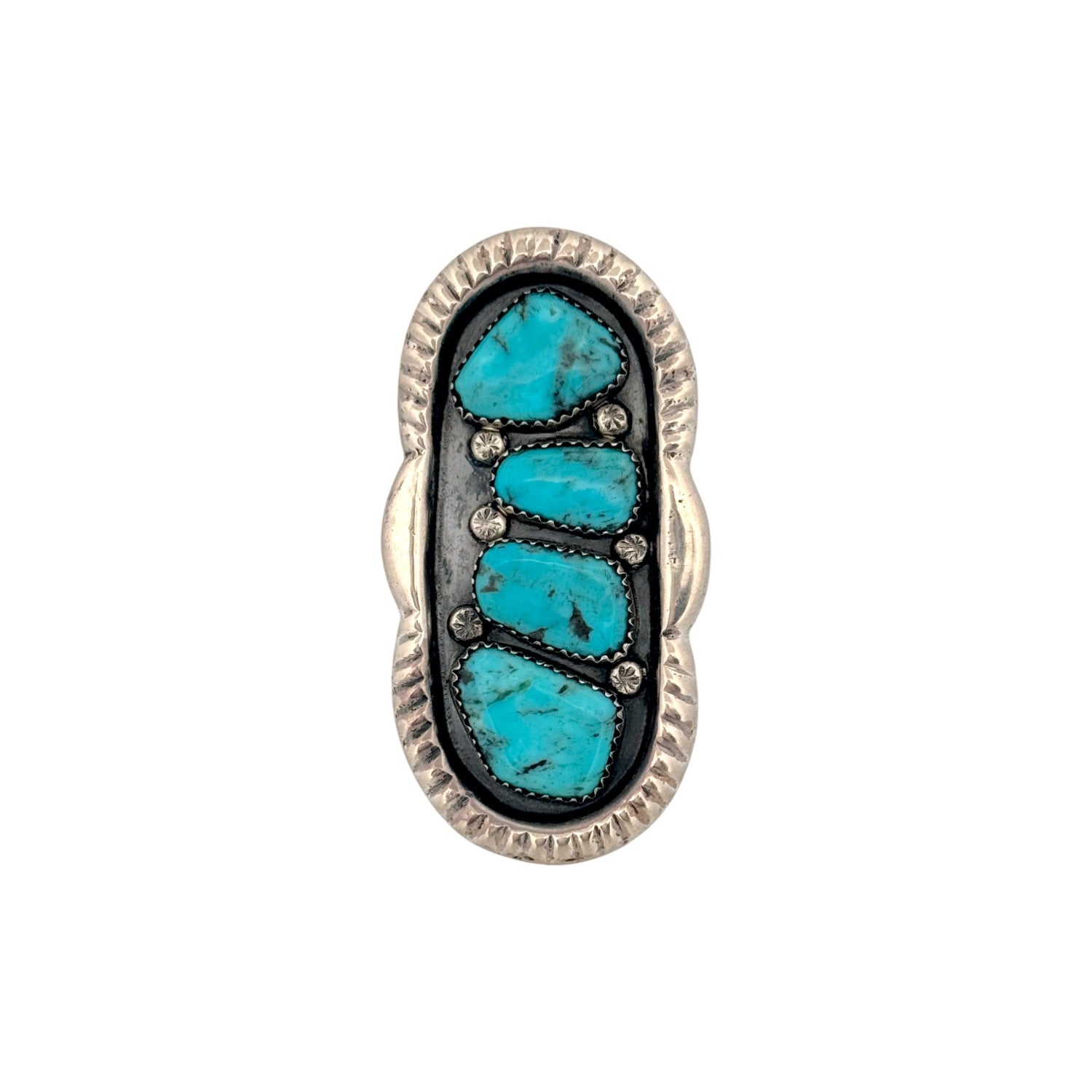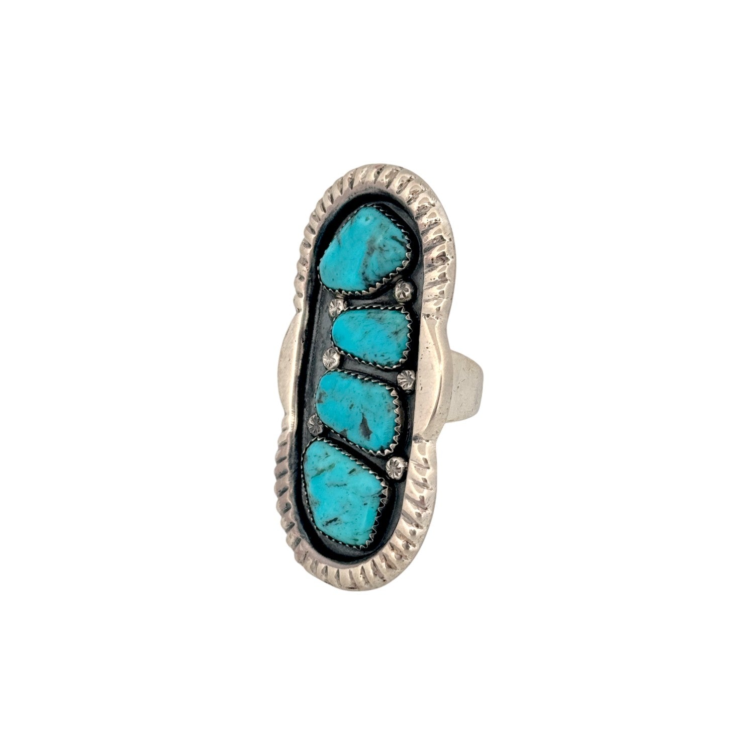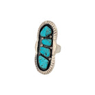 This Zuni handmade ring by Wilbur Iule features striking Nevada Blue turquoise stones arranged in a dynamic vertical composition. Set in solid sterling silver, the vivid blue stones display natural matrix that adds depth and character to the design. The traditional Zuni setting highlights precise stonework and clean silver detailing. Balanced proportions and careful craftsmanship reflect Iule’s skill and dedication to classic Zuni jewelry traditions. A bold yet refined ring, it’s a beautiful addition for collectors and admirers of authentic Native American turquoise jewelry.