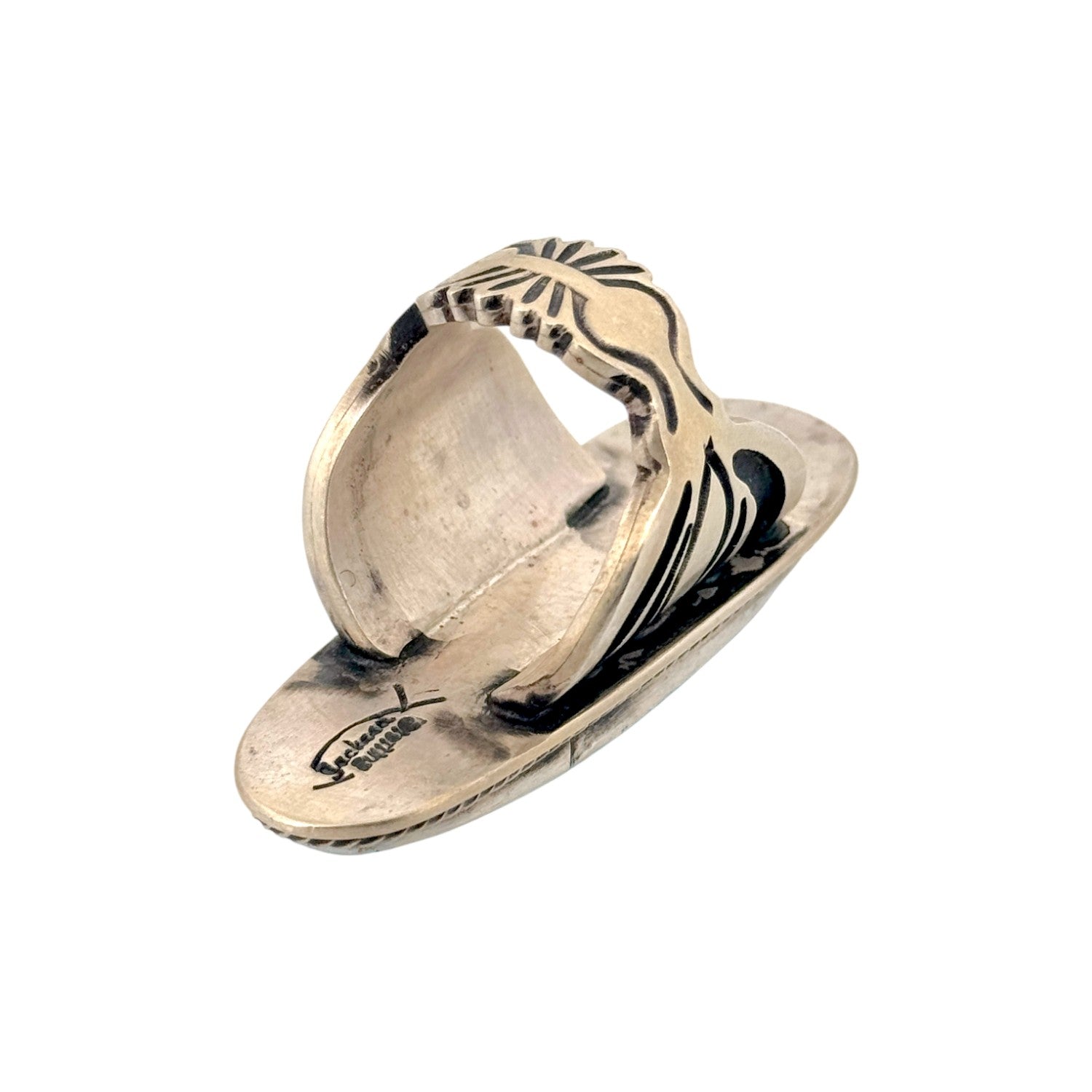 This Navajo handmade ring by renowned silversmith Tommy Jackson features a striking Persian turquoise stone set in sterling silver. The elongated oval cabochon displays a vibrant sky-blue hue accented with a delicate golden-brown matrix, showcasing the high quality and beauty of Persian turquoise. A finely twisted rope border frames the stone, adding dimension and classic Navajo detailing. The wide, split-shank band provides balance and comfort while emphasizing the ring’s bold, elegant design. Tommy Jackson’s masterful craftsmanship blends traditional Navajo artistry with refined modern style.