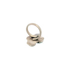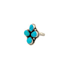 This handmade Navajo ring by Natasha James features a graceful cluster of Kingman turquoise stones set in sterling silver. The four stones form a soft floral shape, each displaying bright blue tones with natural matrix that adds individuality and charm. Smooth silver bezels frame the turquoise, while small silver bead accents provide subtle dimension and balance. The darkened background enhances the vivid color of the stones, giving the piece depth and classic Southwestern appeal. Elegant and easy to wear, this ring is a lovely example of traditional Navajo cluster design with timeless beauty.