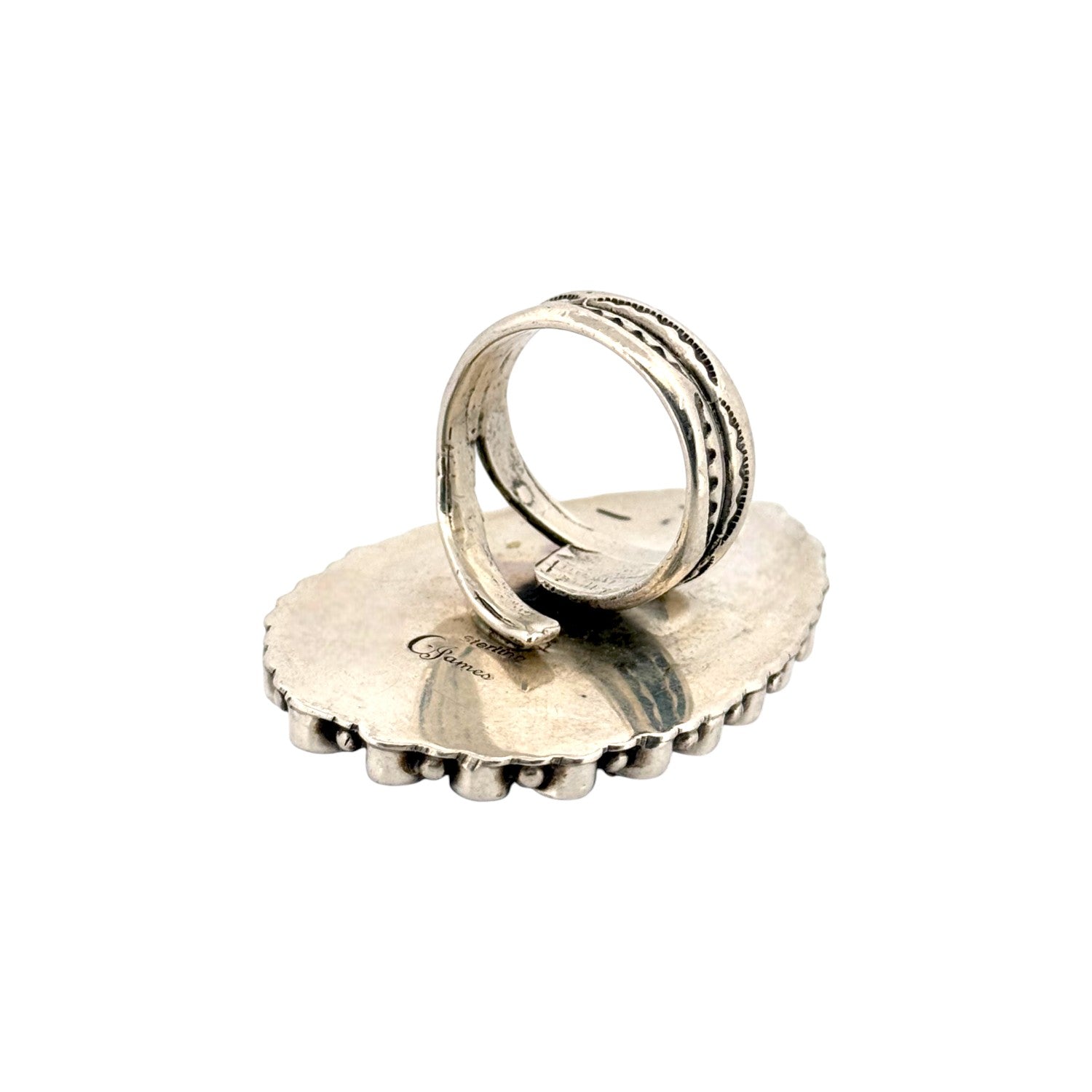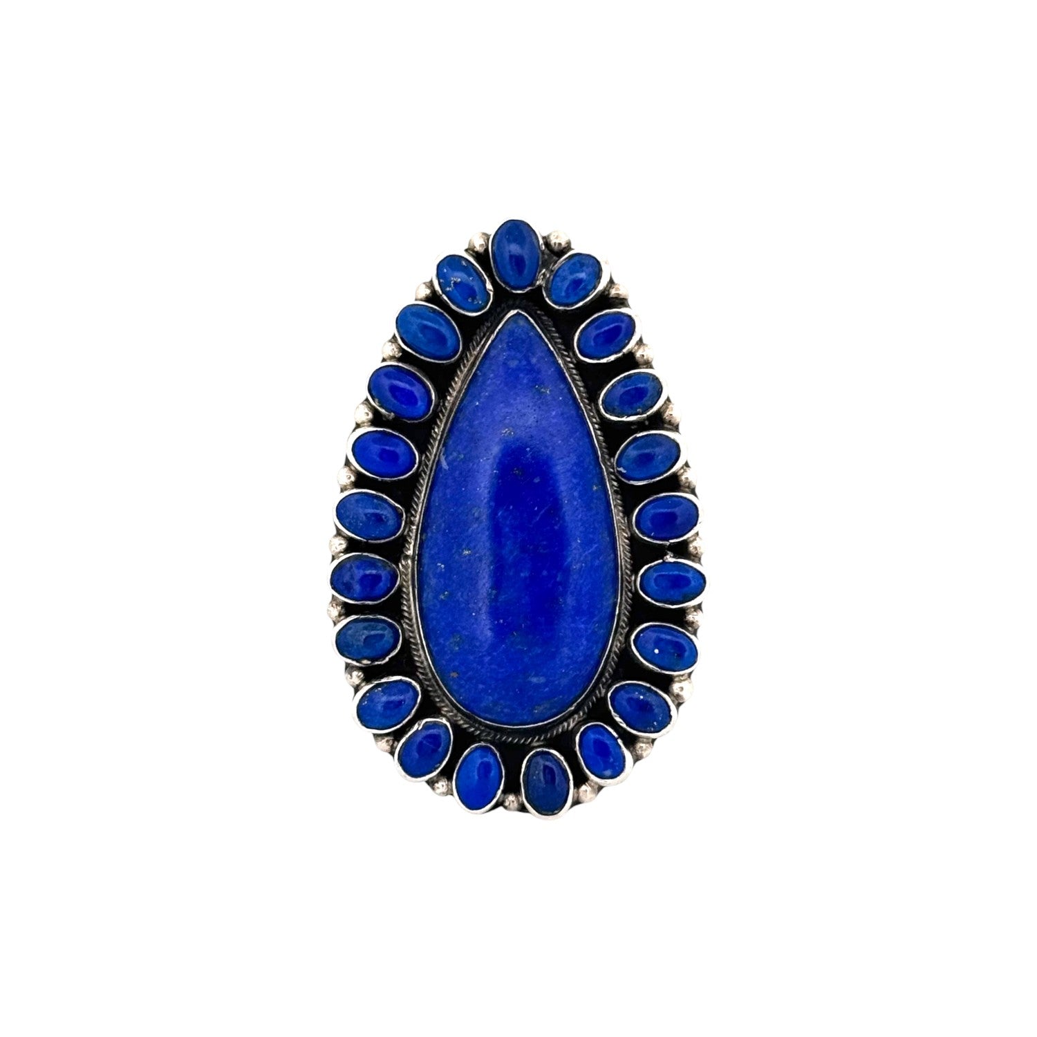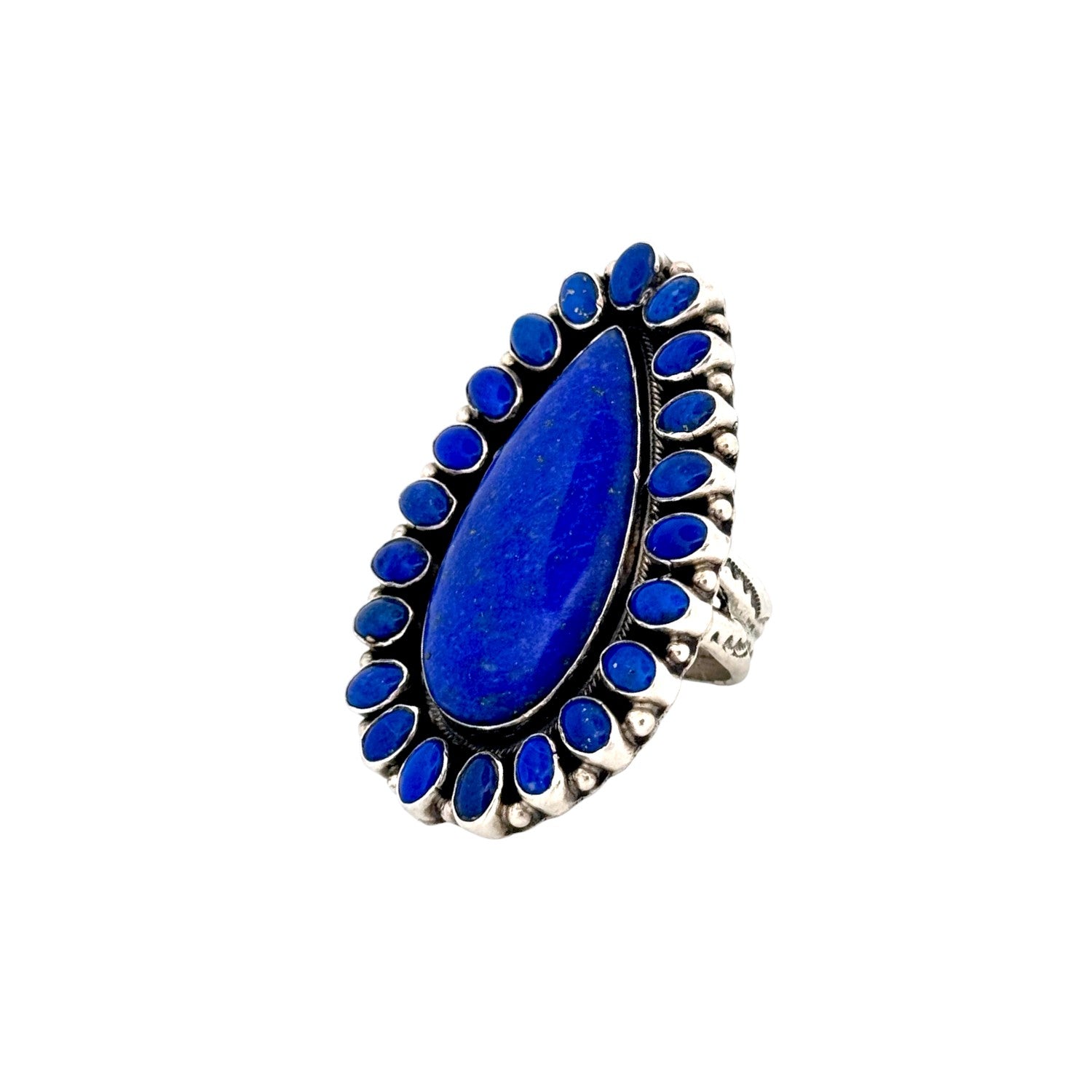 This exquisite Navajo ring by artisan Geraldine James is a stunning showcase of traditional craftsmanship and design. Handmade from sterling silver, it features a large teardrop-shaped Lapis Lazuli stone at its center, radiating a deep royal blue with natural flecks of golden pyrite. Surrounding the centerpiece are meticulously set oval lapis stones, forming a bold cluster pattern that enhances the ring’s brilliance and presence. The silverwork includes fine rope detailing around the central stone, adding texture and balance to the design. Its elongated shape gives it a striking elegance, making it a true statement piece. Steeped in cultural artistry, this ring embodies both the beauty of natural stone and the skilled silversmithing of the Navajo tradition.