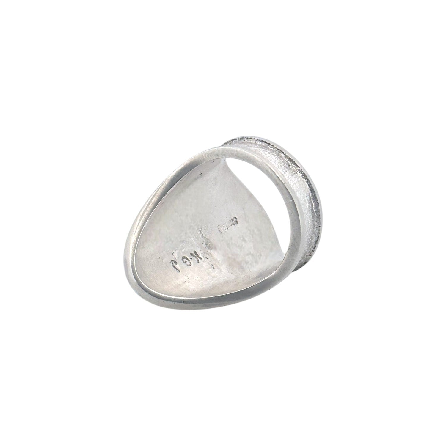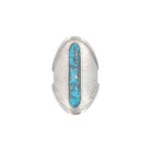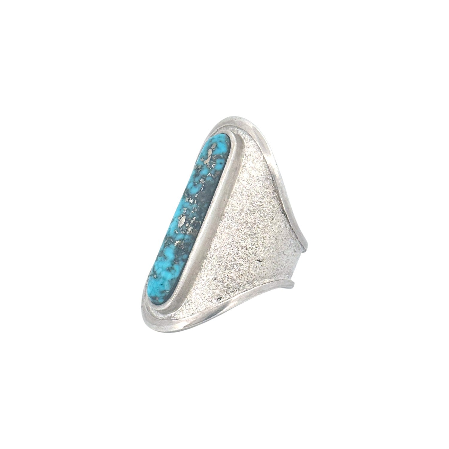 This sleek Navajo ring by artist Kelsey Jimmie features a striking inlay of Persian turquoise set in sterling silver. The elongated turquoise stone displays a vibrant blue hue with delicate matrix patterns, creating a refined and timeless look. Its modern, streamlined silver setting is designed with smooth contours that frame the stone beautifully, blending traditional craftsmanship with contemporary style. The textured silver adds depth and contrast, allowing the turquoise to stand out as the centerpiece. Jimmie’s artistry reflects the precision and skill of Navajo silversmithing, honoring heritage while embracing clean, elegant design. Comfortable to wear yet bold in presence, this ring makes a versatile statement piece.