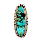 This exceptional ring by Navajo silversmith Harold Joe features a striking Nevada Blue turquoise stone rich with deep black matrix and vivid sky-blue hues. The elongated oval cut highlights the stone’s natural beauty and unique webbing patterns, reminiscent of desert skies over rugged canyon landscapes. Joe sets the turquoise in a smooth sterling silver bezel bordered with hand-stamped details and silver drop accents at each end. The finely tooled edges and traditional motifs reflect the artist’s mastery of Navajo silversmithing. Bold yet refined, this ring carries both the strength and elegance characteristic of handcrafted Native jewelry.