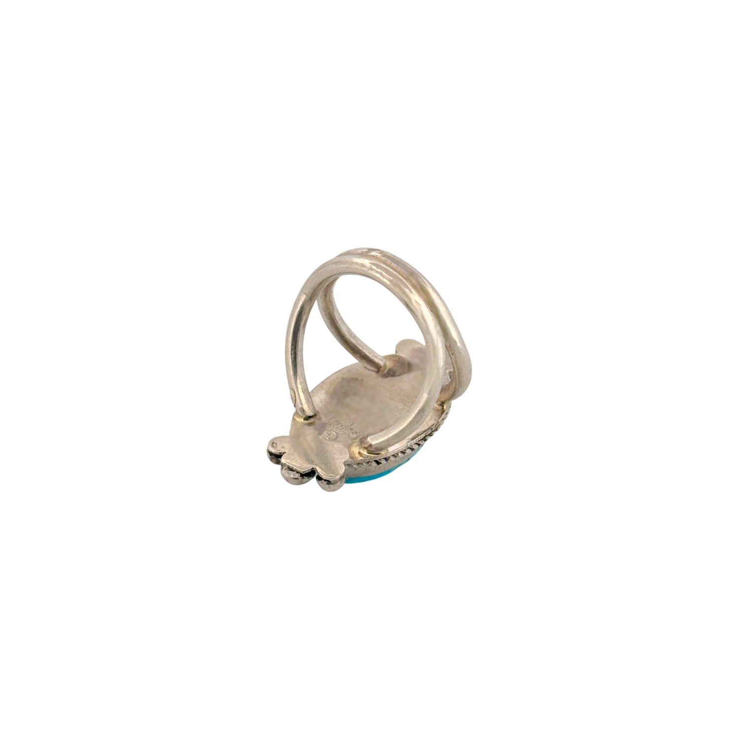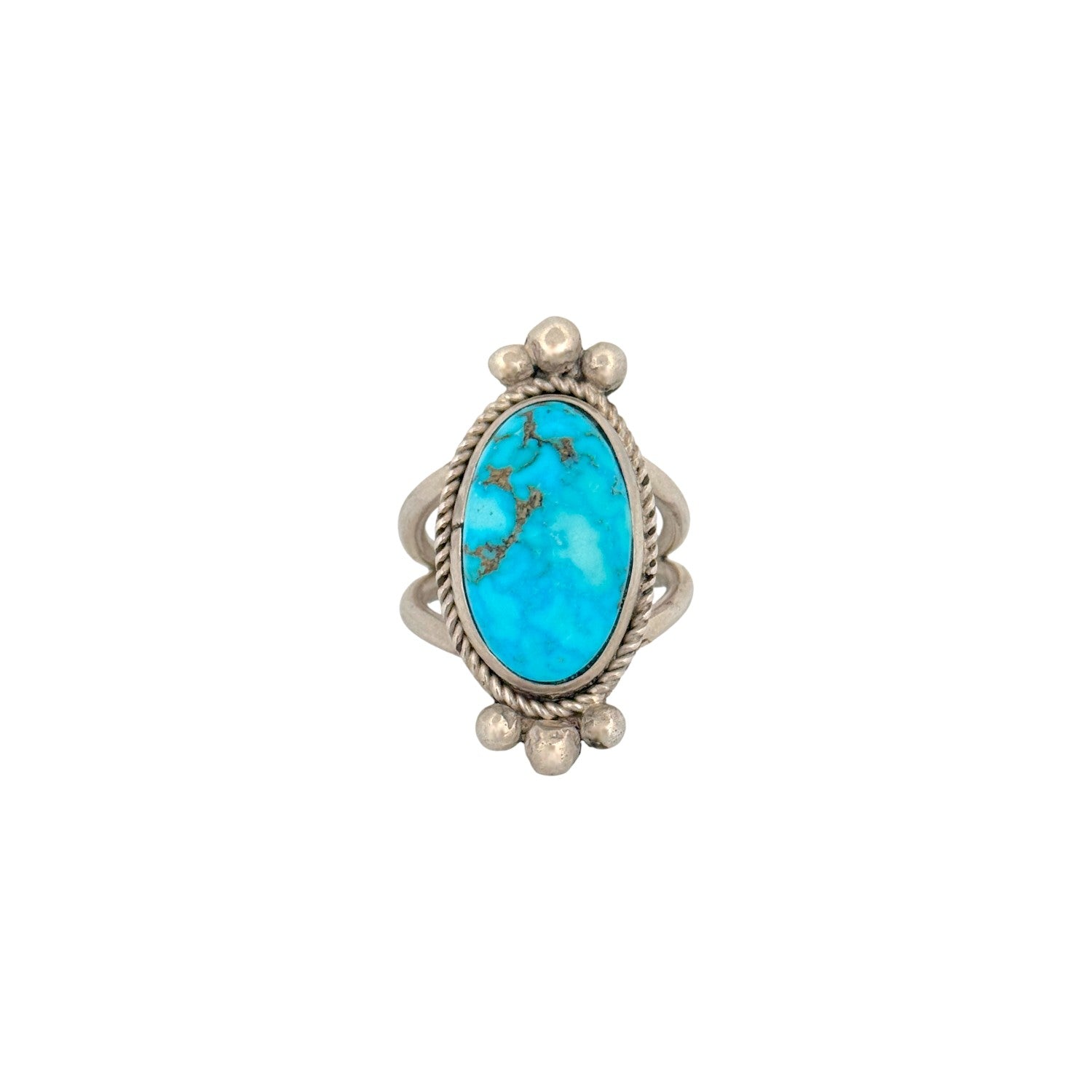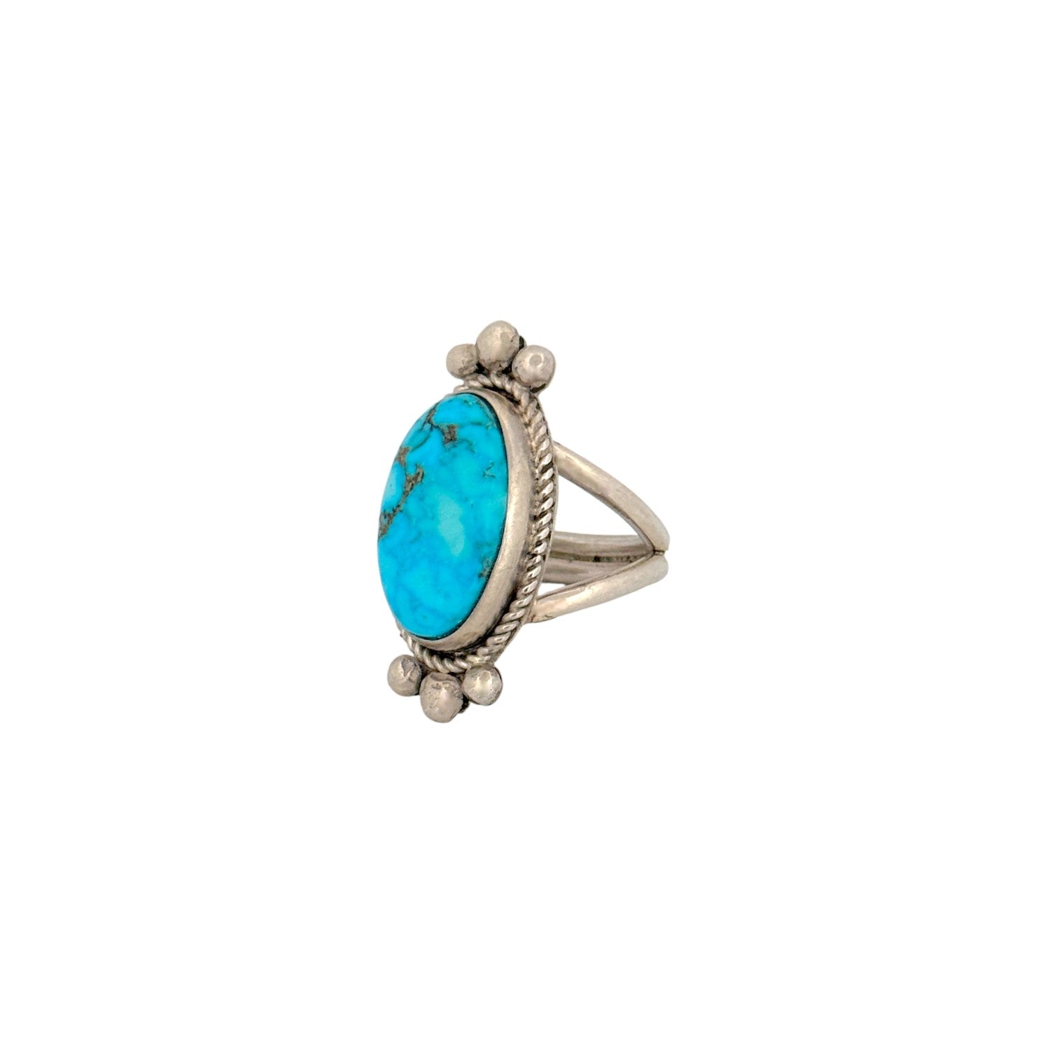 This handmade Navajo ring by John Delvin showcases a striking Water web Kingman turquoise stone set in sterling silver. The elongated oval turquoise features vivid sky-blue tones with delicate webbed matrix that adds natural character and depth. A twisted rope bezel frames the stone, while rounded silver bead accents at the top and bottom give the piece a classic Southwestern touch. The split double band provides balance and comfort while enhancing the ring’s bold vertical presence. Eye-catching yet timeless, this ring is a beautiful example of traditional Navajo craftsmanship and enduring style.