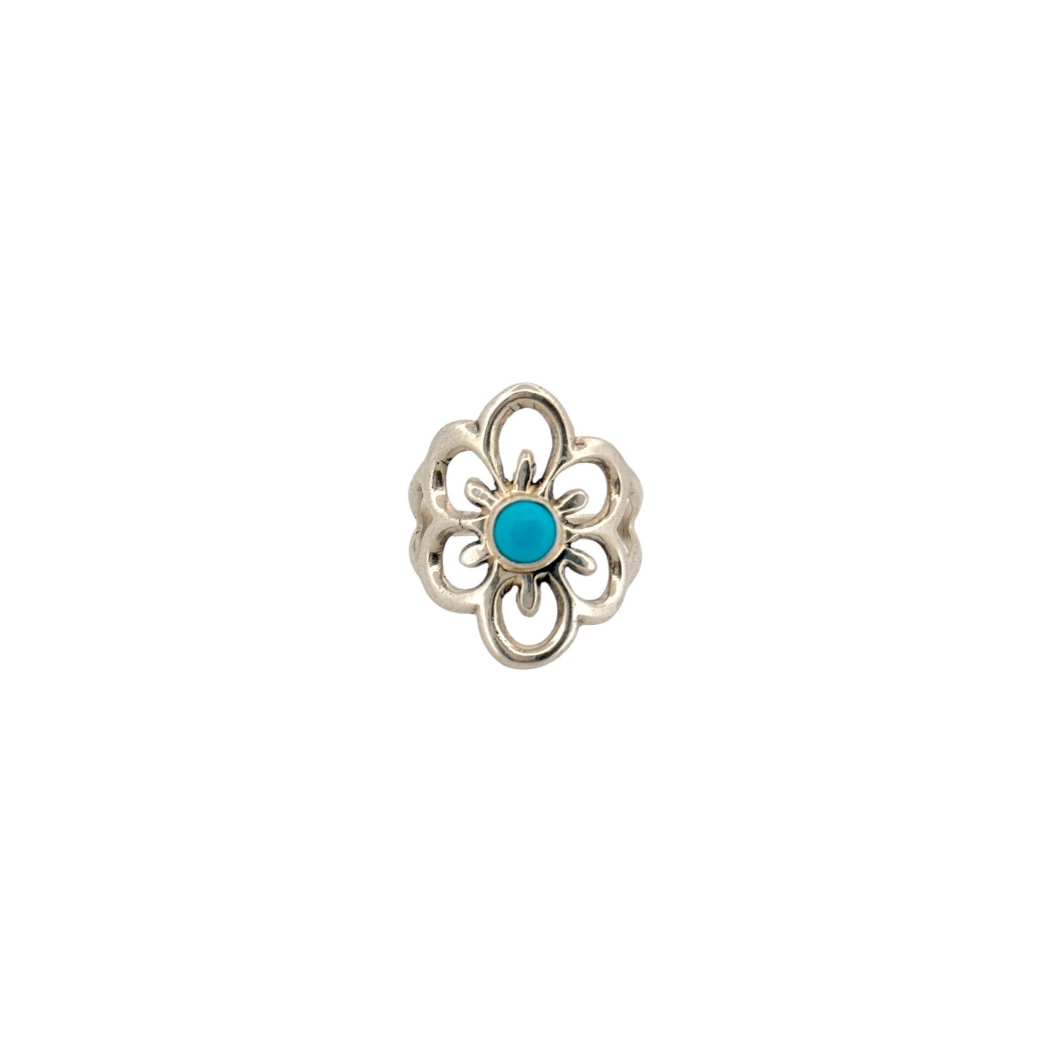 This Navajo handmade ring by Isabelle Kee features a vivid Sleeping Beauty Turquoise stone set at the center of an elegant openwork design. The turquoise displays the prized clear sky-blue color that makes this stone so iconic and timeless. Flowing sterling silver shapes form a floral-inspired motif around the stone, giving the ring a graceful sense of movement. The polished silver contrasts beautifully with the bright turquoise, highlighting the clean lines and skilled craftsmanship. Light, feminine, and versatile, this ring is a charming blend of traditional Navajo artistry and classic Southwestern style.